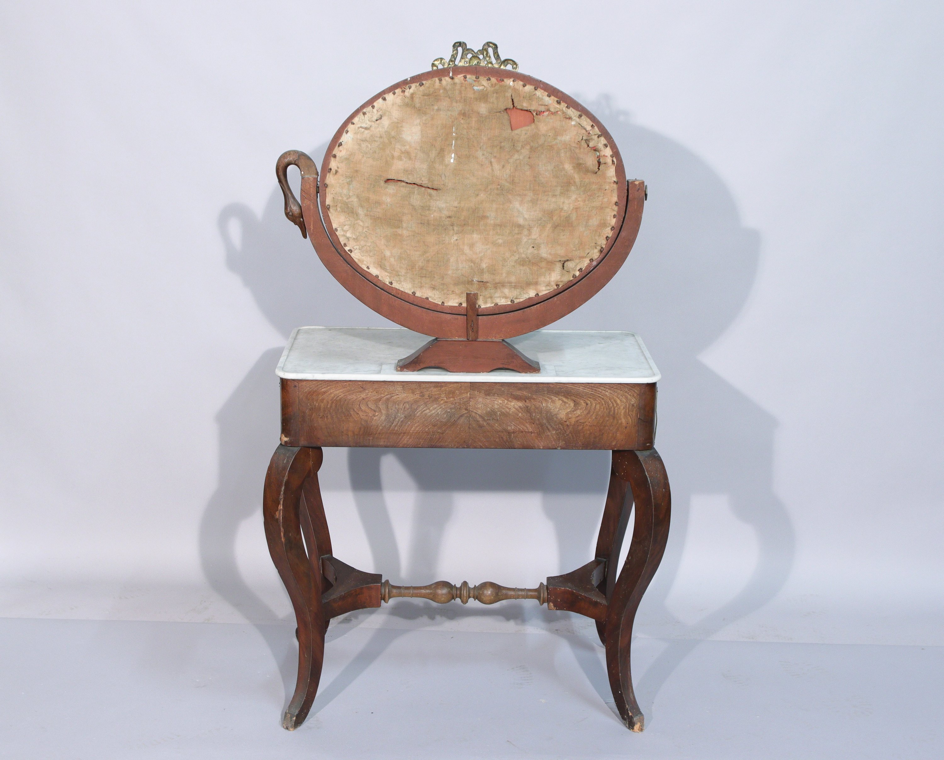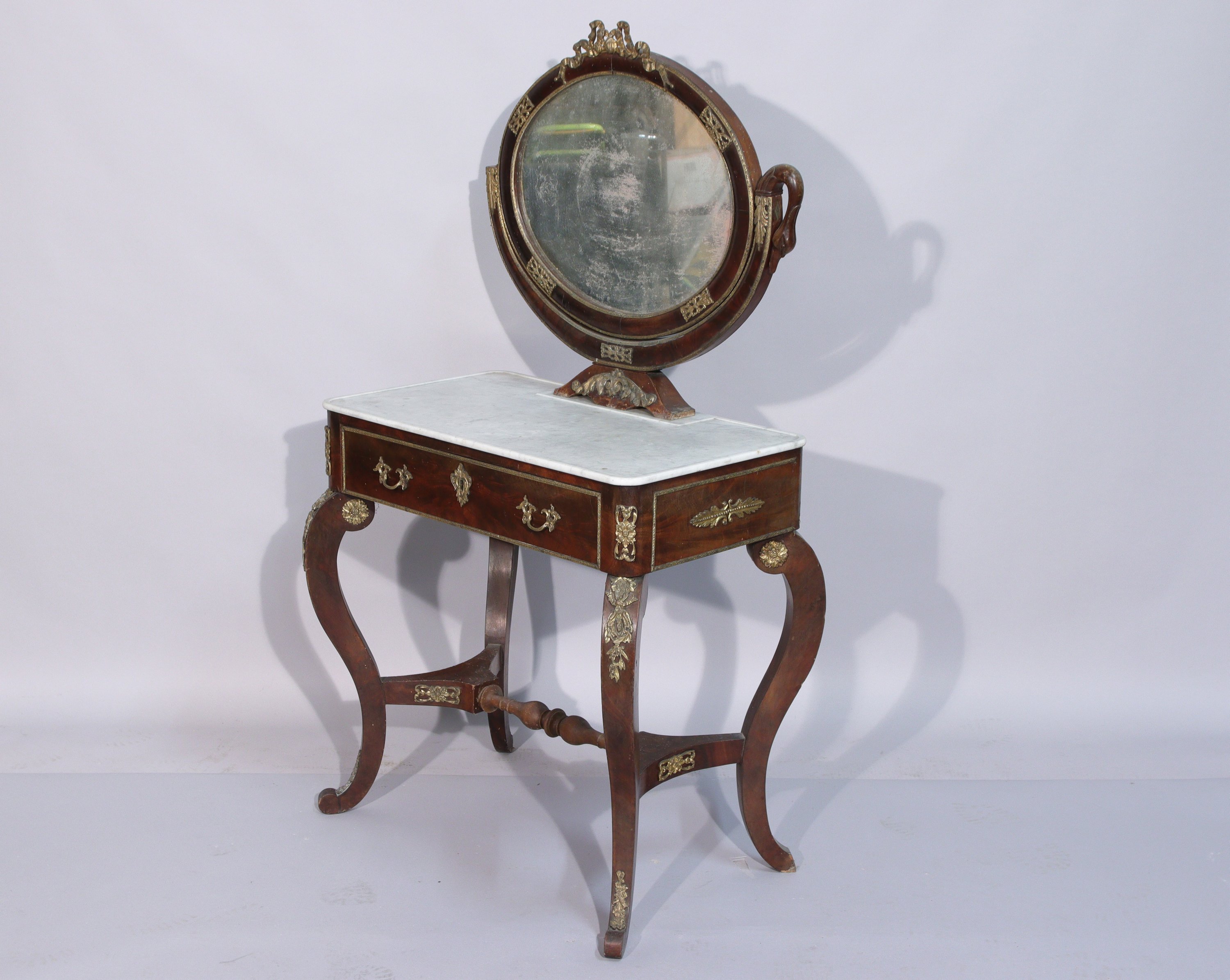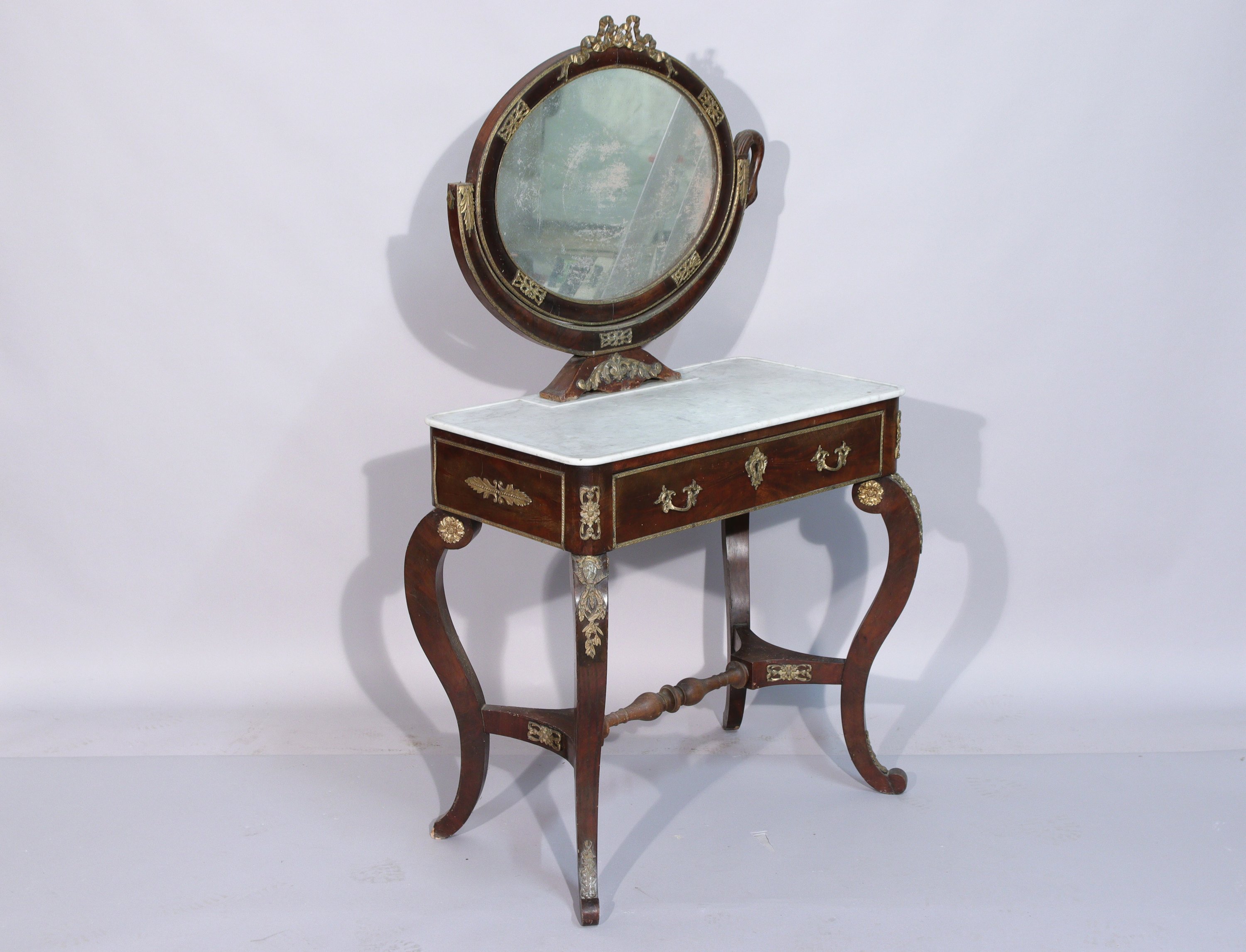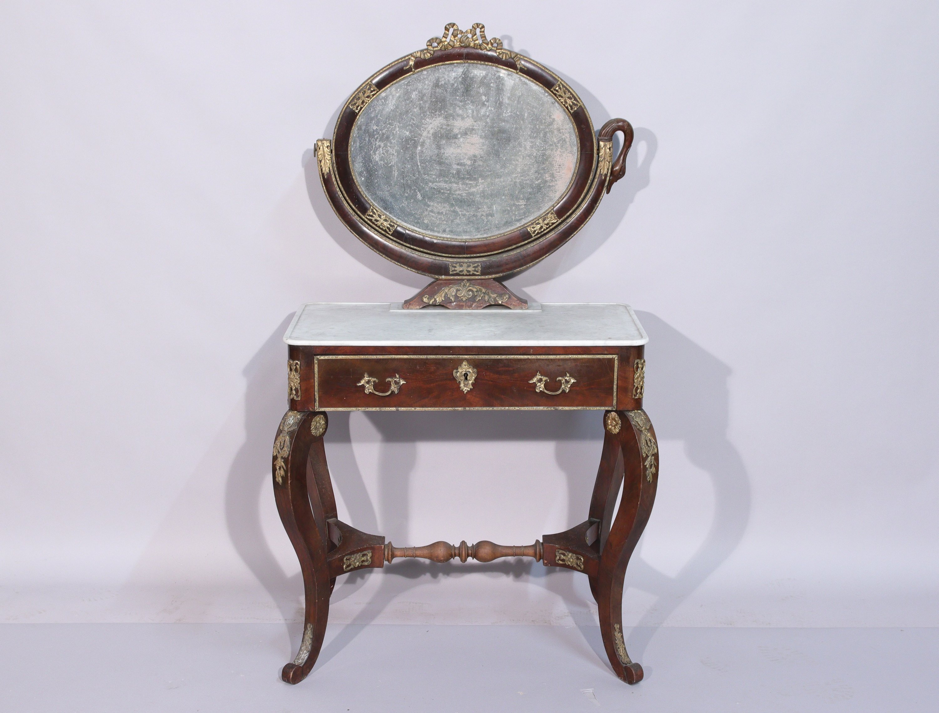 en acajou et placage d'acajou, à plateau rectangulaire en marbre blanc aux angles arrondis. Il soutient un miroir ovale inclinable inscrit entre deux cols de cygne. La ceinture ouvre par un tiroir dissimulant plusieurs compartiments et une planchette recouverte de cuir vert. Quatre pieds galbés réunis par une entretoise en bois tourné.