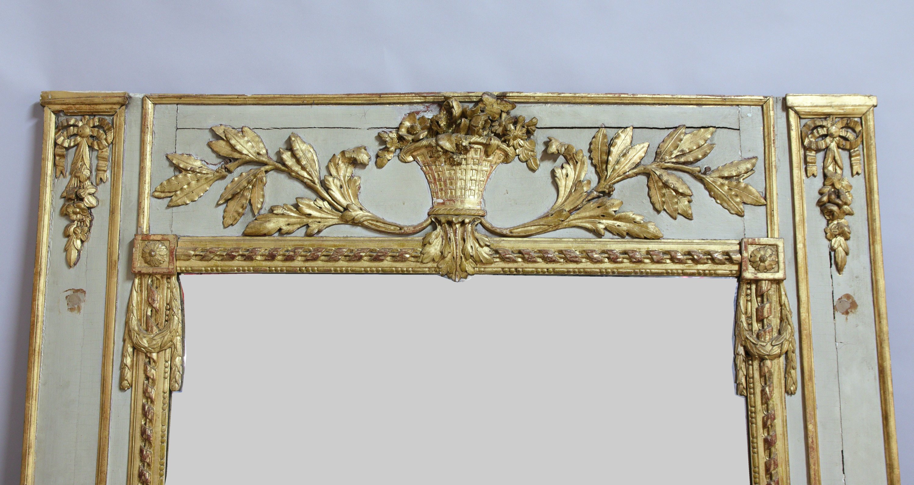 en bois doré, sculpté et laqué gris. Il est décoré en partie supérieure d'une panière fleurie entourée de deux branches de laurier. Deux pilastres de chaque côté coiffés de noeuds et terminés par des vases à l'antique. Le miroir en deux parties est souligné par une frise de rubans noués et raccordements à fleurettes. Une paire de bras de lumière à deux feux à décor de feuilles ouvragées et de pampilles éclairent l’ensemble.