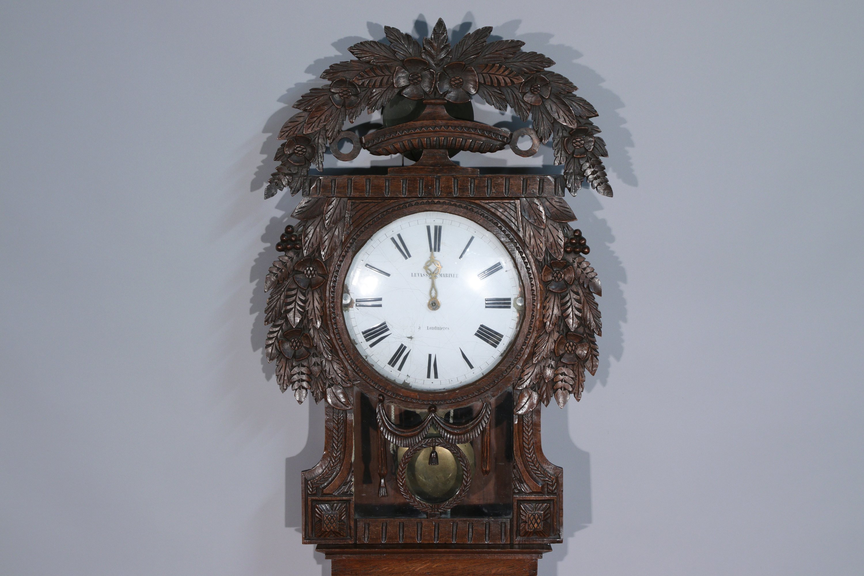 en chêne, richement sculptée de corbeilles et vases de fleurs, de nombreux motifs végétaux et floraux, ainsi que de frises et délégantes draperies. Le cadran émaillé de blanc présente les heures en chiffres romains et est signé de la maison Levasseur-Marinée à Londinières, en Seine-Maritime.
