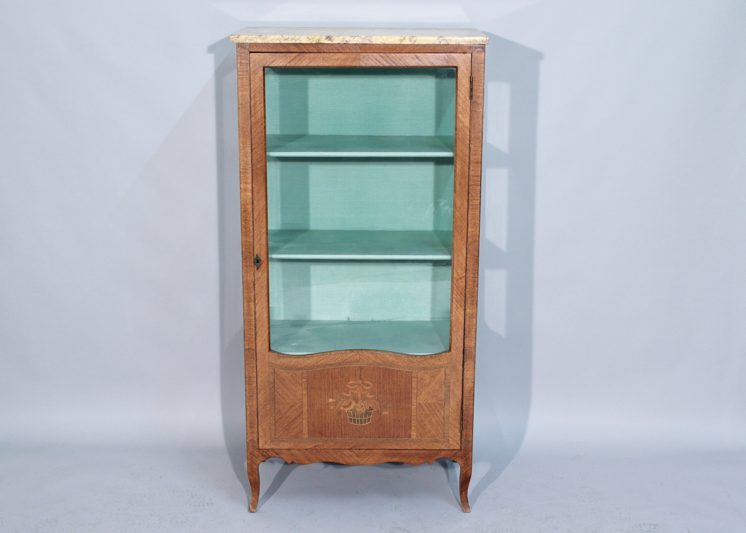 en placage de bois de rose rehaussé de filets de bois exotique. Elle ouvre en façade par une porte vitrée décorée d'une panière fleurie révélant à l'intérieur trois niveaux d’étagères recouvertes, ainsi que le fond du meuble, d’un tissu bleu turquoise. La ceinture chantournée, les pieds cambrés. Dessus de marbre brèche.