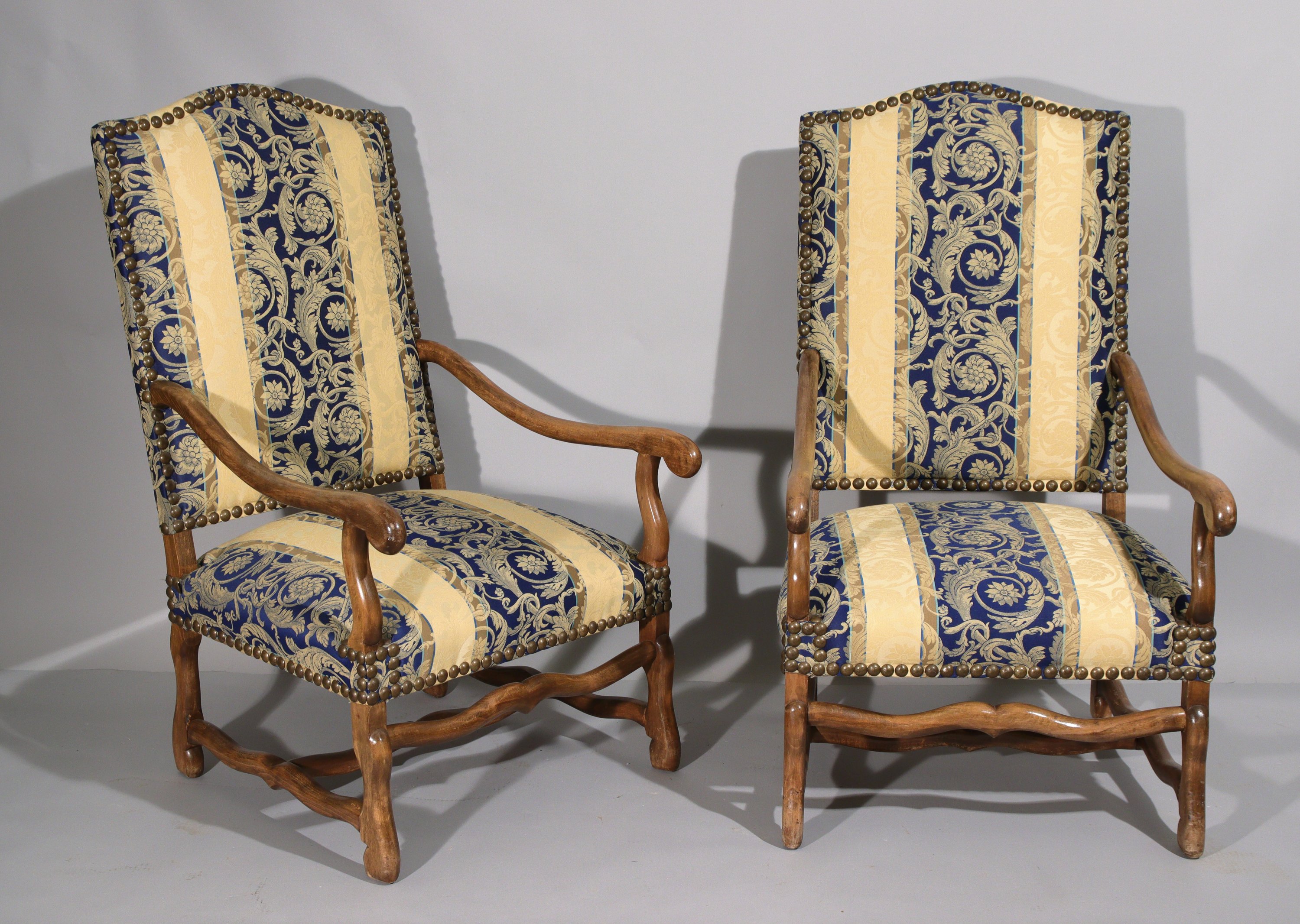 Paire de fauteuils en noyer à haut dossier légèrement incliné....