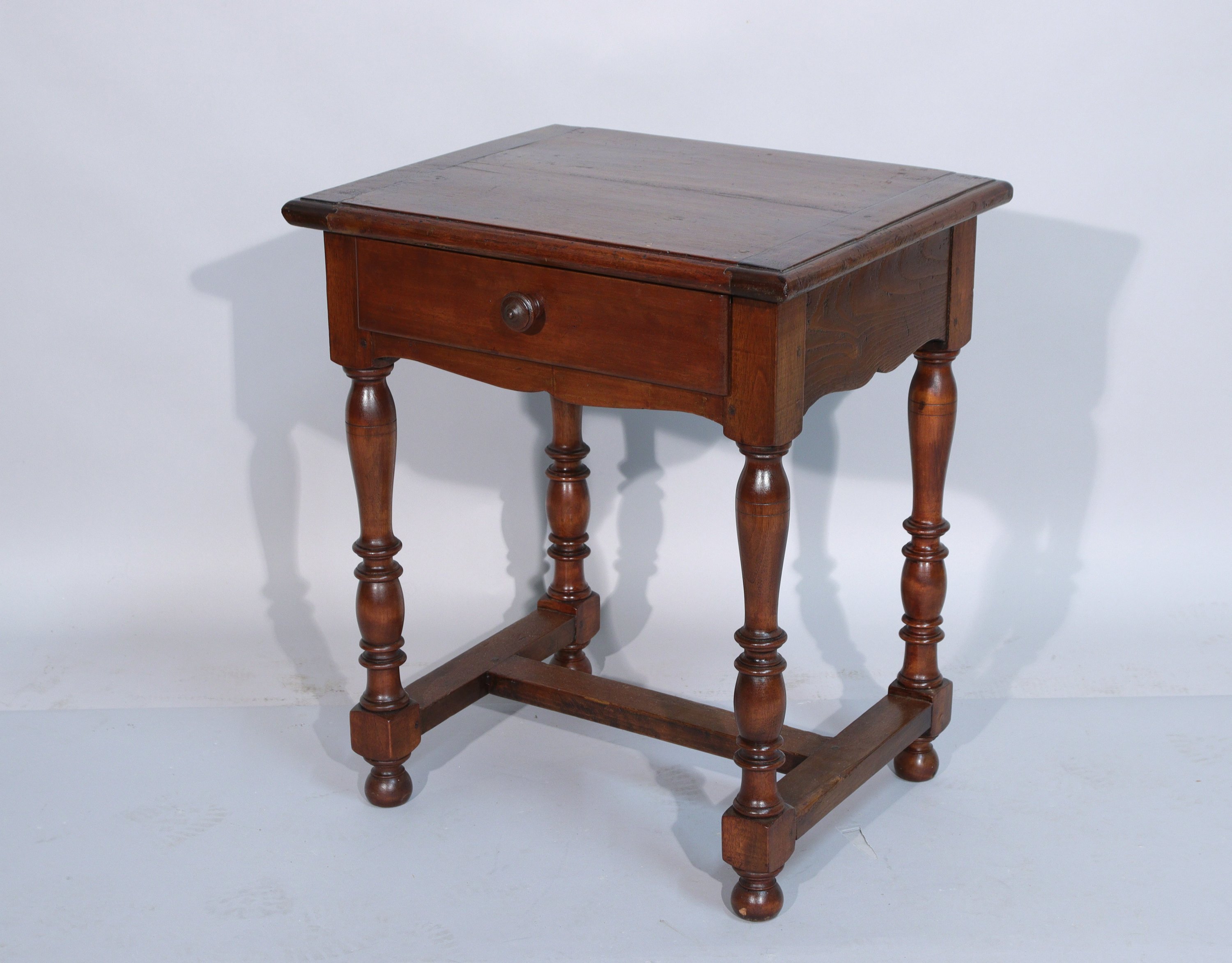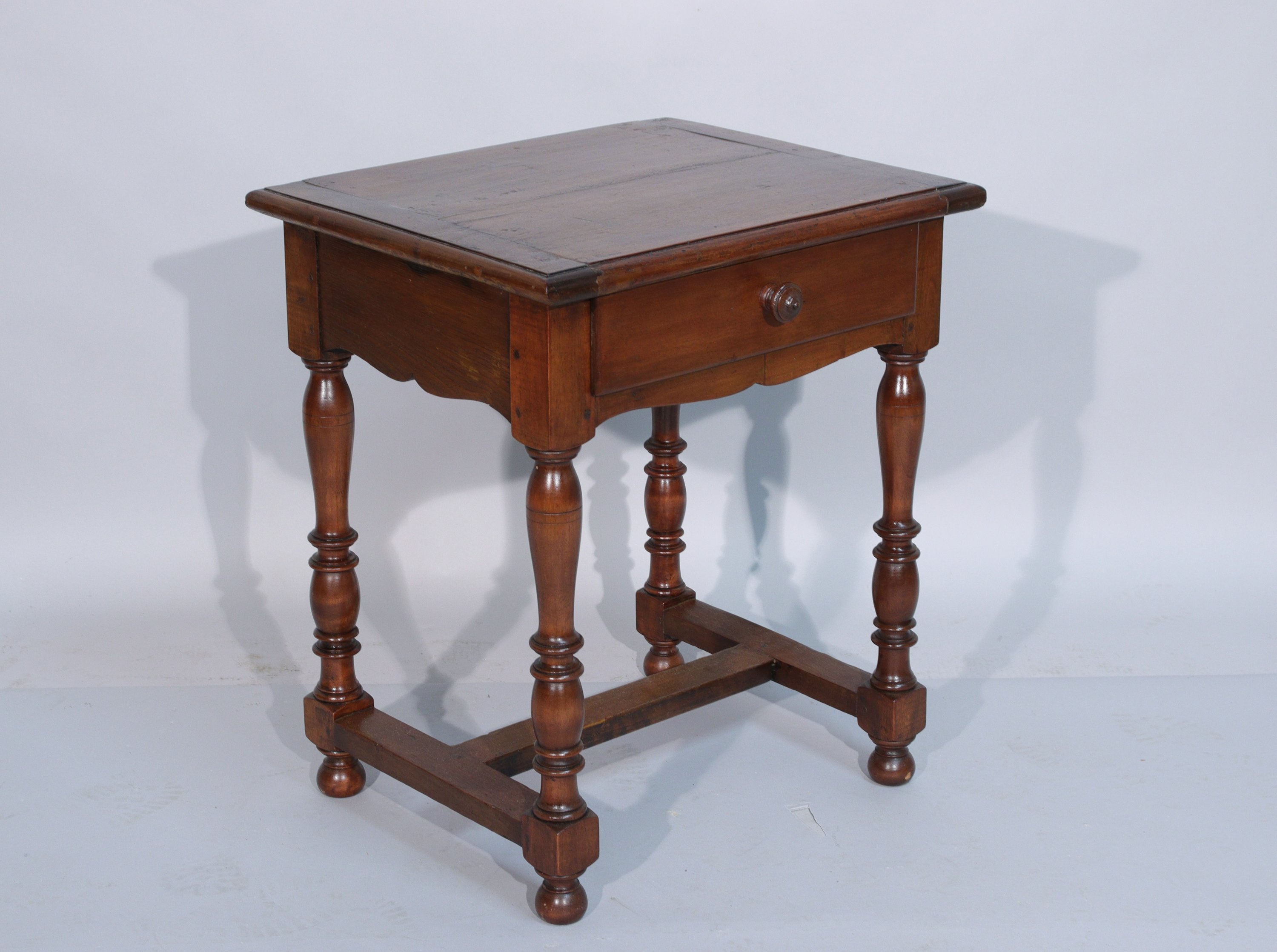 en bois fruitier mouluré et tourné, à plateau rectangulaire ouvrant en ceinture par un tiroir. Piétement balustre terminé par de petites boules et réuni par une entretoise en H.