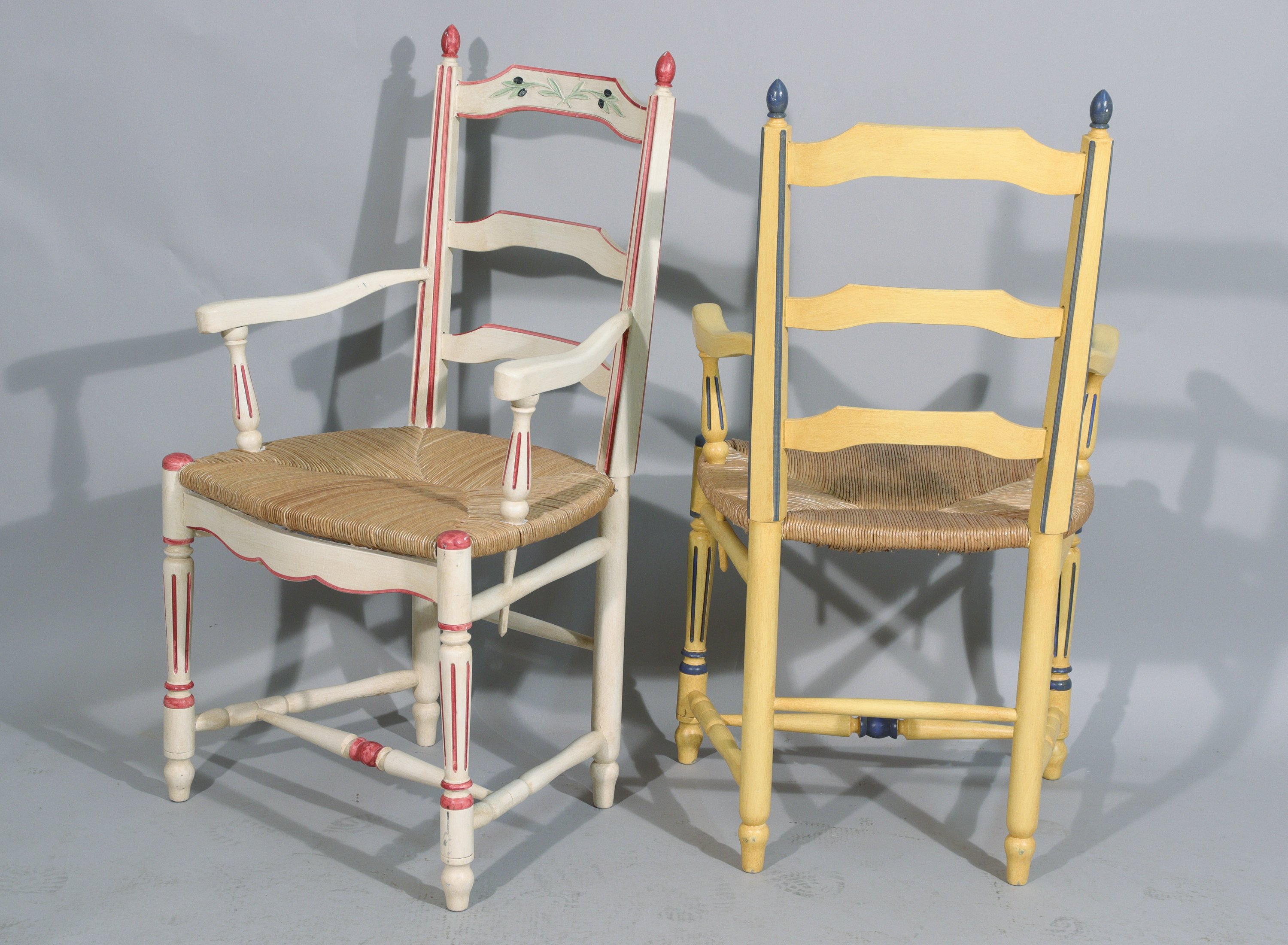 en bois tourné, mouluré et polychromé, à dossier ajouré décoré à l'amortissement de branches d'olivier. Les supports d'accotoirs en retrait sont cannelés. Ils reposent sur quatre pieds réunis par une entretoise en H, les antérieurs cannelés.