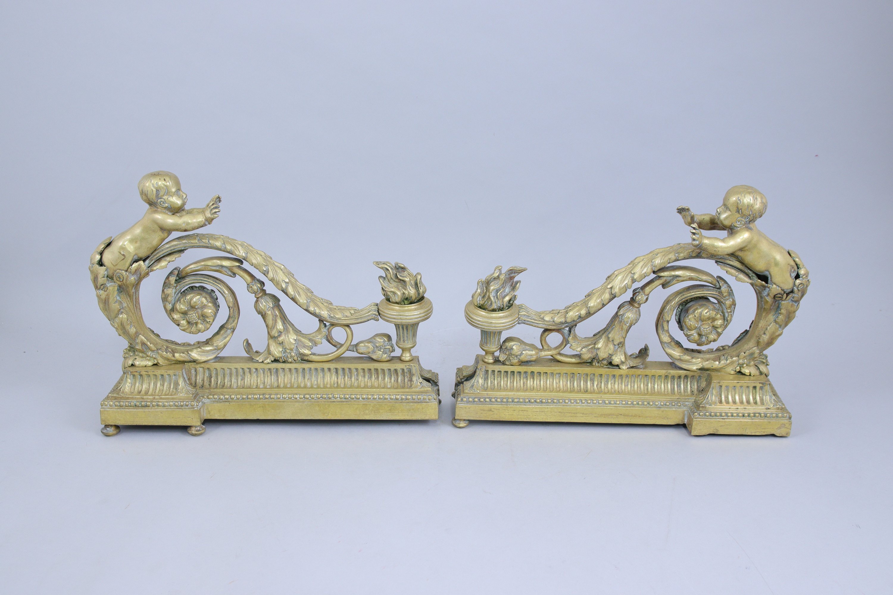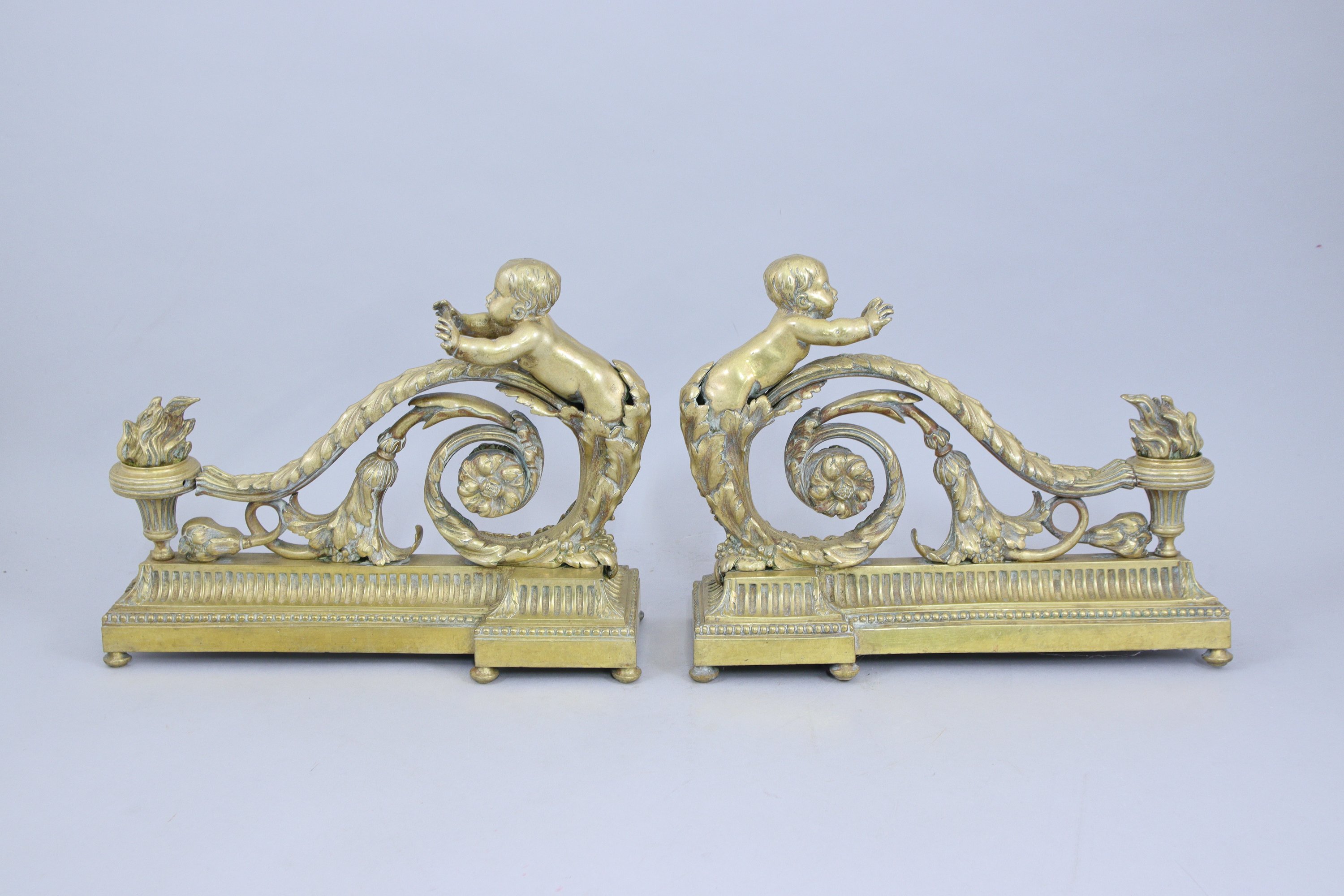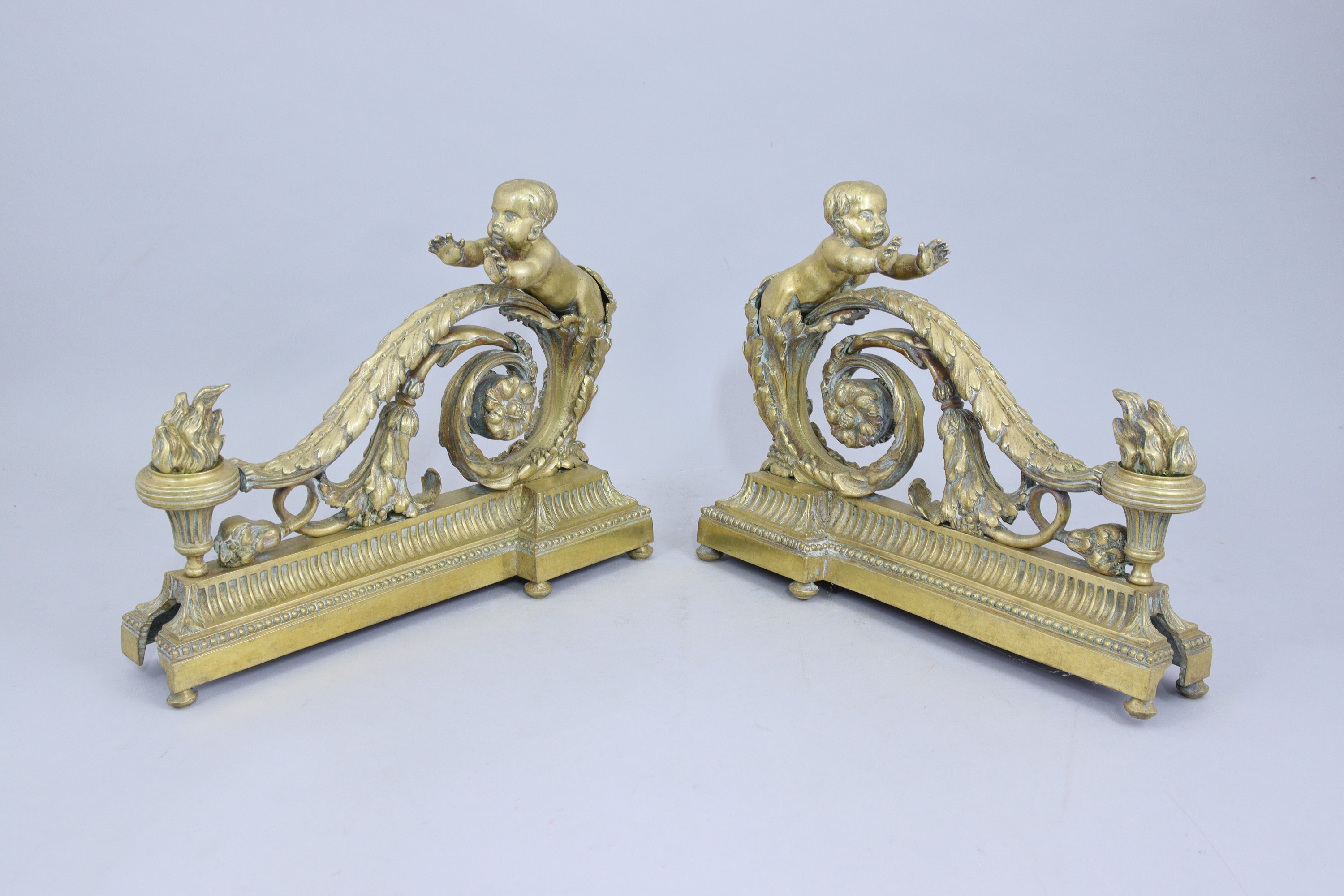 en bronze doré et laiton. Riche décor d'enroulements à feuilles d'acanthe, graines épanouies et putti tendant les bras vers un pot à feu. La base à décor godronné et rangs de perles. Il repose sur des pieds toupies.