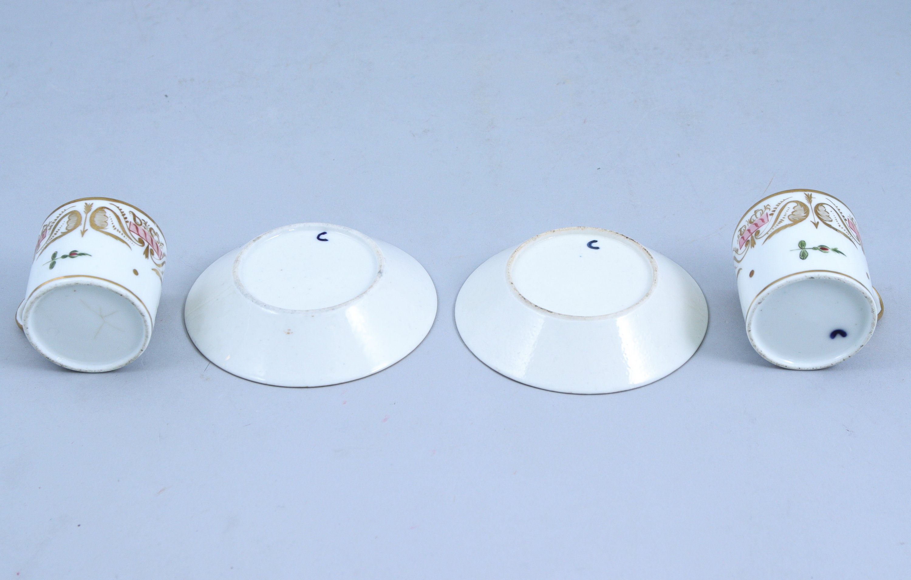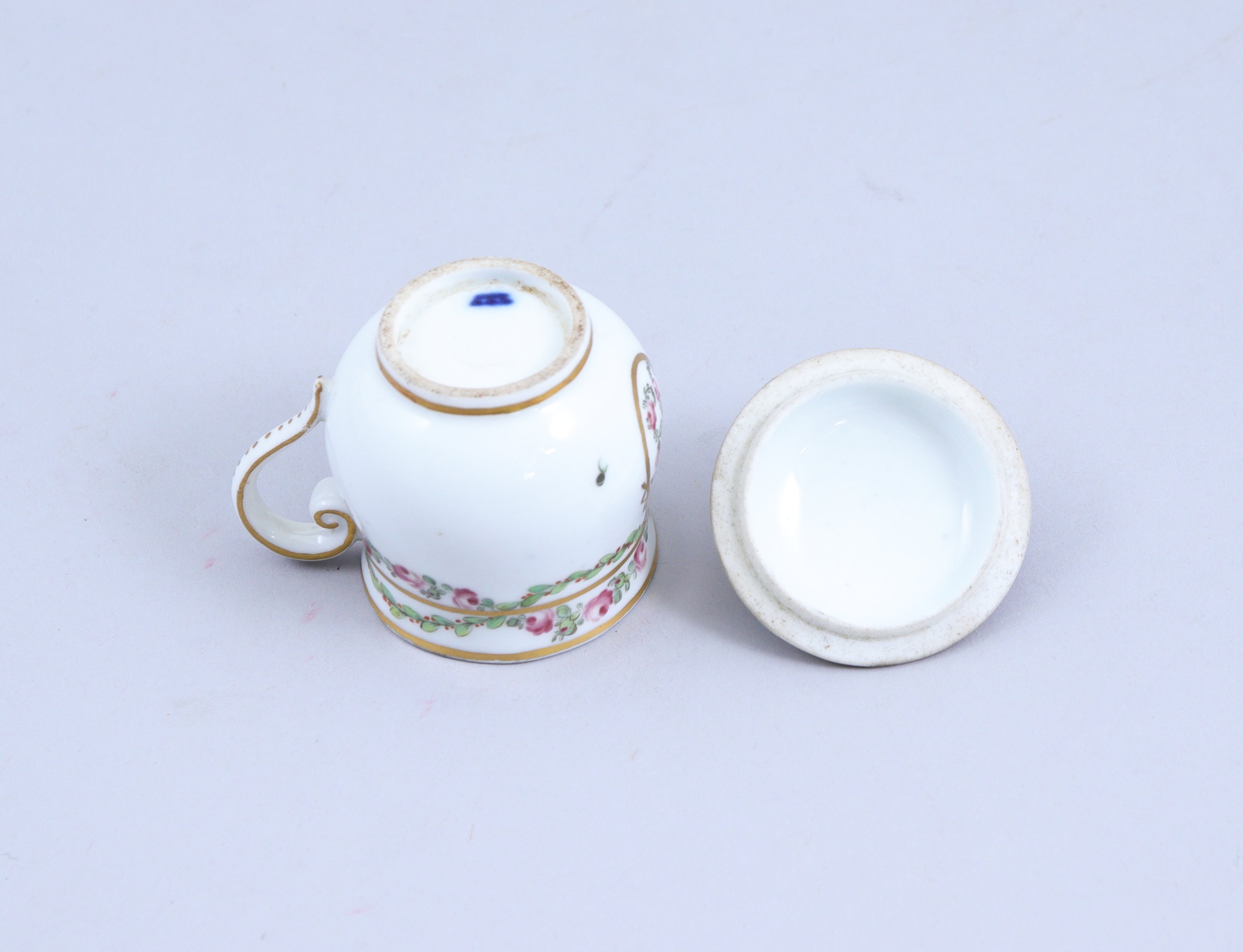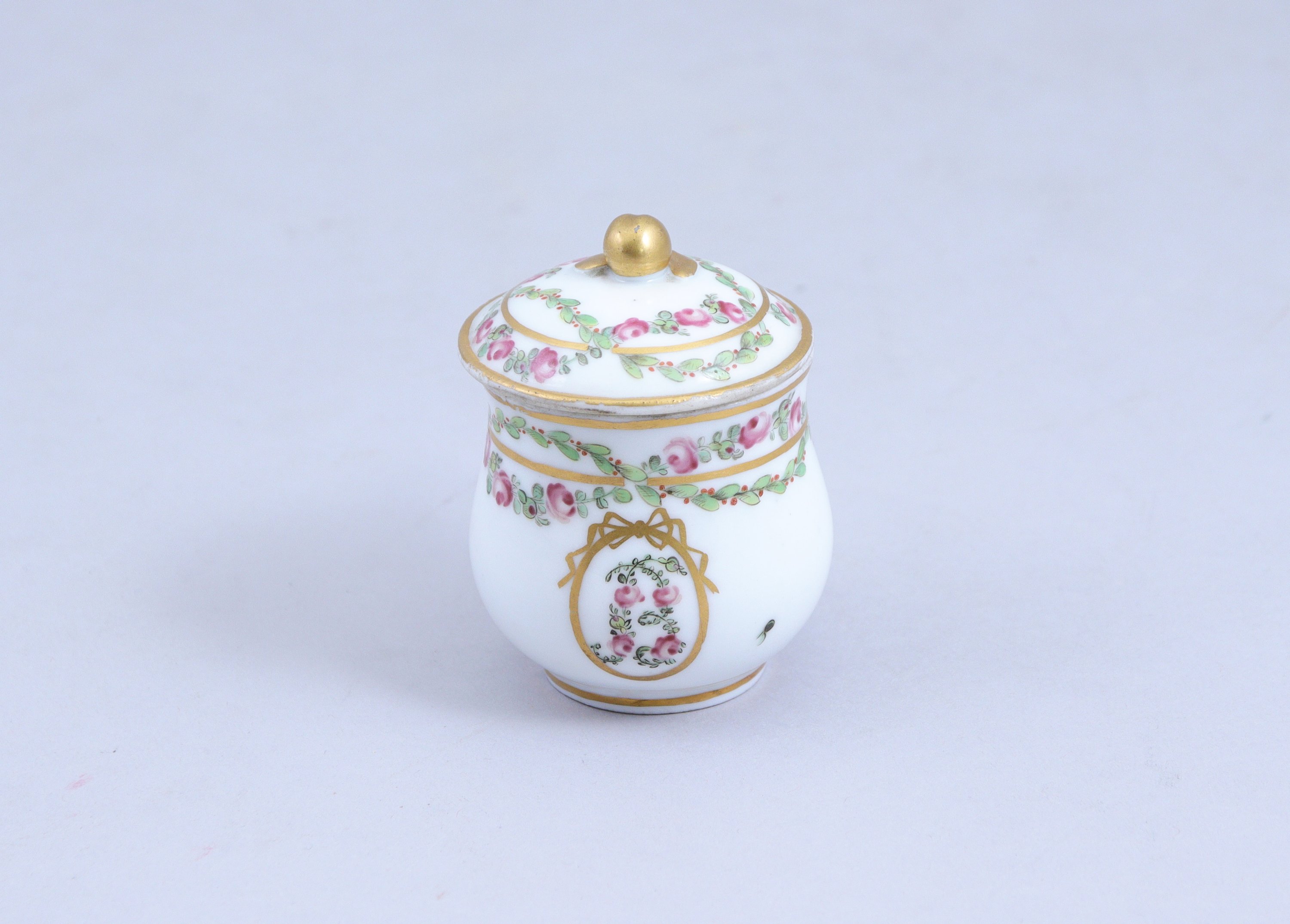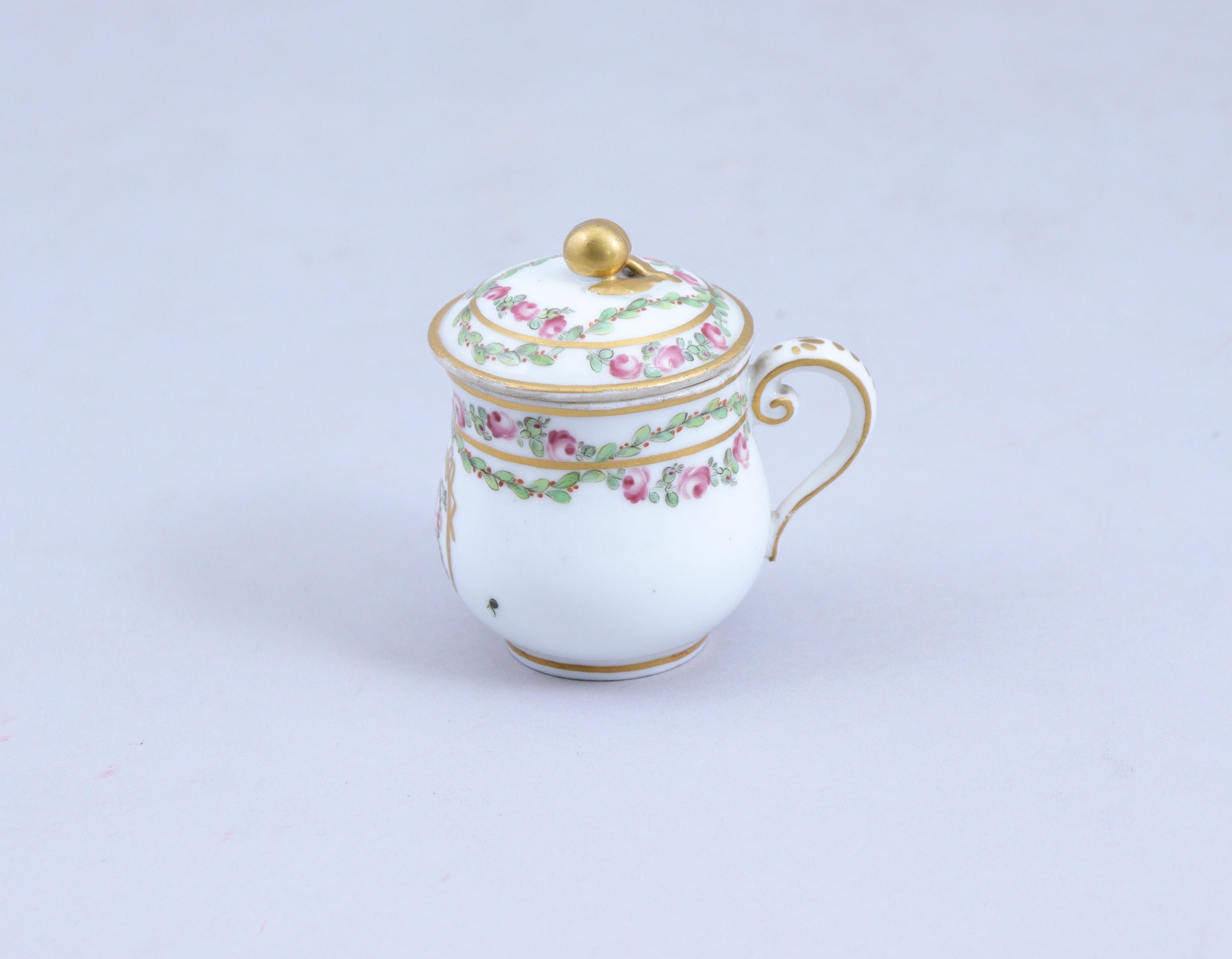 Joint: Pot à crème en porcelaine à décor de guirlandes de roses entourant un liseré doré, un médaillon dans lequel est inscrit la lettre B. Marque au lambel, Vincennes, manufacture de Hyacinthe Séguin. Haut. 8 cm. Travail de la fin du XVIIIe siècle.