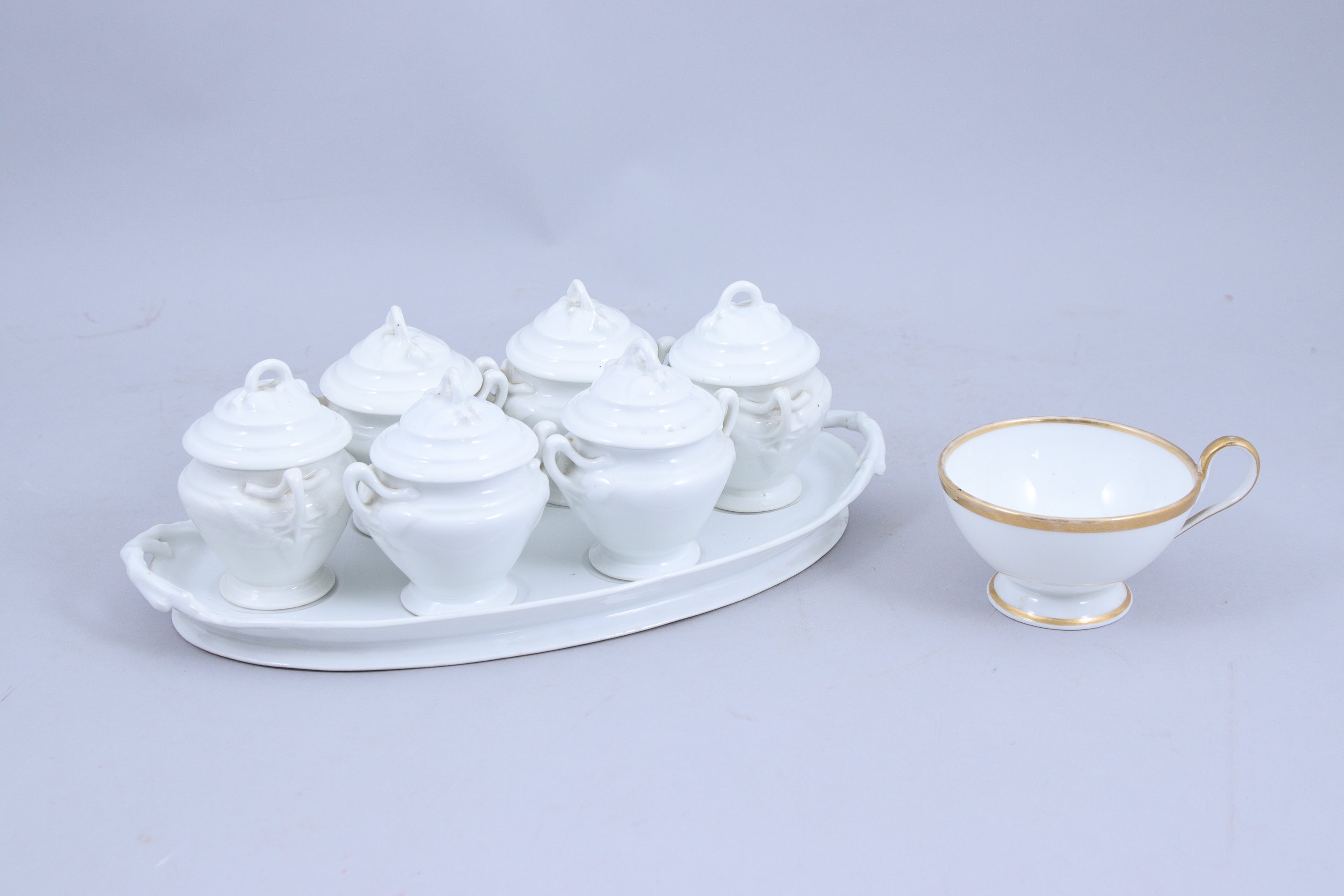 Joint: Service à crème en porcelaine blanche, composé de six tasses et leur couvercle présentées sur un plateau. Long. plateau 30 cm et une tasse en porcelaine blanche Diam. 9,5 cm.