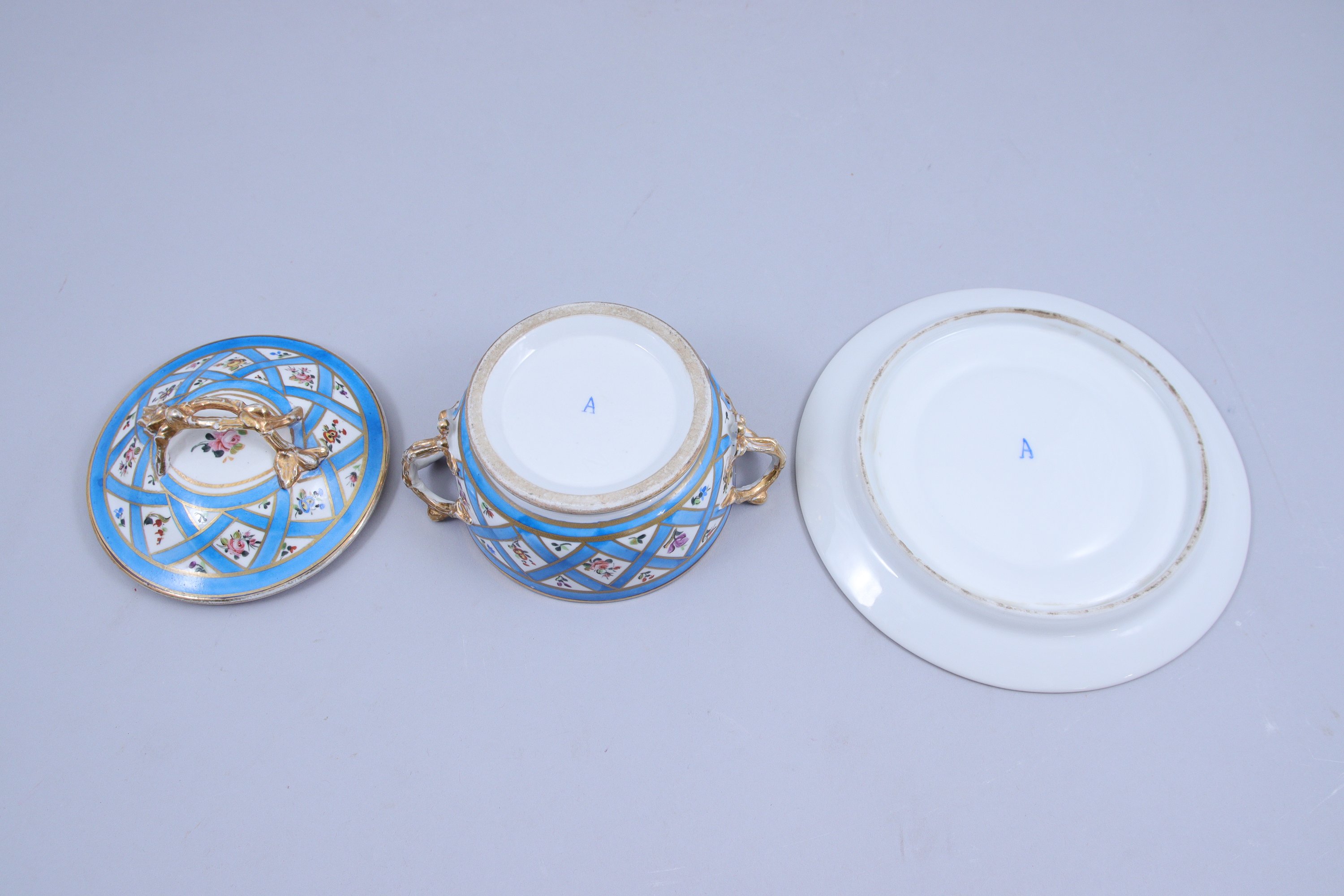 en porcelaine blanche décorée de fleurs polychromes variées et de croisillons bleu céleste aux liserés dor. Les anses du bouillon et du couvercle présentent des motifs végétaux dorés.