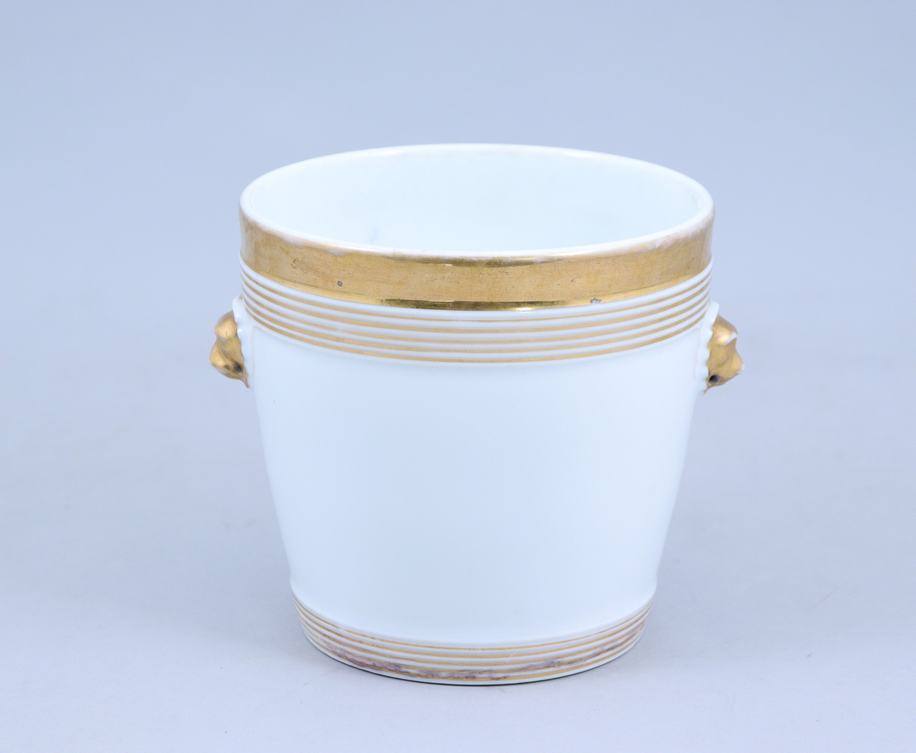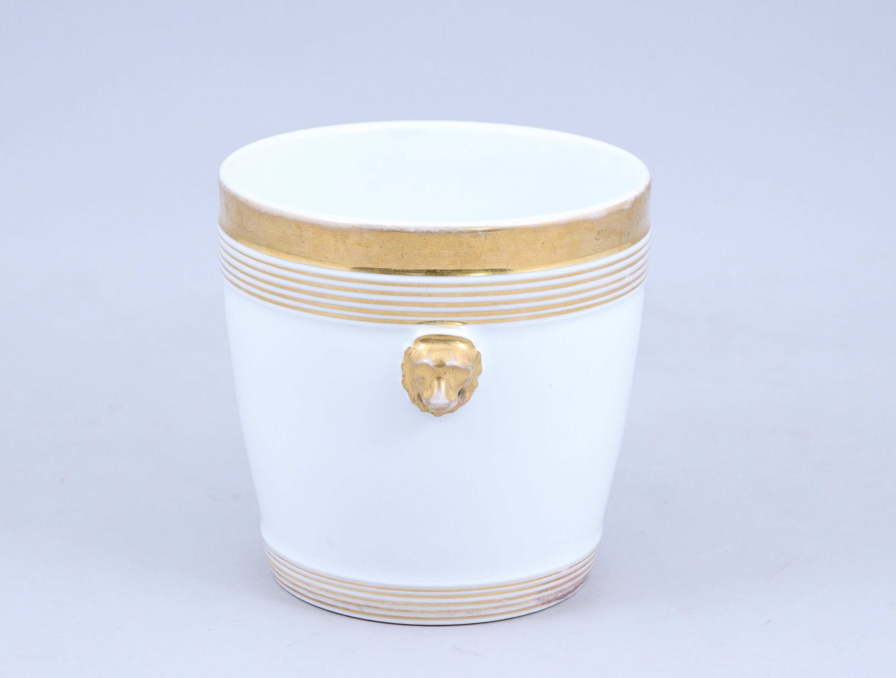en porcelaine blanche rehaussée dor et décorée de deux têtes de lion dorées.