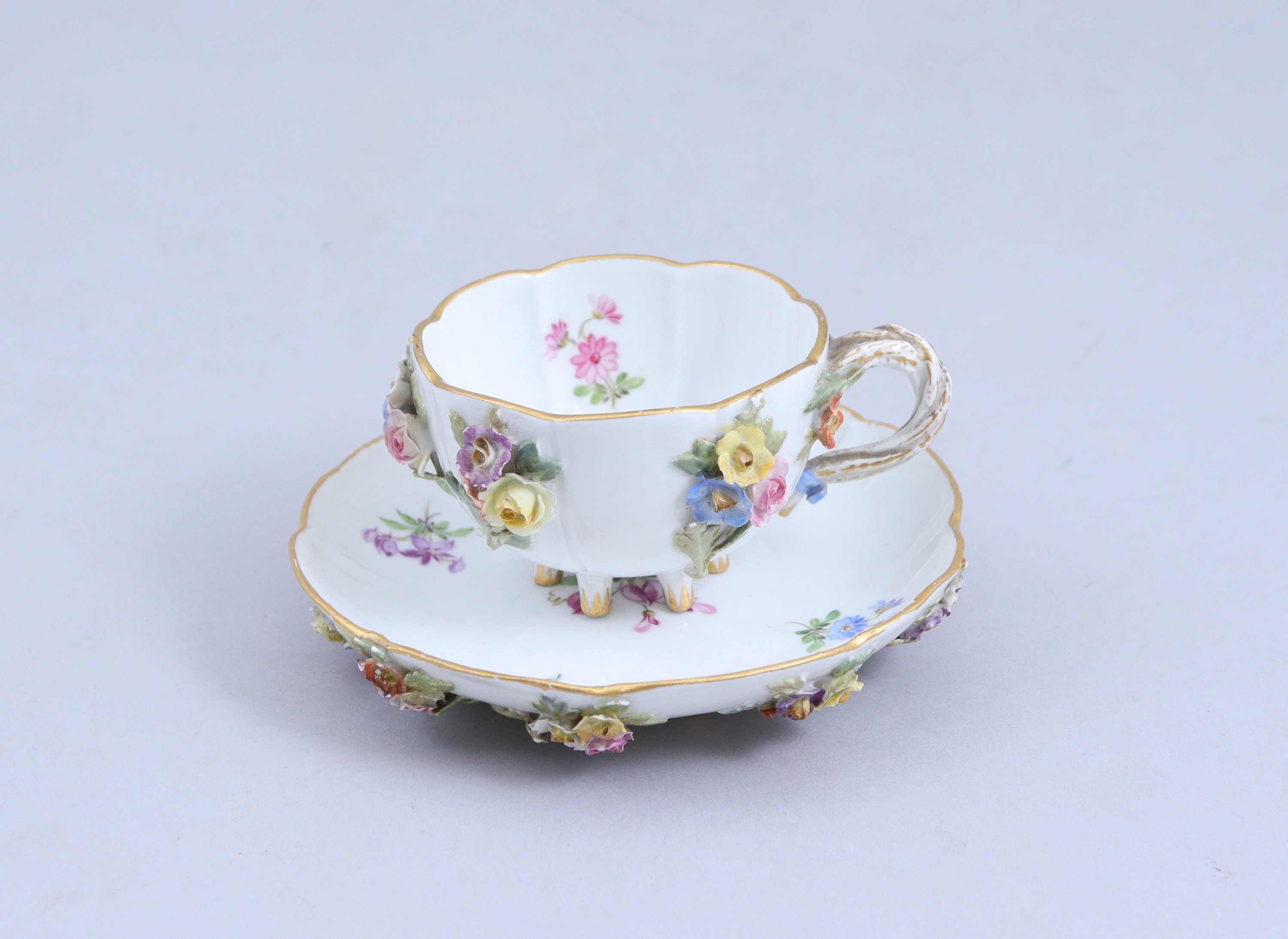 en porcelaine à décor polychrome de fiilets d'or, bouquets de fleurs et feuilles en relief.