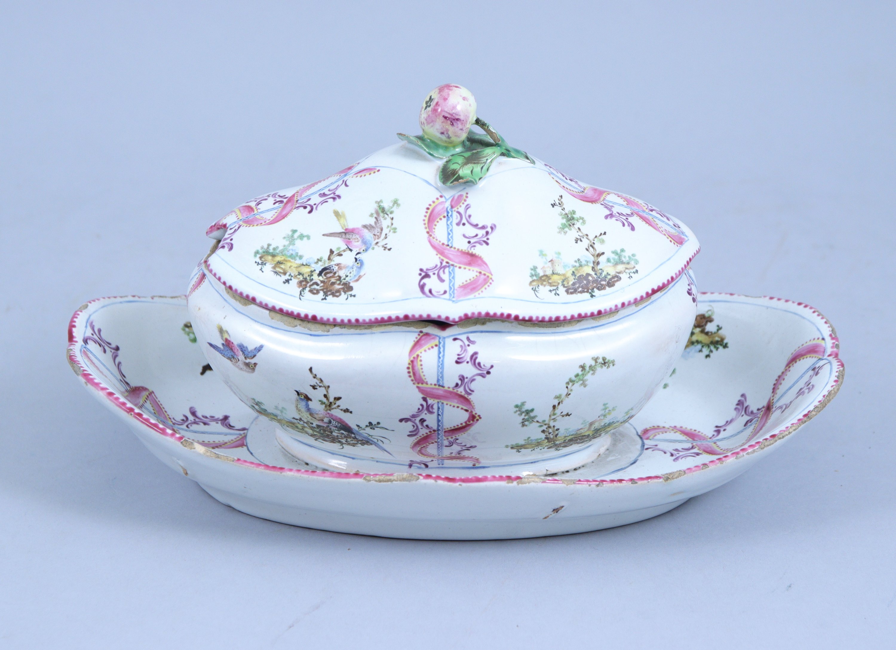 en faïence. La prise du couvercle en forme de fruit sur une terrasse de feuille surmontant un décor aux couples d'oiseaux et paysages dans un entourage de rubans entrelacés.
