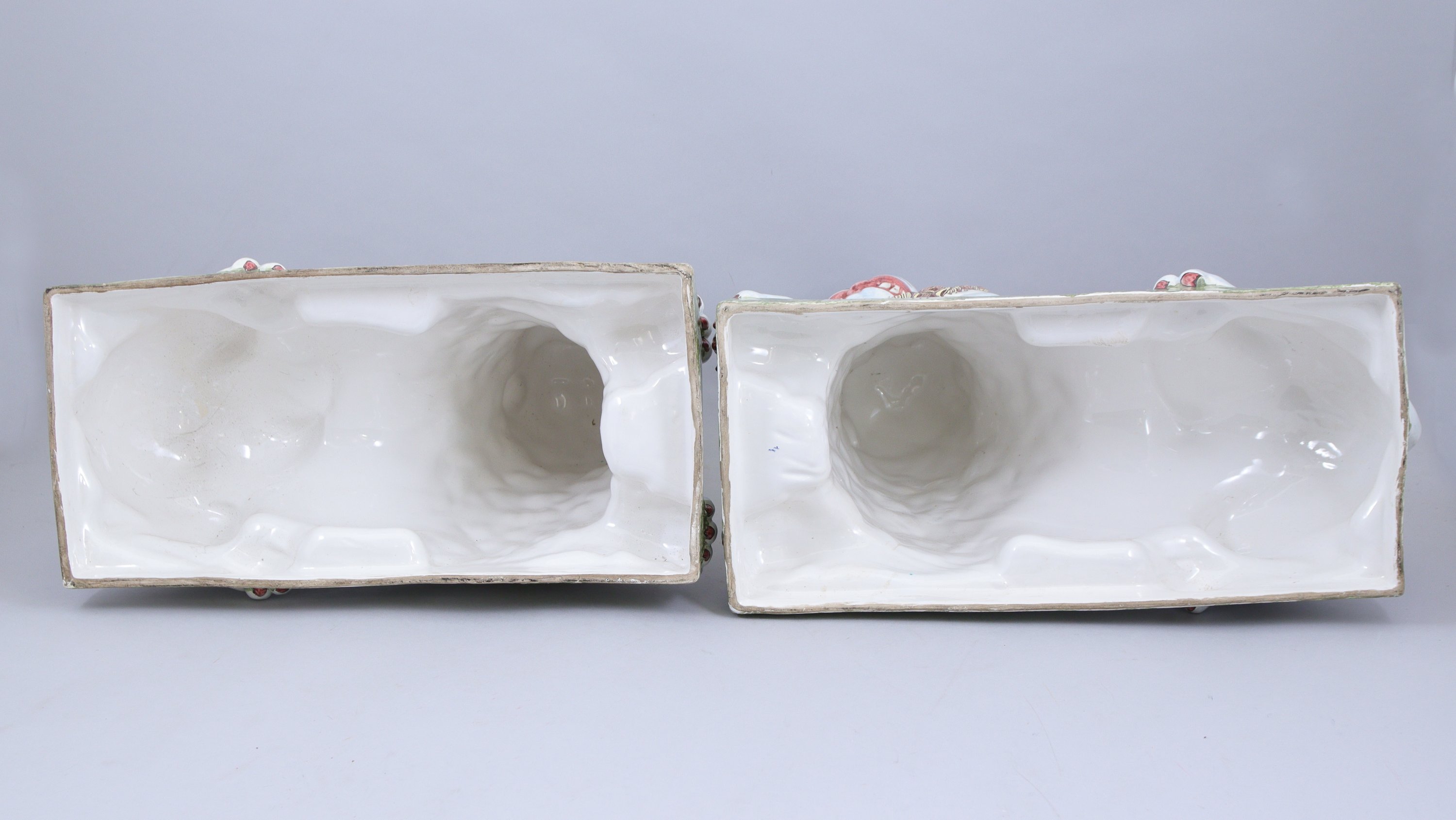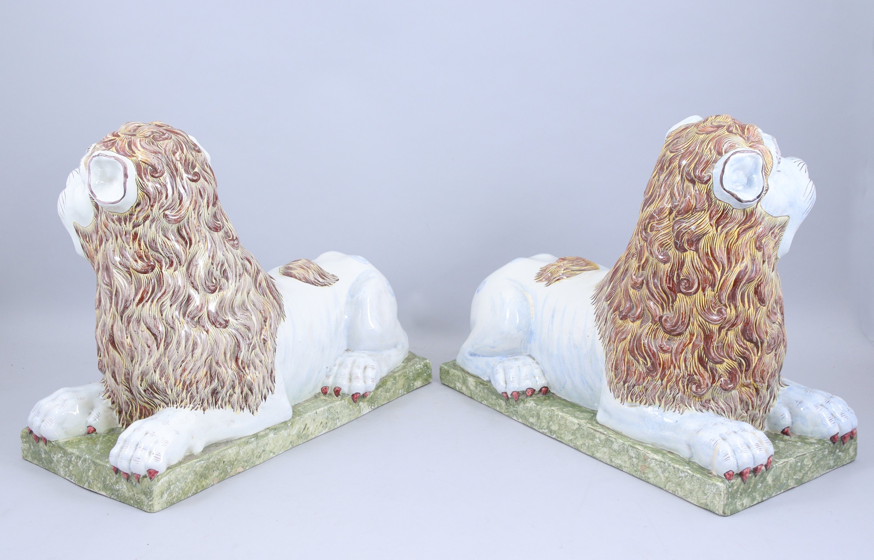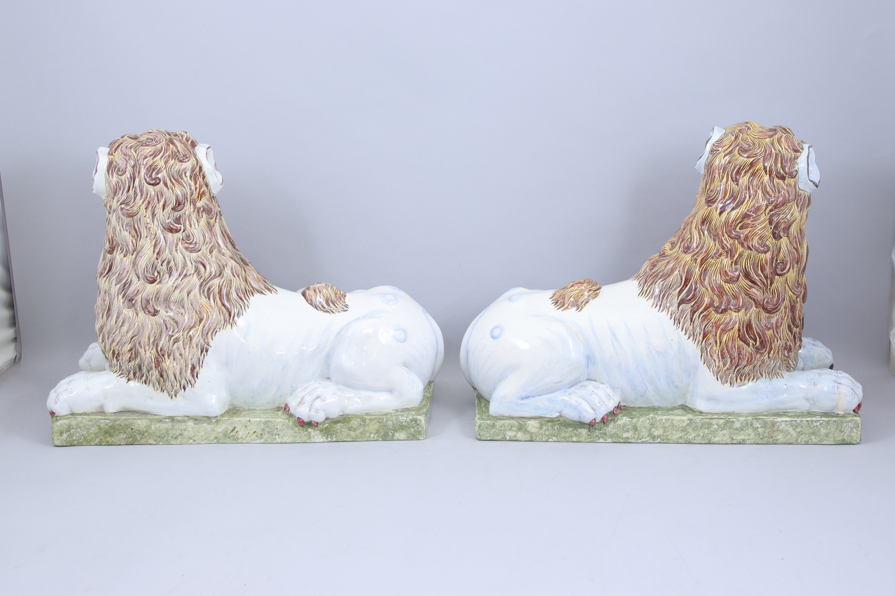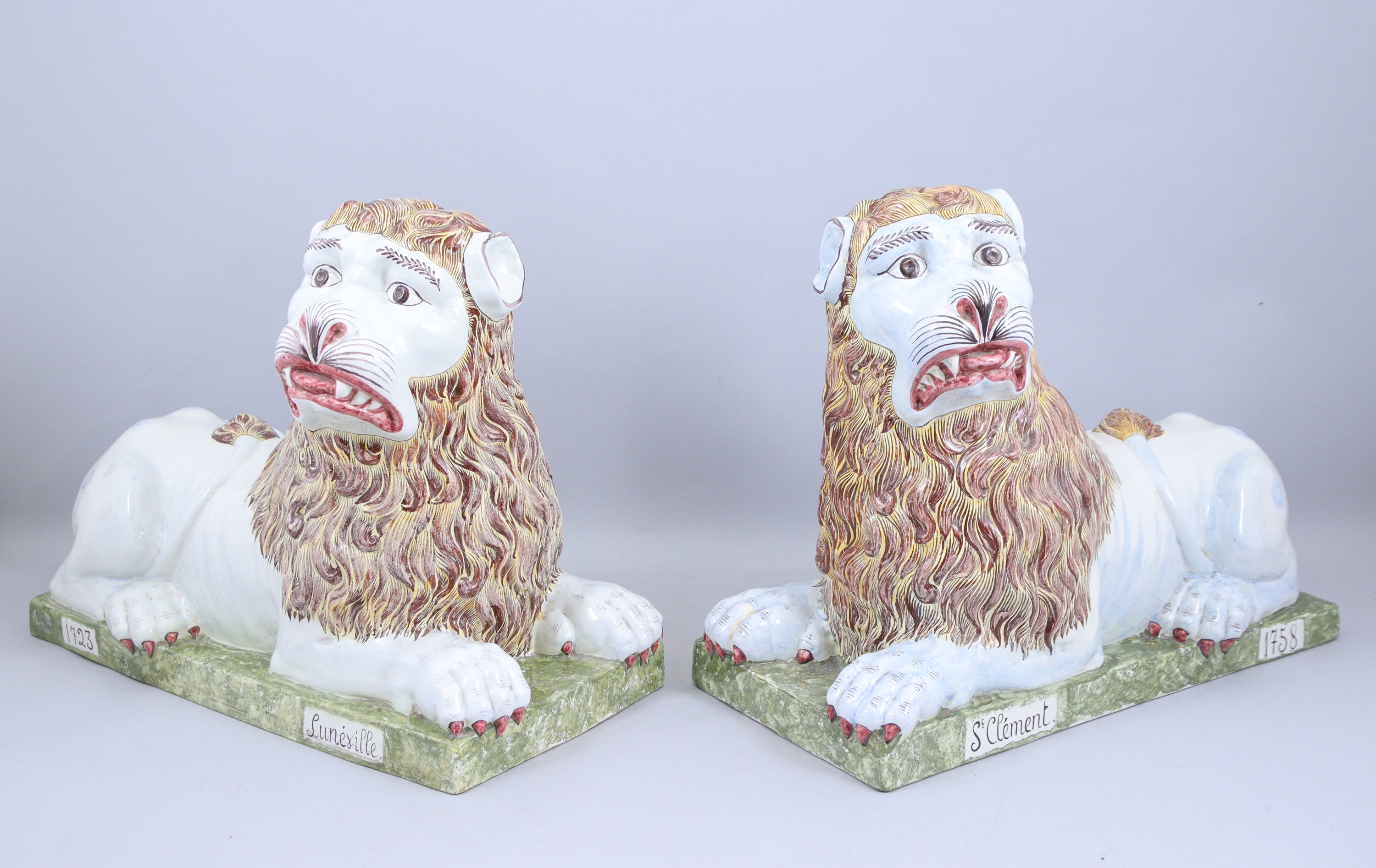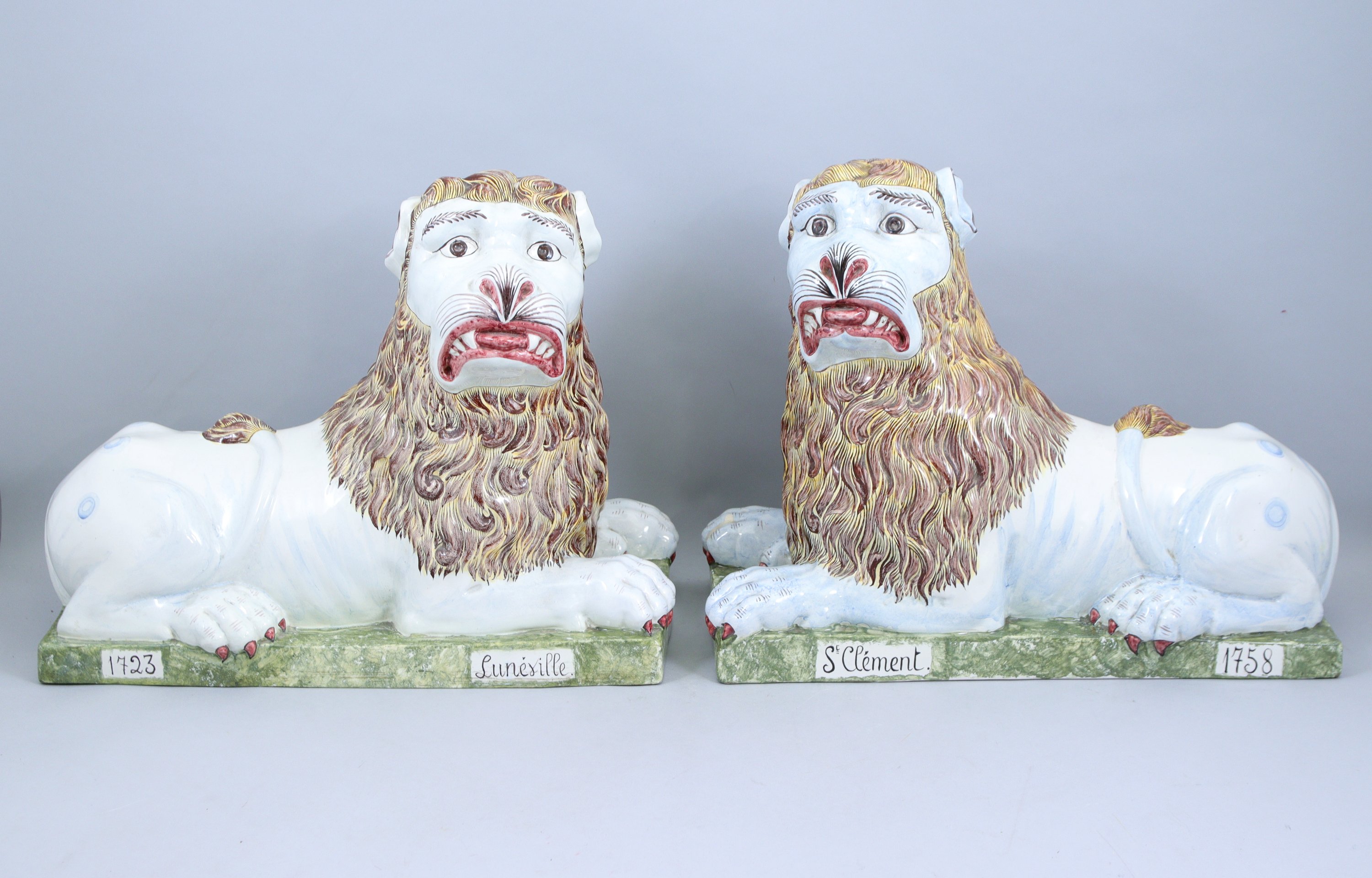 Saint-Clément Paire de lions couchés à belles crinières ocresen faïence...