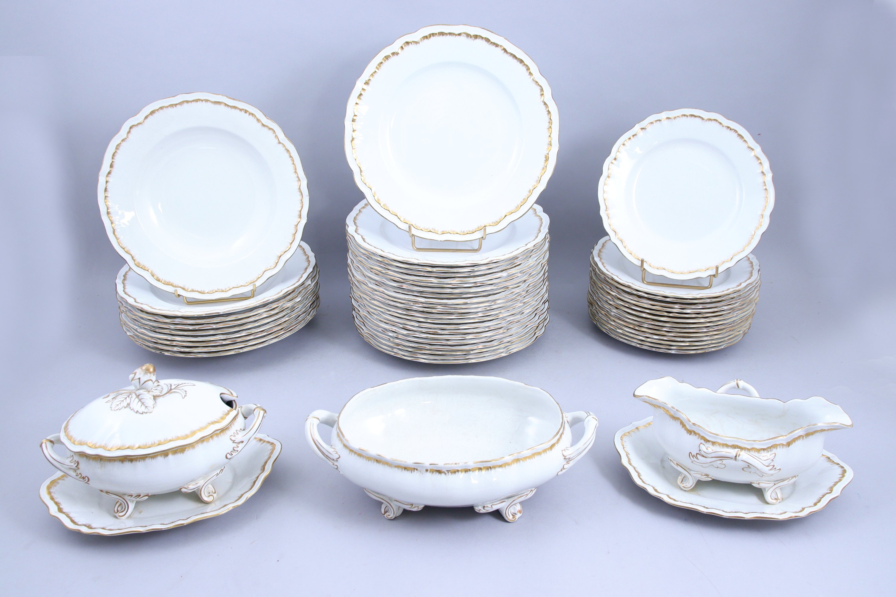 en faïence blanche et réhaut doré à décor rocaille, composé de 54 pièces comprenant vingt-et-une assiettes plates, neuf assiettes creuses, quatorze assiettes à dessert, deux plats ronds plats en deux tailles, un plat rond creux, un plat oblong, une soupière, trois raviers, une saucière couverte, une saucière et son plateau fixe et un bouillon à deux anses.