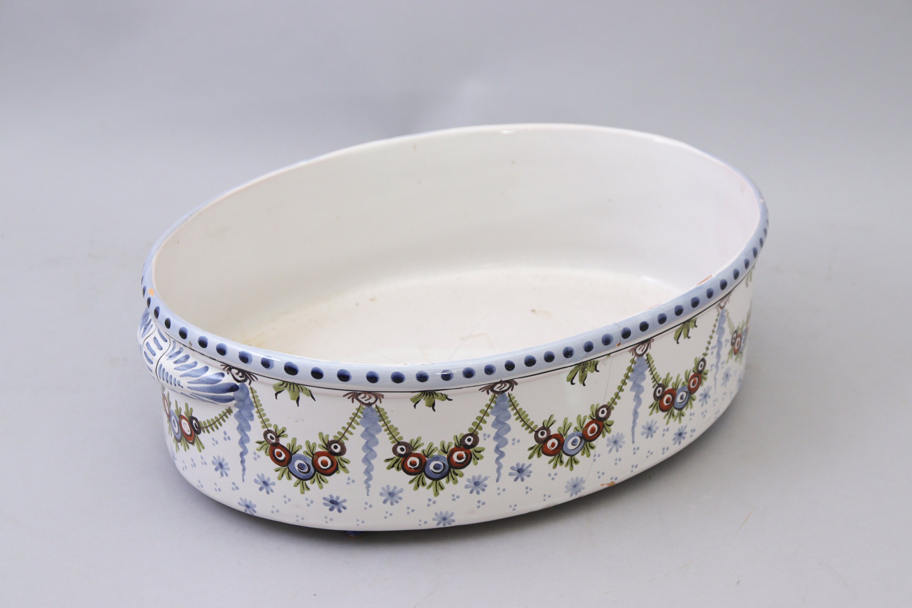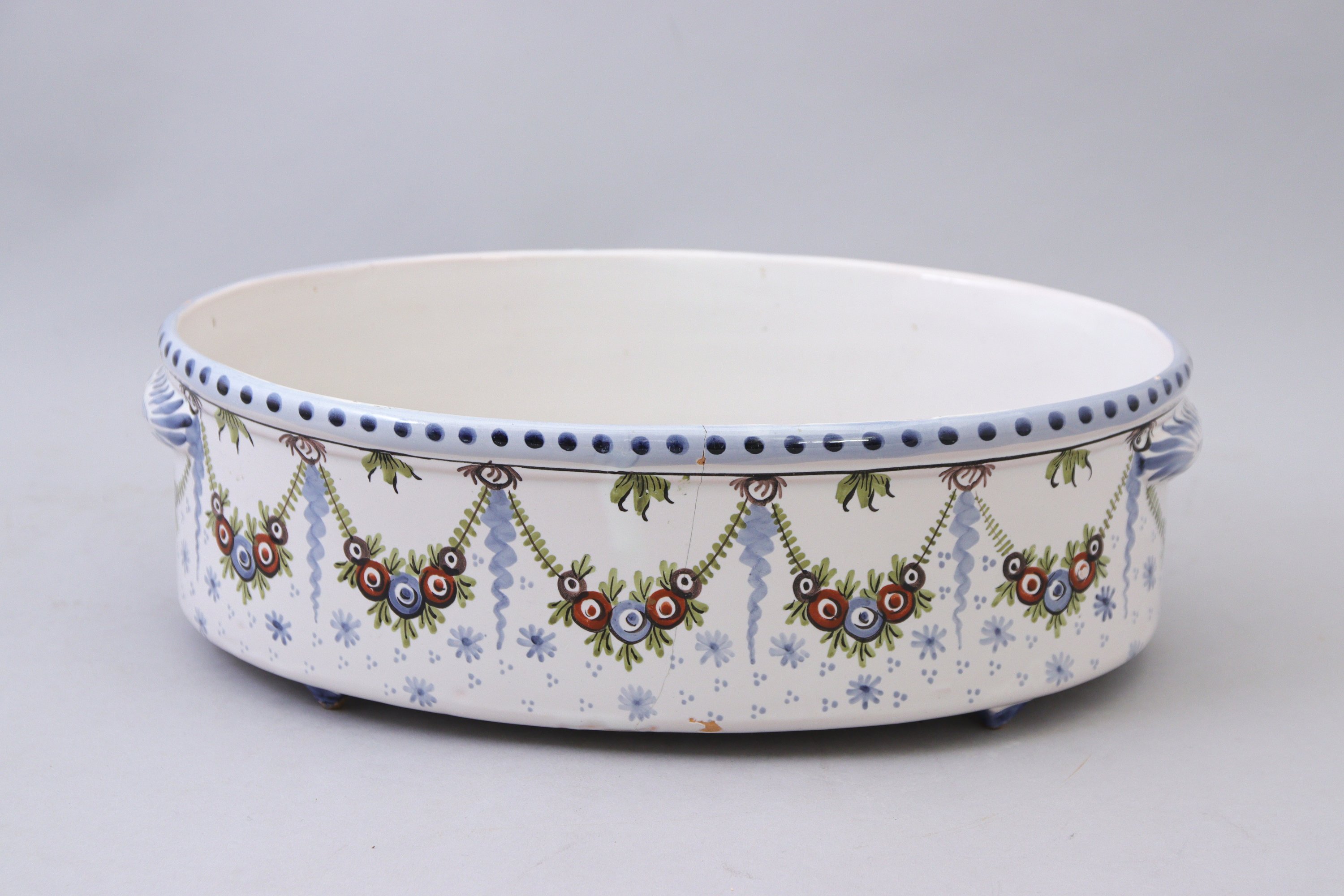 en faïence à décor polychrome de guirlandes dillets, de divers motifs végétaux et de frises reposant sur quatre petits pieds en pyramides inversées.