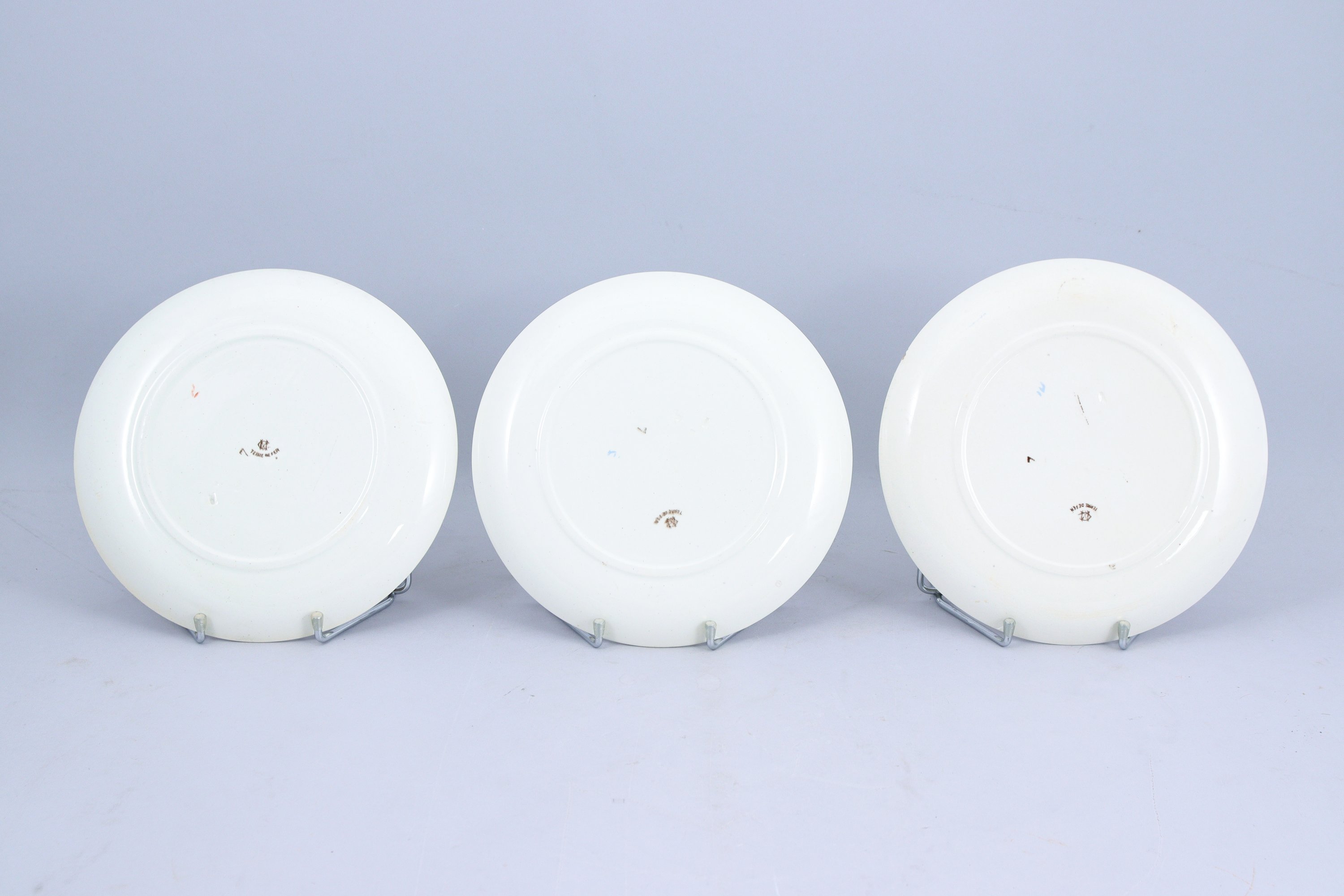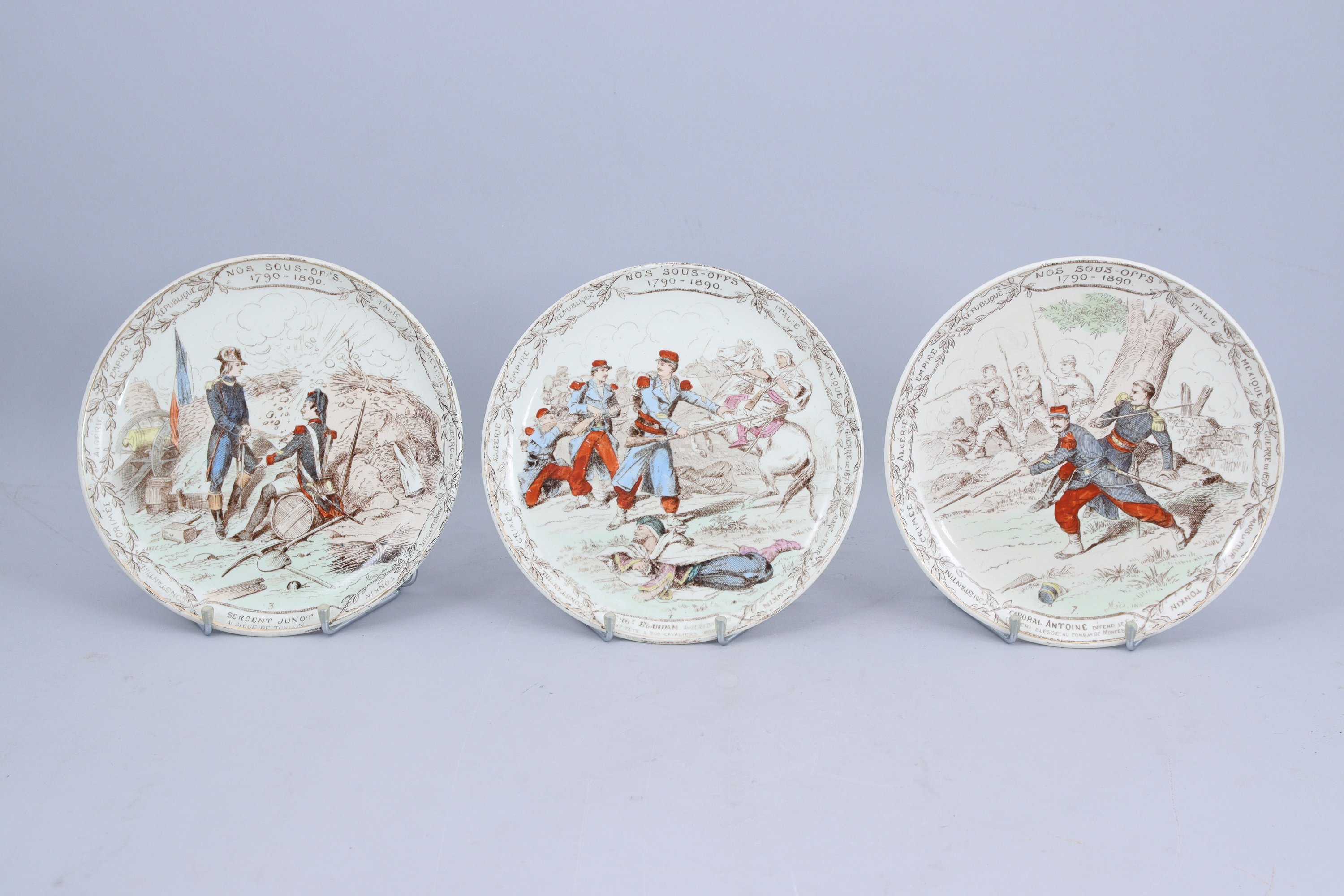 Joint: Creil et Montereau,"Nos sous-offs 1790-1890", Suite de trois assiettes de la série en faïence, au décor imprimé signé de Mès et Lantz, dont: n°3 "Sergent Junot au siège de Toulon", n°4 "Sergent Blandan tient tête à 300 cavaliers arabes" et n°7 "Caporal Antoine défend le Capitaine blessé au combat de Montebello". Diam. 20,5 cm.