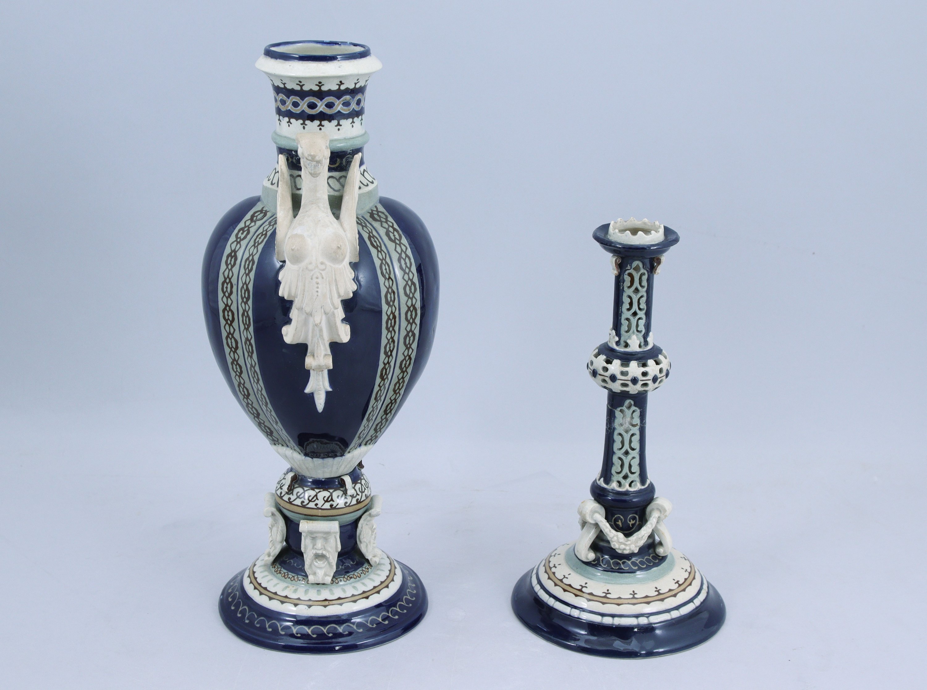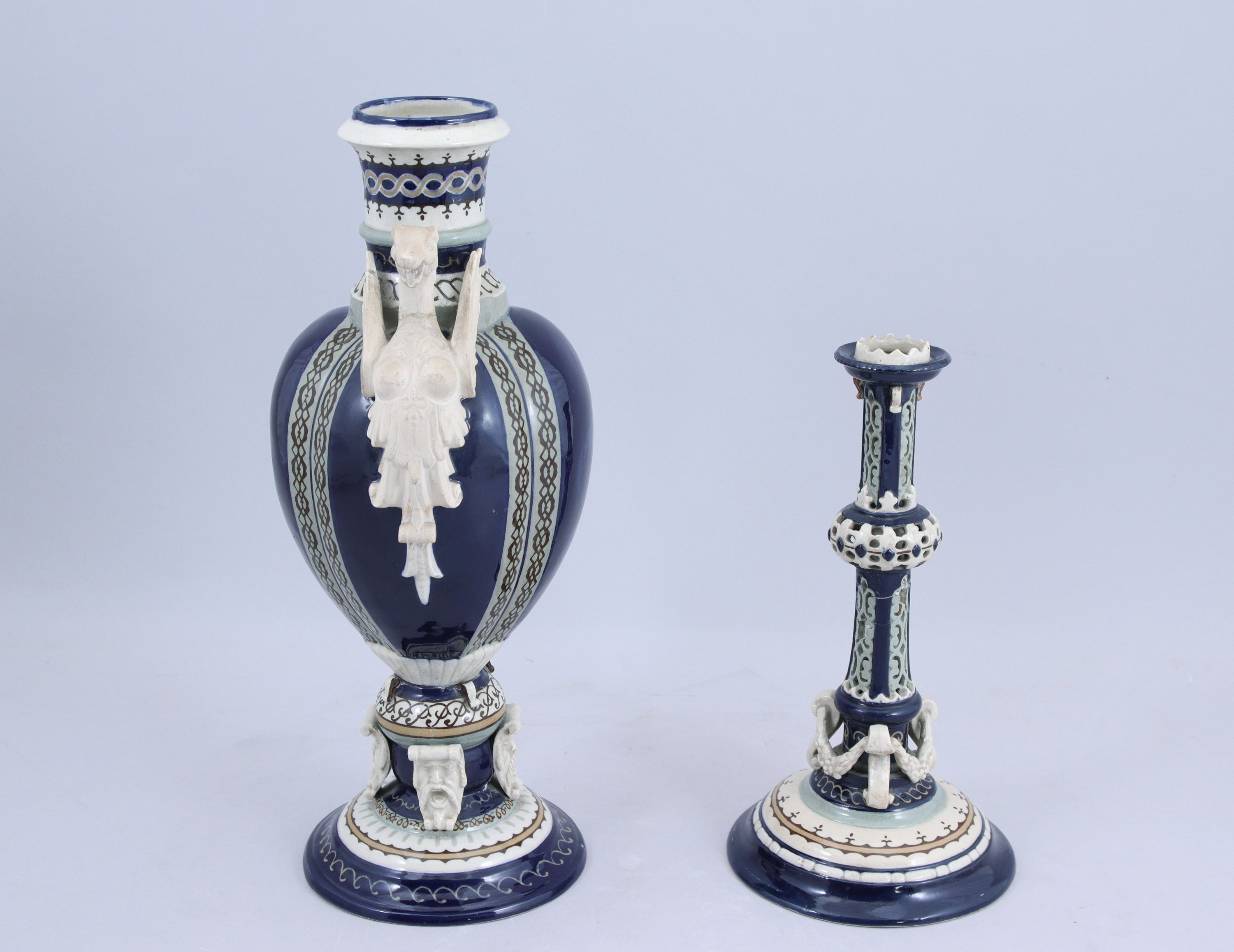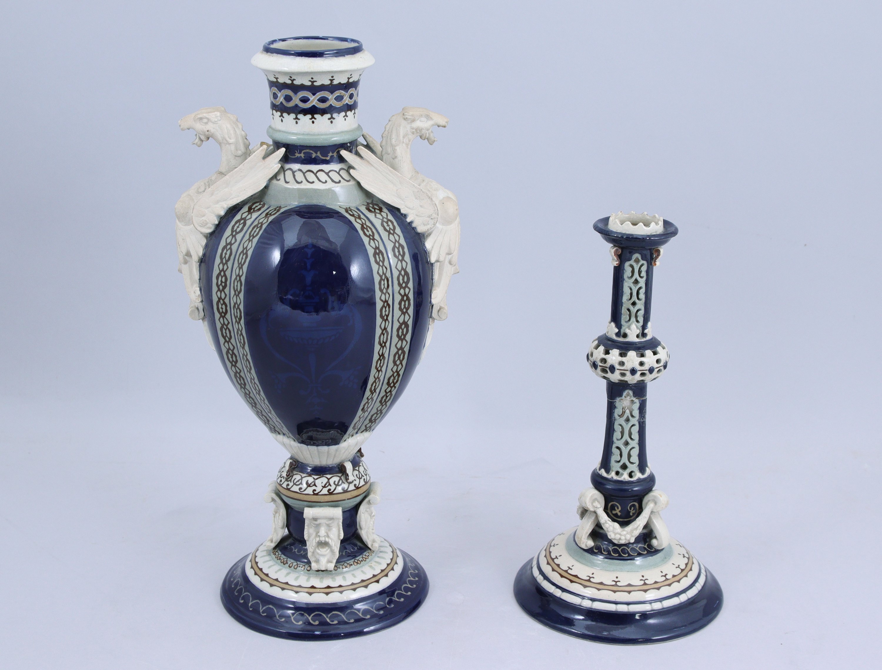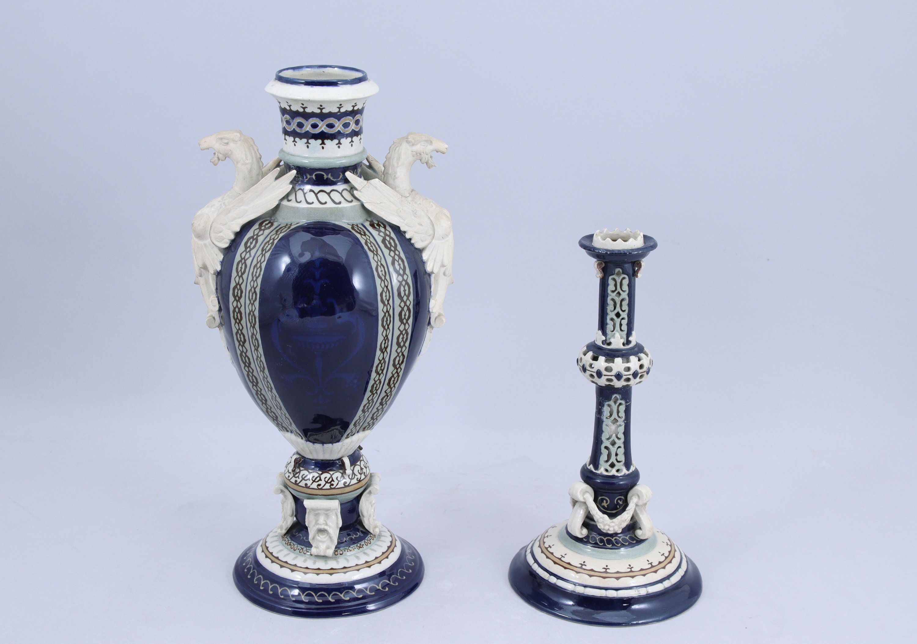 Joint: Prosper Journeau (1852-1921). Bougeoir en faïence à fond bleu, le fût ajouré cerclé d'un ombilic, guirlandes feuillagées en alternance de console. Marqué "JP" et en creux 1885. Haut.26 Diam 13,5 cm. (accidents)