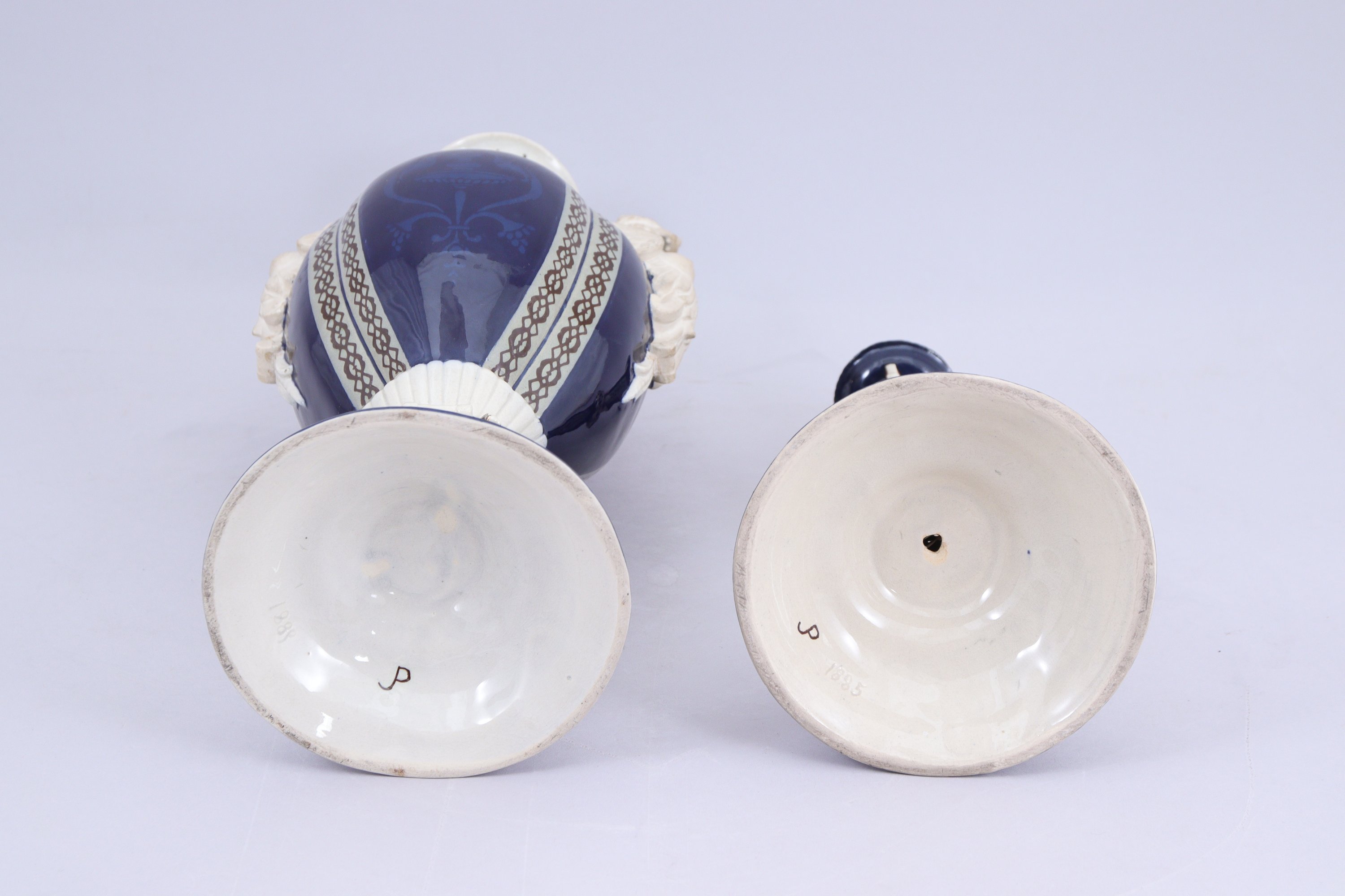 en faïence fine à fond bleu à la façon de Saint Porchaire. Le col à décor d'une frise d'entrelacs, deux anses en forme de griffons ailés au buste de femme. La panse à décor d'un lambrequin entouré de frises. Le pied circulaire entouré de motifs de cuirs anthropomorphes.