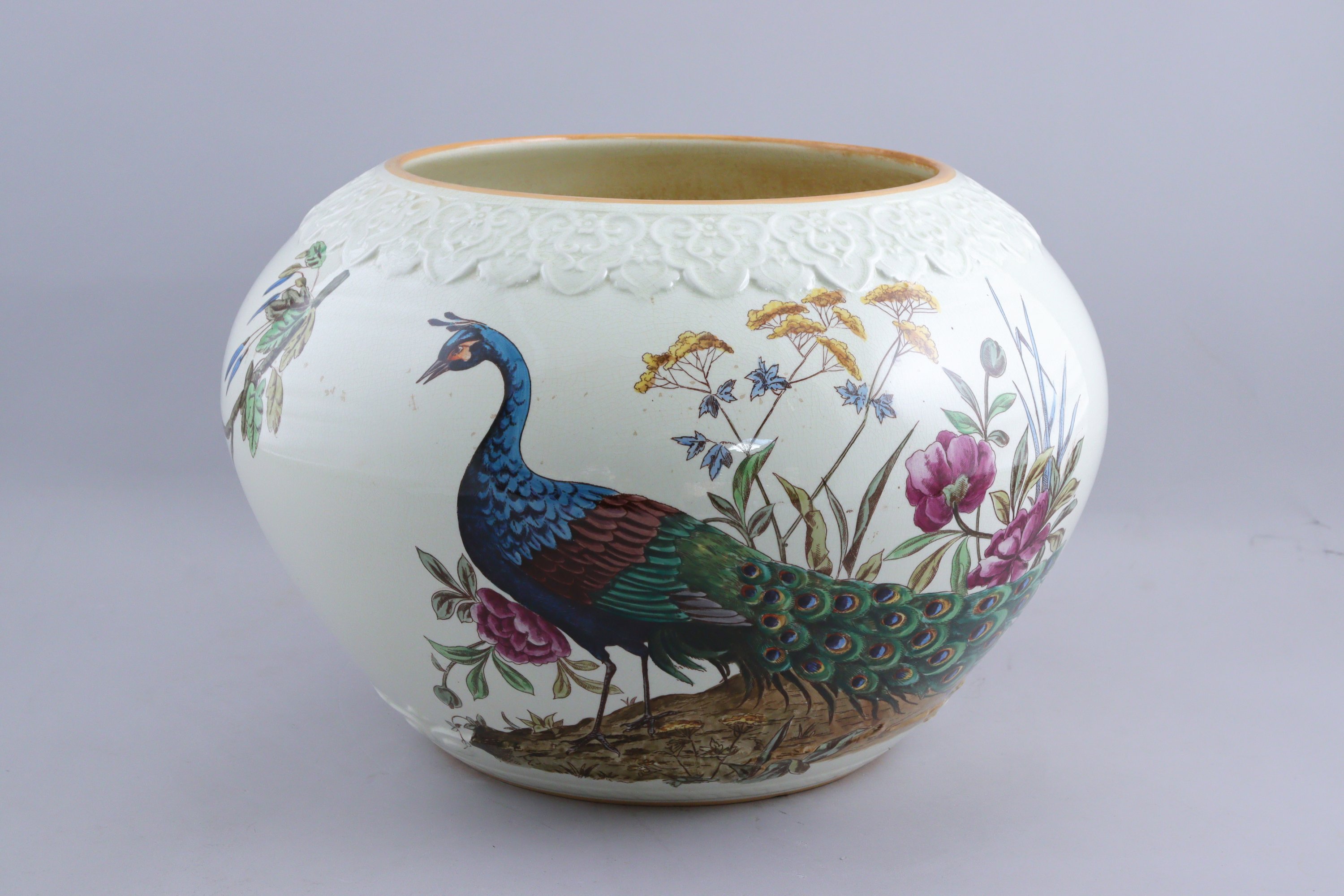 en faïence, à fond blanc craquelé à décor émaillé figurant un paon dans un entourage de feuillage et fleurs. La lèvre à décor en relief d'une frise.
