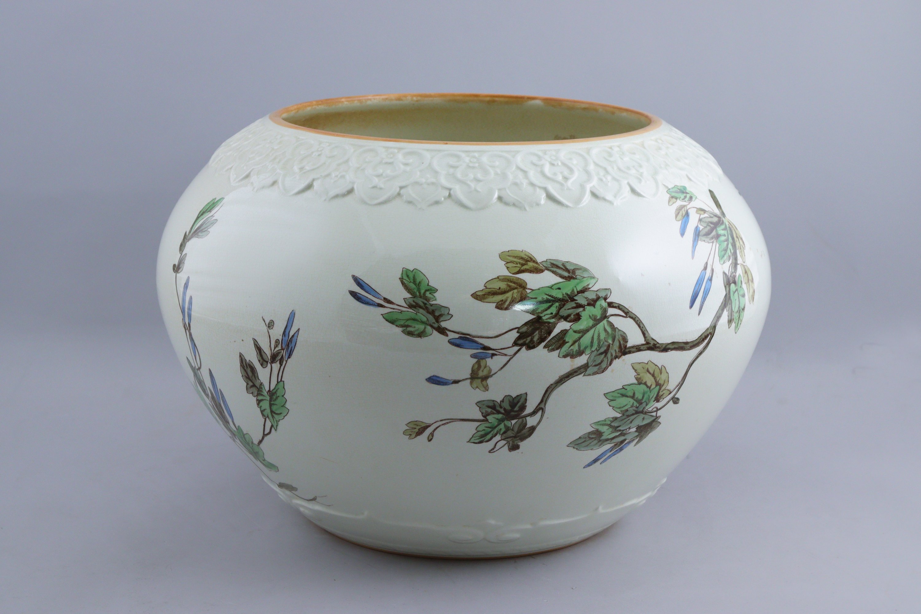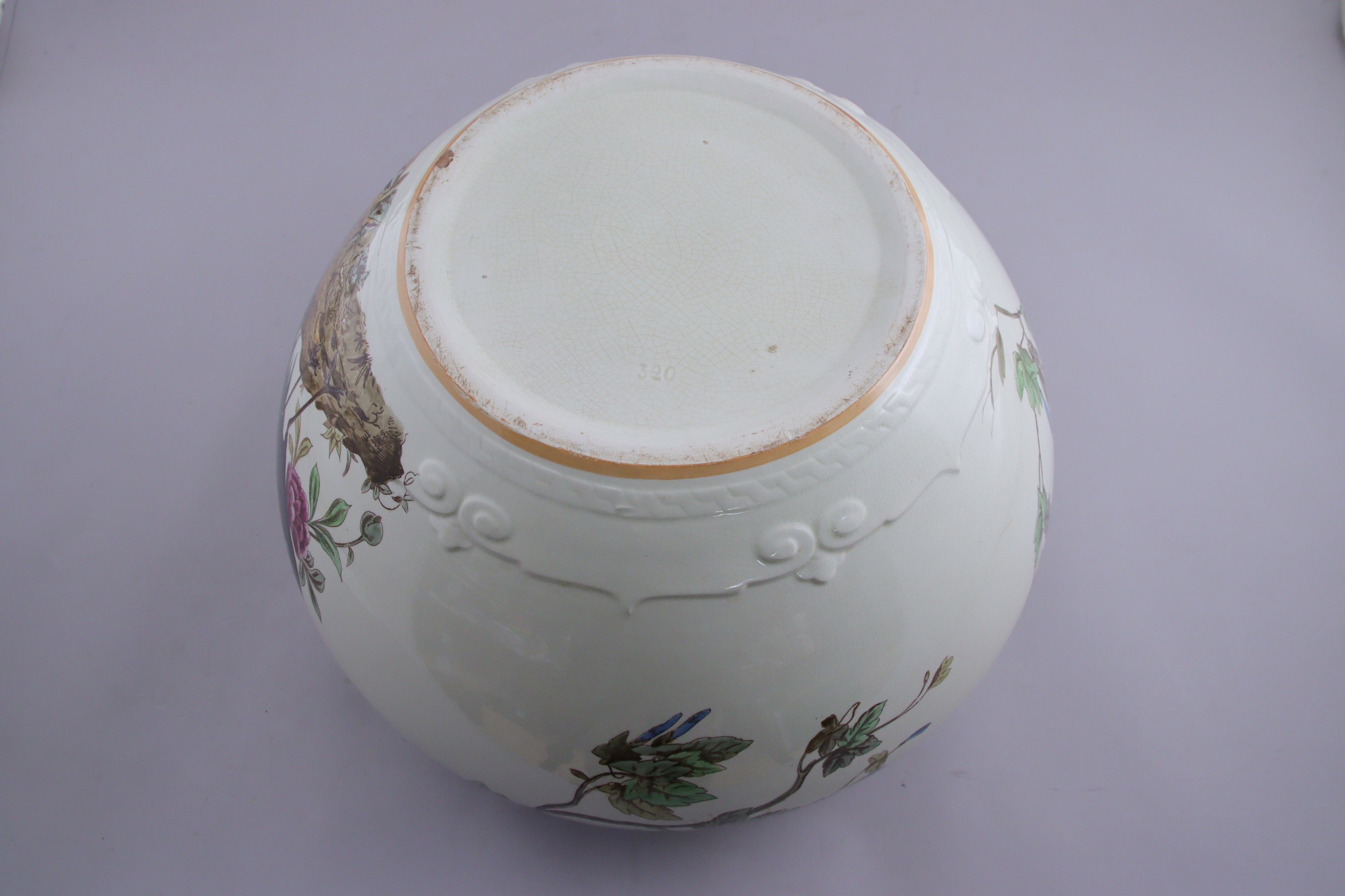 Important cache-pot en faïence, à fond blanc craquelé à décor...