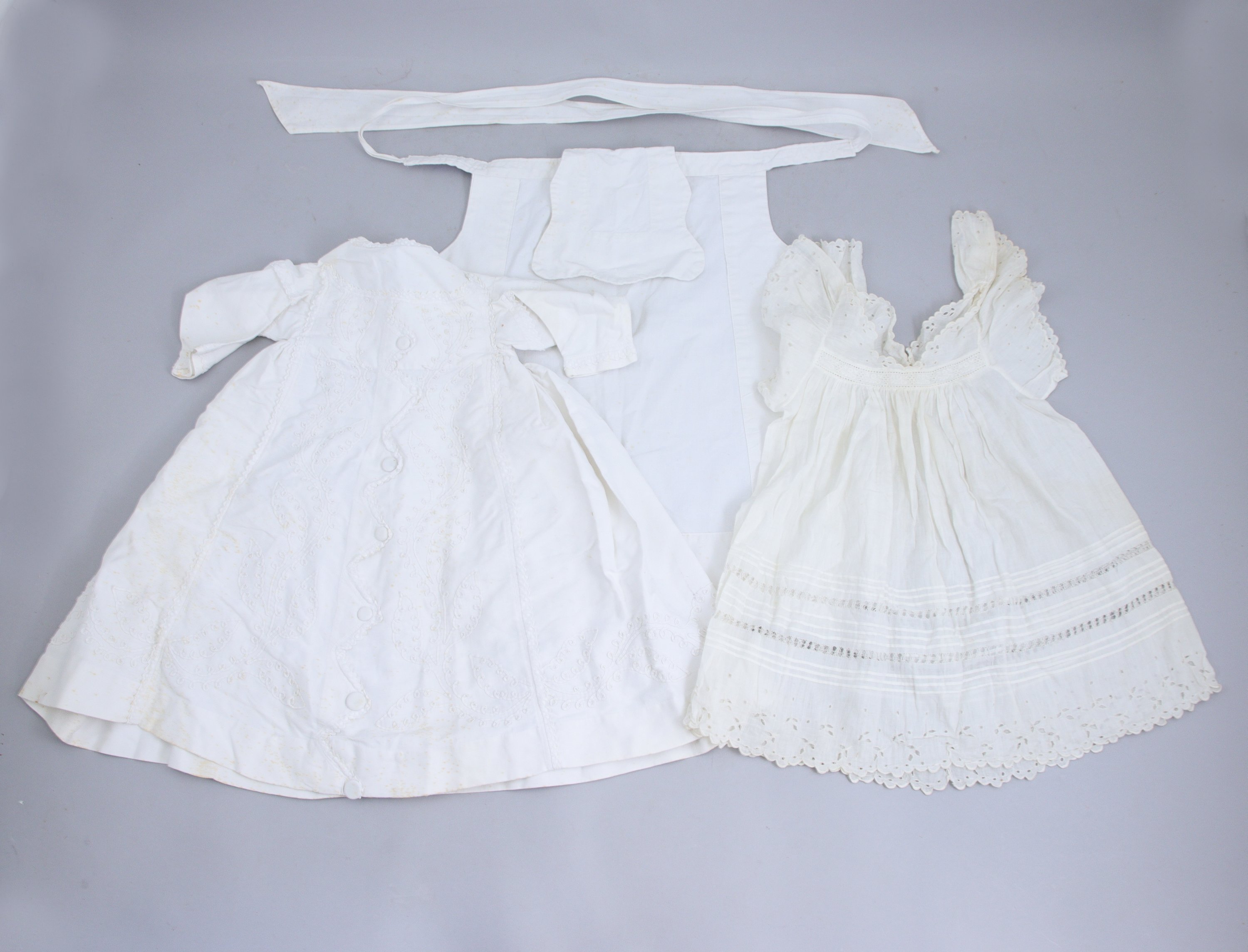 Joints: deux petites robes de baptême et un tablier en coton brodé.