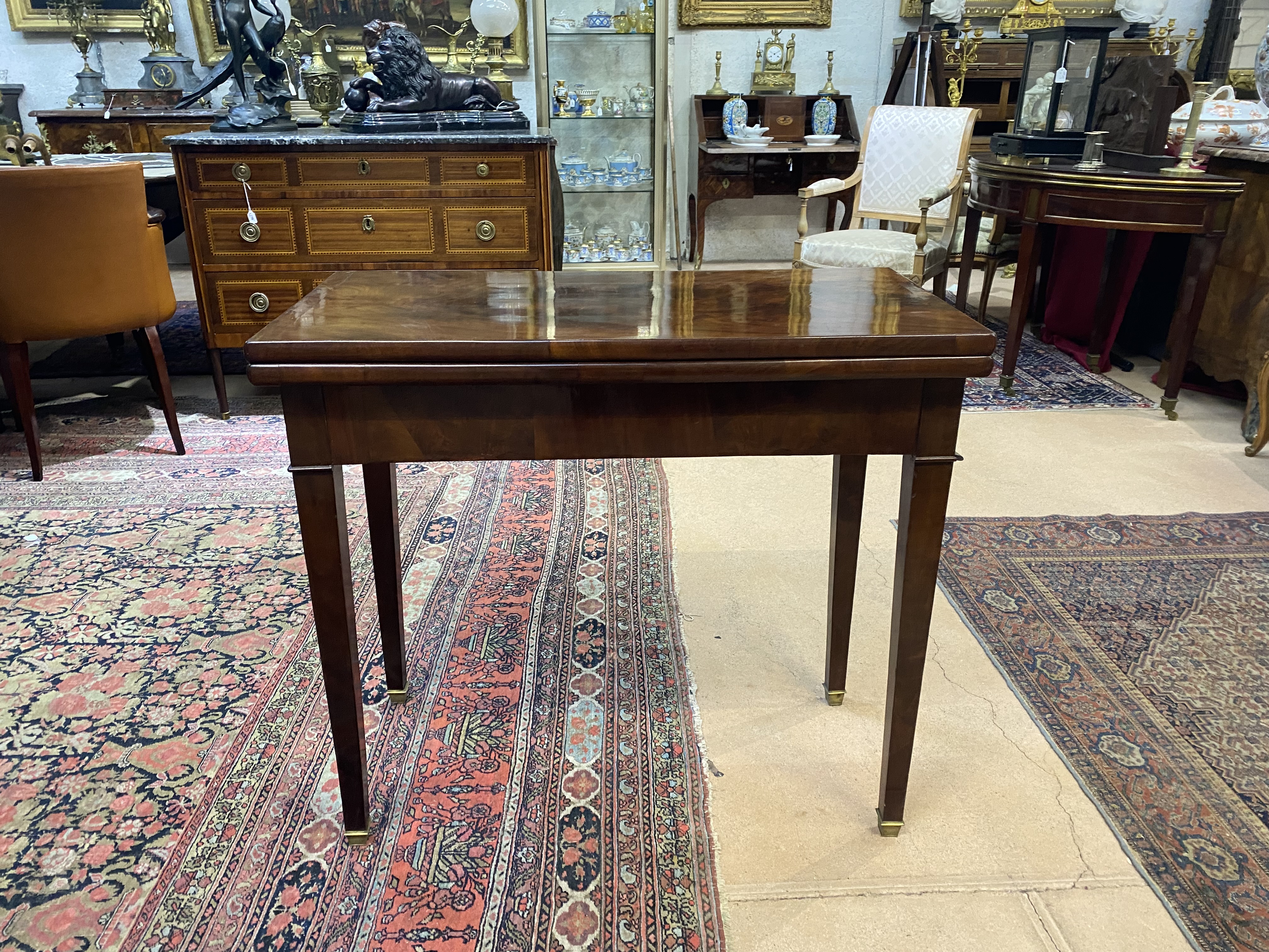 en placage d'acajou, à plateau rectangulaire dépliant. Il découvre un feutre parme entouré d'un motif de grecques. Elle repose sur quatre pieds en gaine.