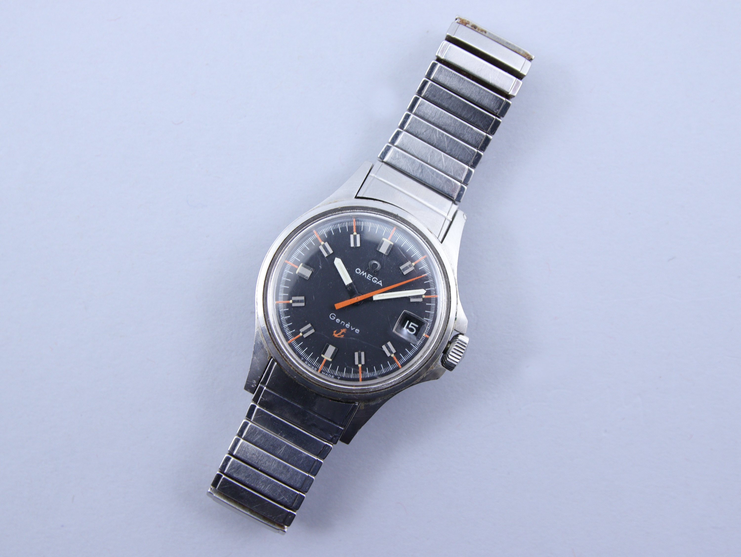 Boitier rond en acier waterproof, cadran à fond noir gradué avec guichet dateur à trois heures, marqué Omega Genève avec une ancre de marine orange.