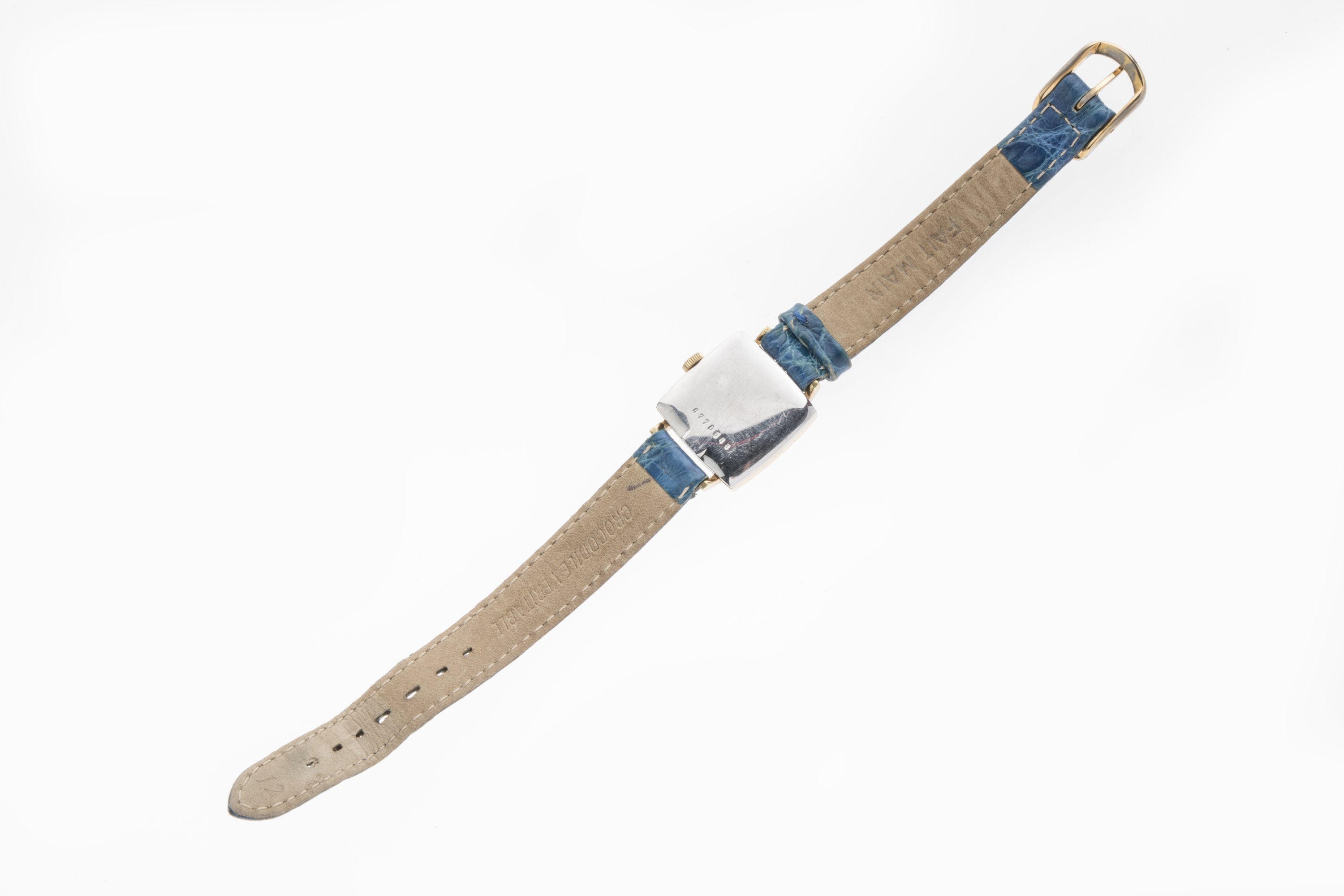 le boîtier en métal doré de forme carrée marqué pour les heures. Remontoir à 3 heures. Bracelet en cuir bleu.