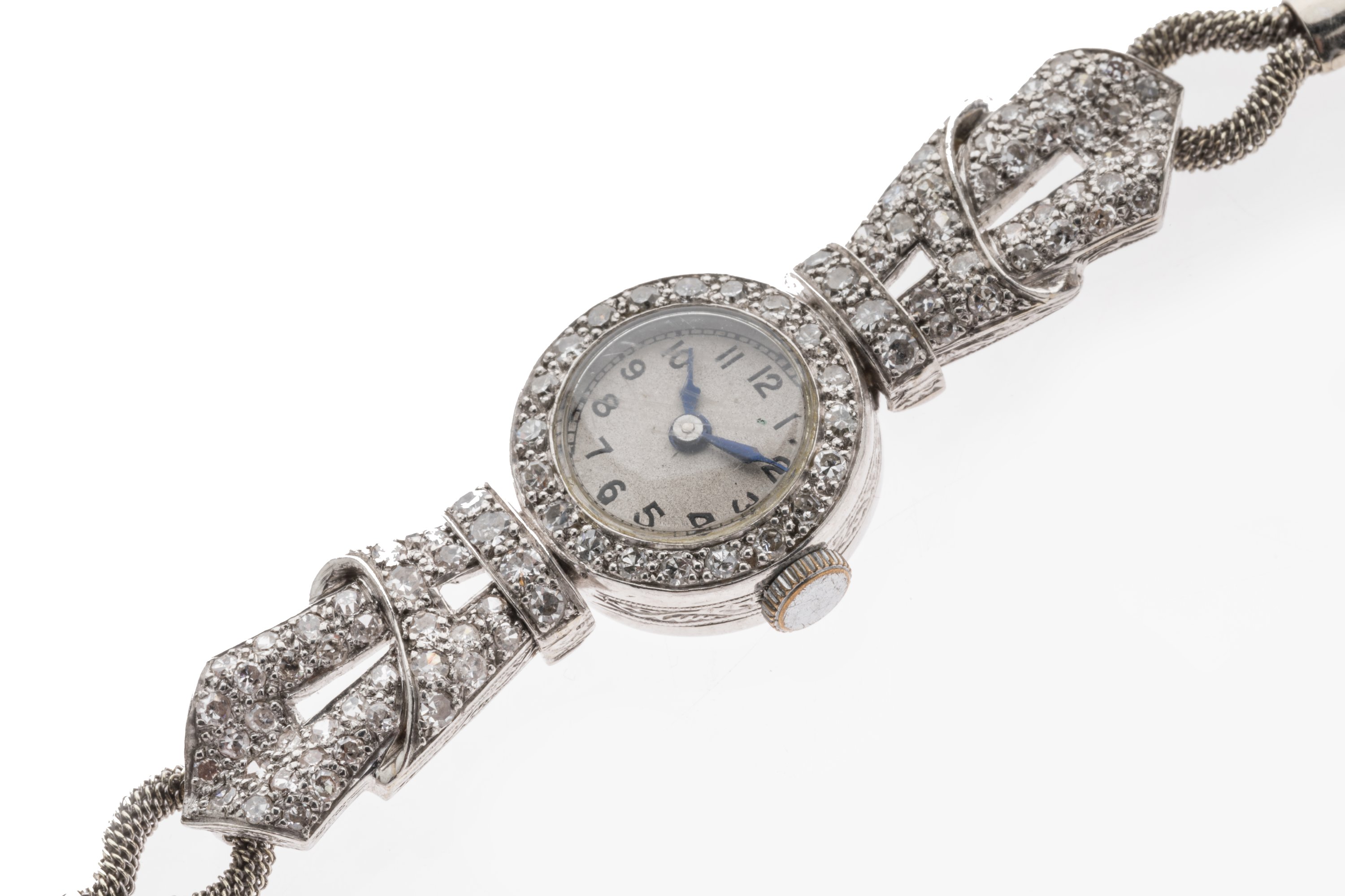 en platine 850 millièmes et or gris 375 millièmes, la montre de forme ronde, le tour de lunette et les attaches sertis de diamants taillés en huit-huit, le bracelet double cordonnets tressés.