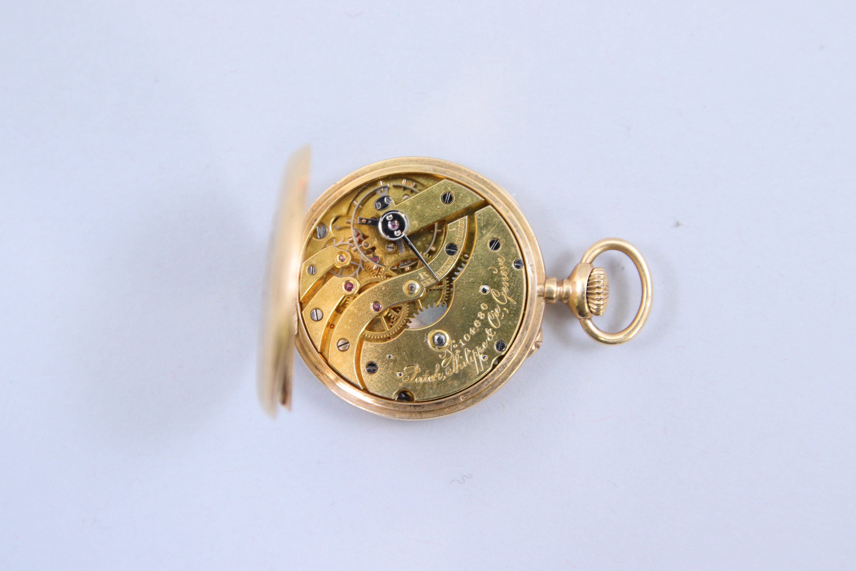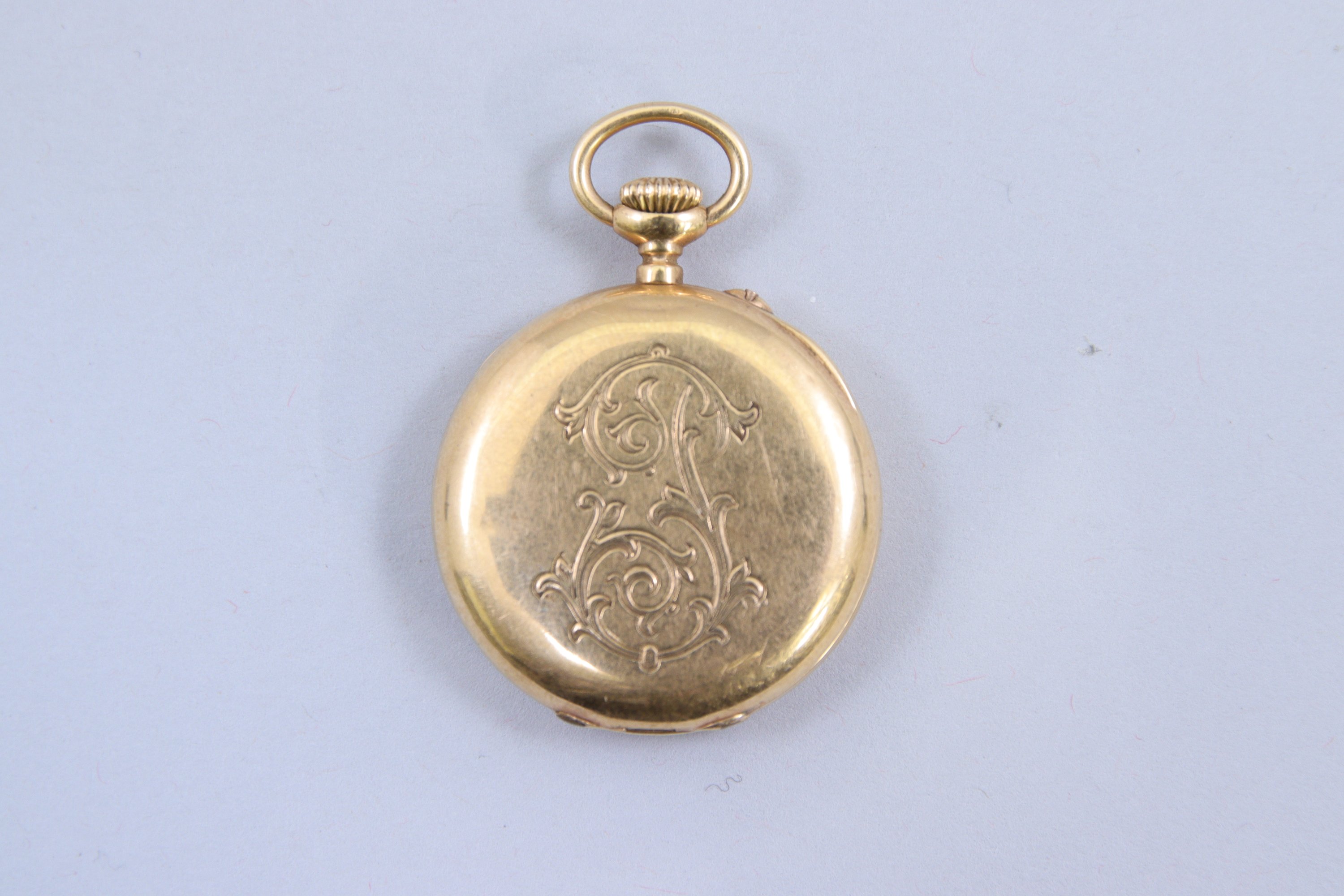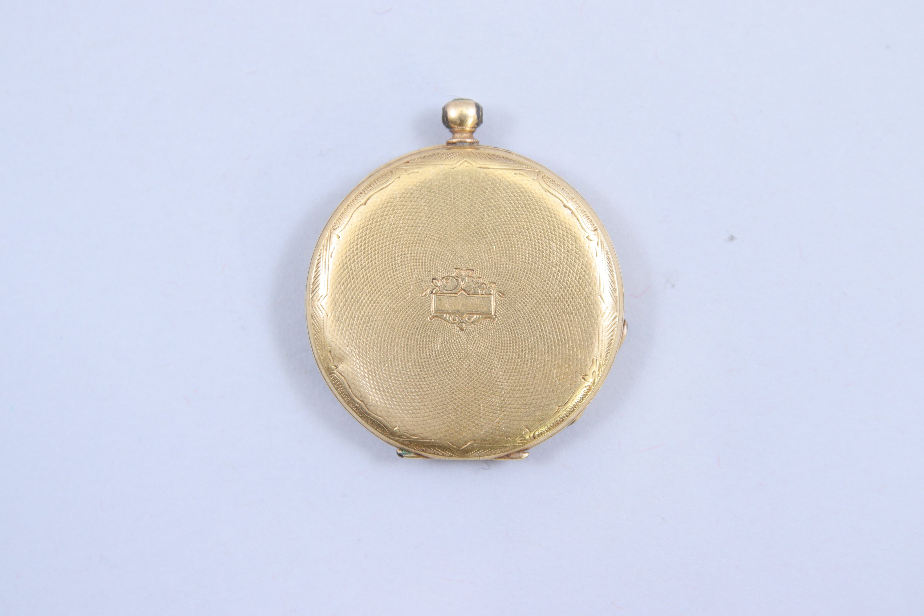 en or jaune 750 millièmes, à remontoir par le devant et le fond monogrammé J. Le cadran émaillé blanc figurant des chiffres romains autour d'un chemin de fer. Bélière amovible. Mouvement mécanique signé et numéroté "104680".