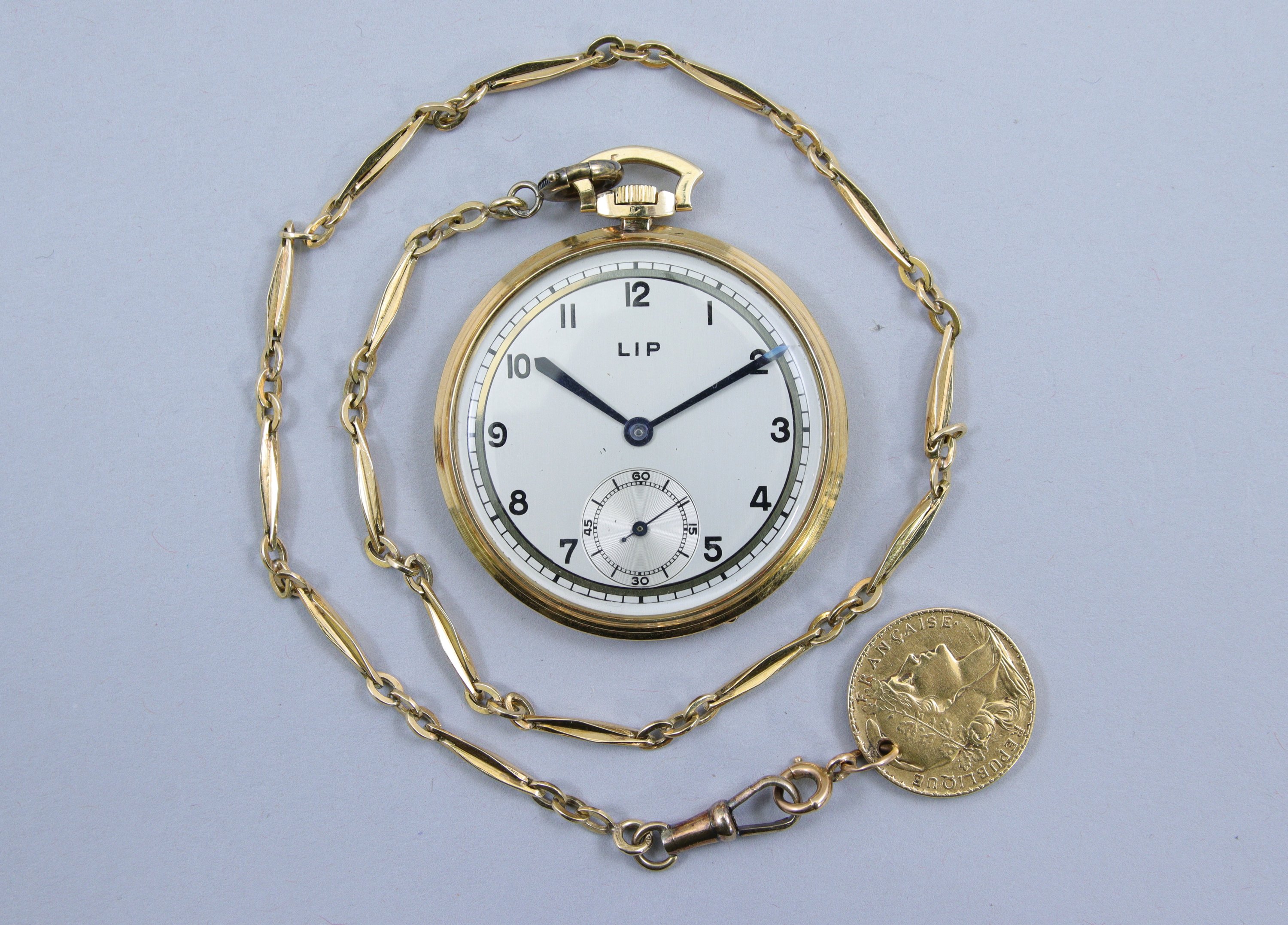 Avec une chaine en or 750 millièmes aux rares motifs de maillons en fuseau, ornée à son extrémité d'un pièce de 20 F or, Marianne 1900, formant porte-photo dans son épaisseur (sans verre).