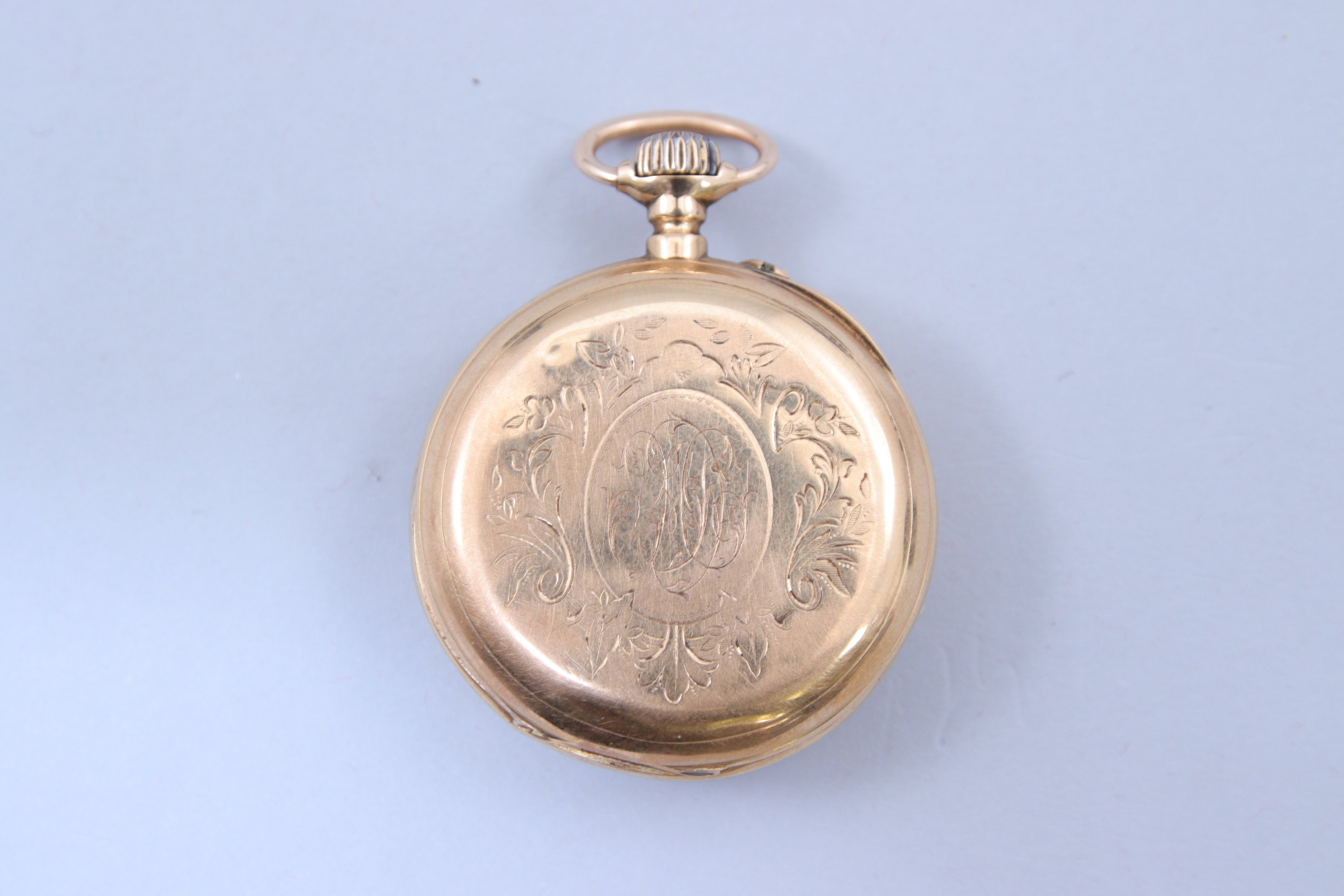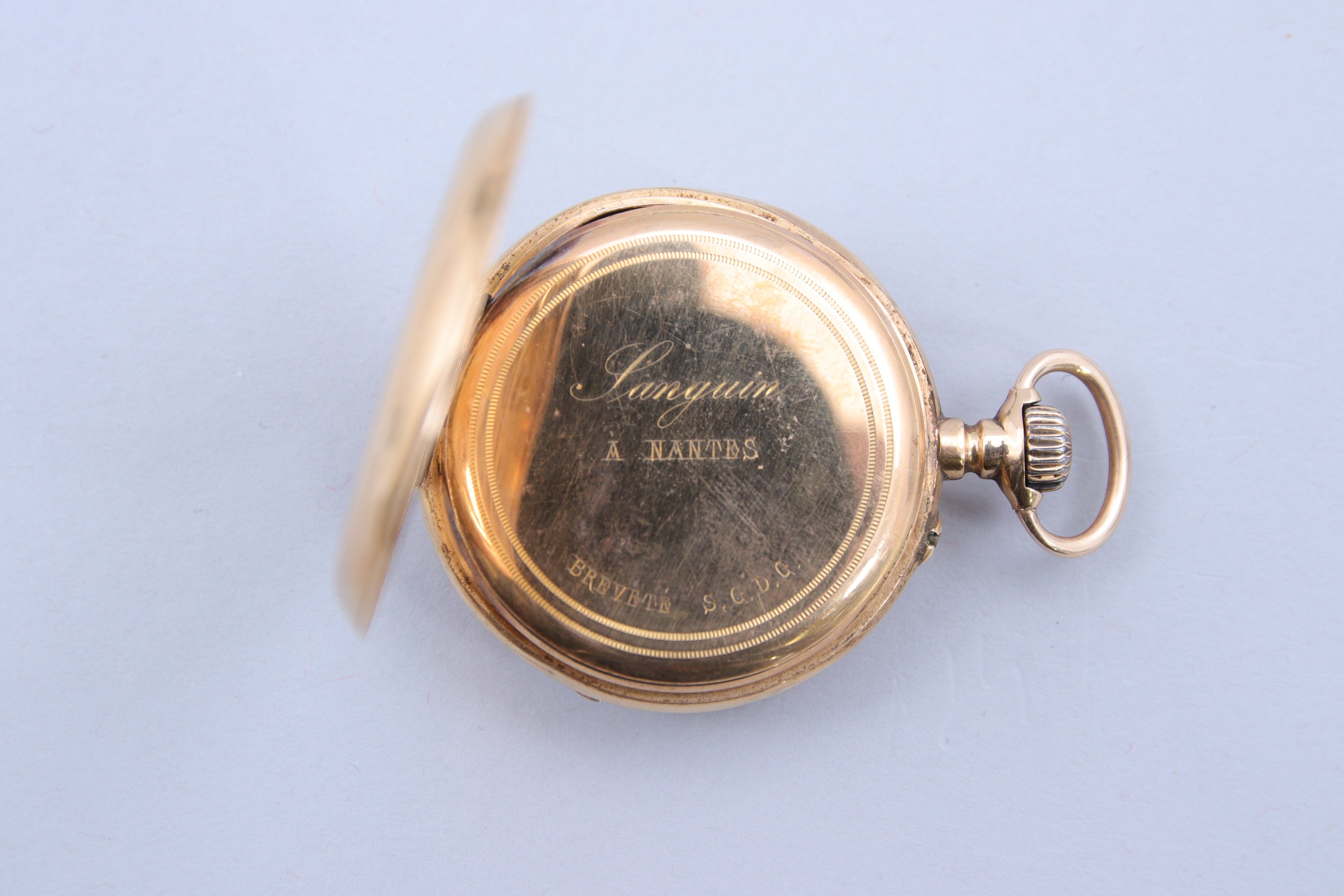 en or jaune 750 millièmes. Le remontoir surmonté par une bélière. La cadran émaillé blanc indiquant les heures en chiffres romains, les minutes par un chemin de fer. Petite trotteuse à six heures. Le revers gravé de frise de feuilles entourant un médaillon monogrammé. Le cache-poussière marqué "Sanguin / à Nantes / Breveté SGDG". Numéroté 1794.