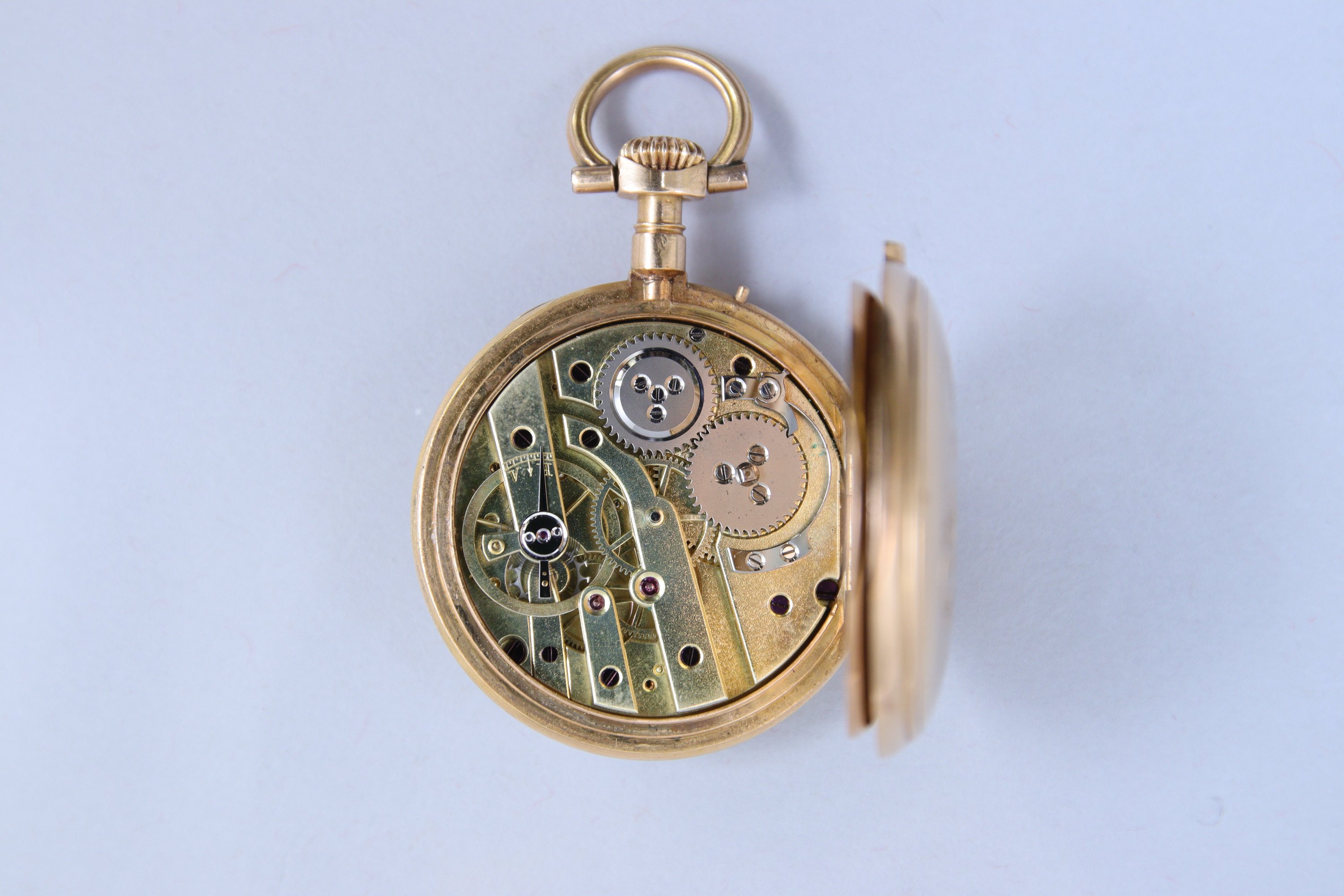 en or jaune 750 millièmes. Le cadran émaillé blanc indiquant les heures en chiffres romains, les minutes en chiffres arabes. Le boitier gravé au revers d'une couronne comtale surmontant le chiffre "M".