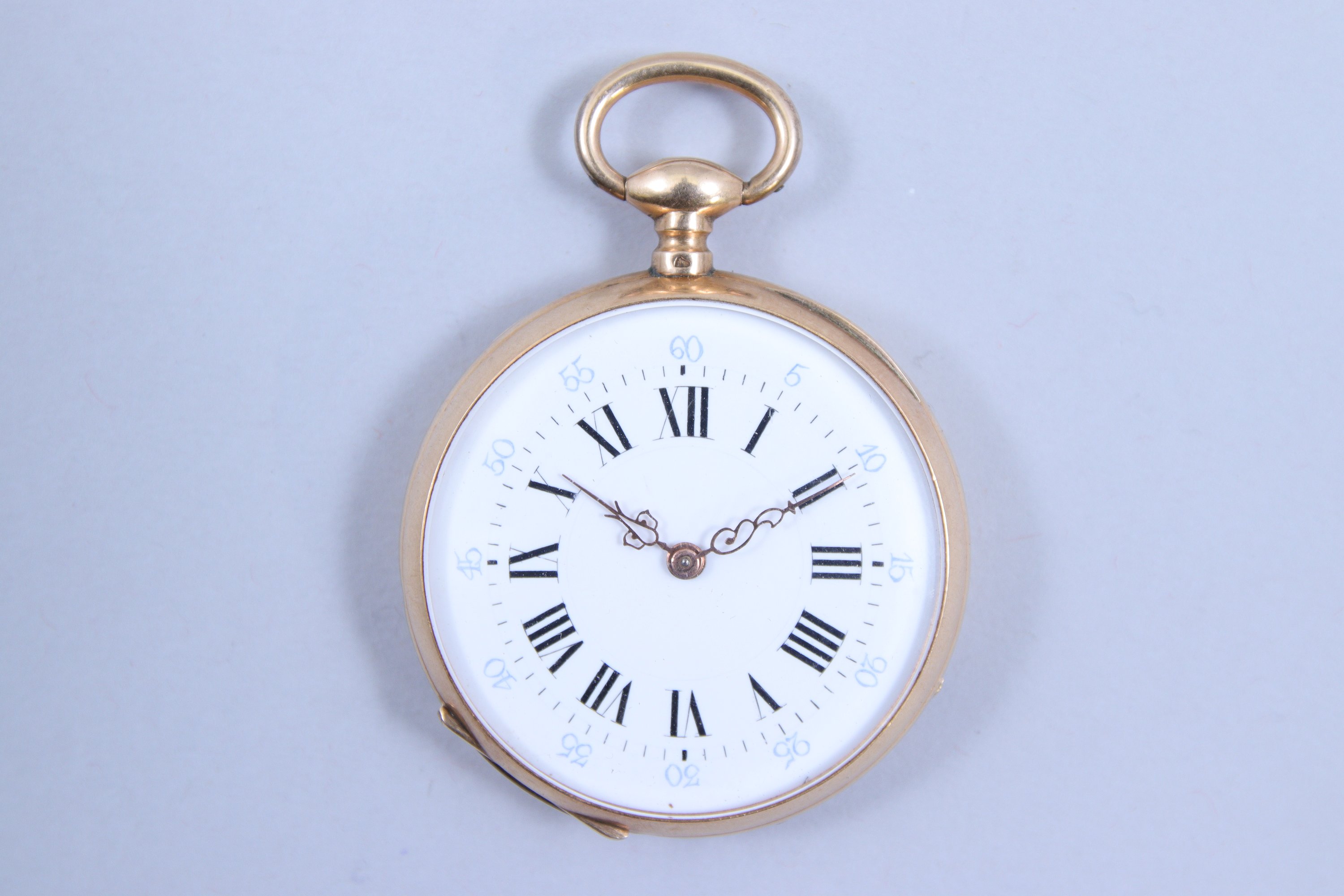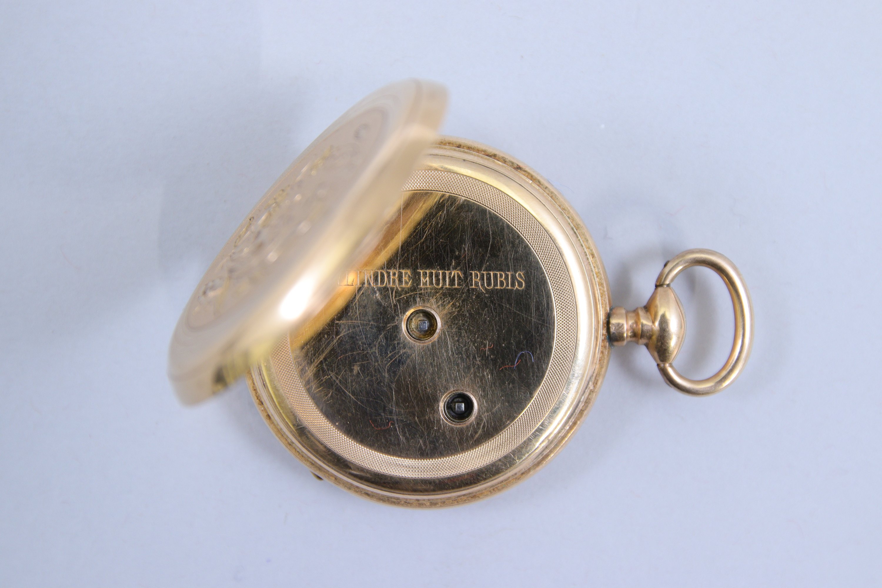 en or jaune 750 millièmes, le cadran émaillé blanc indiquant les heures en chiffres romains, les minutes en chiffres arabes et chemin de fer. Elle est gravée au revers d'un bouquet de fleurs. Bélière en or. Cylindre à huit rubis. Numérotée 64955/6.
