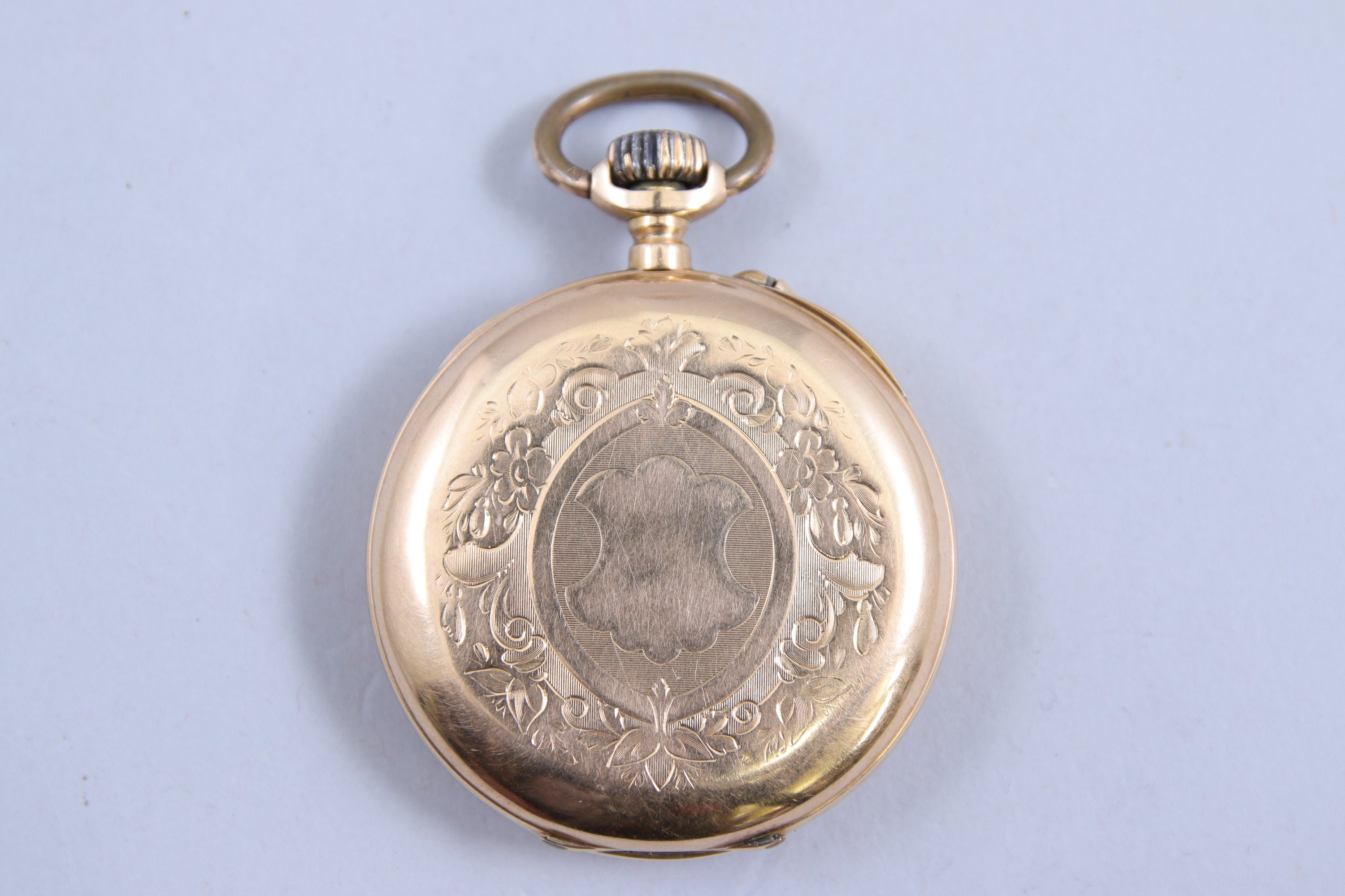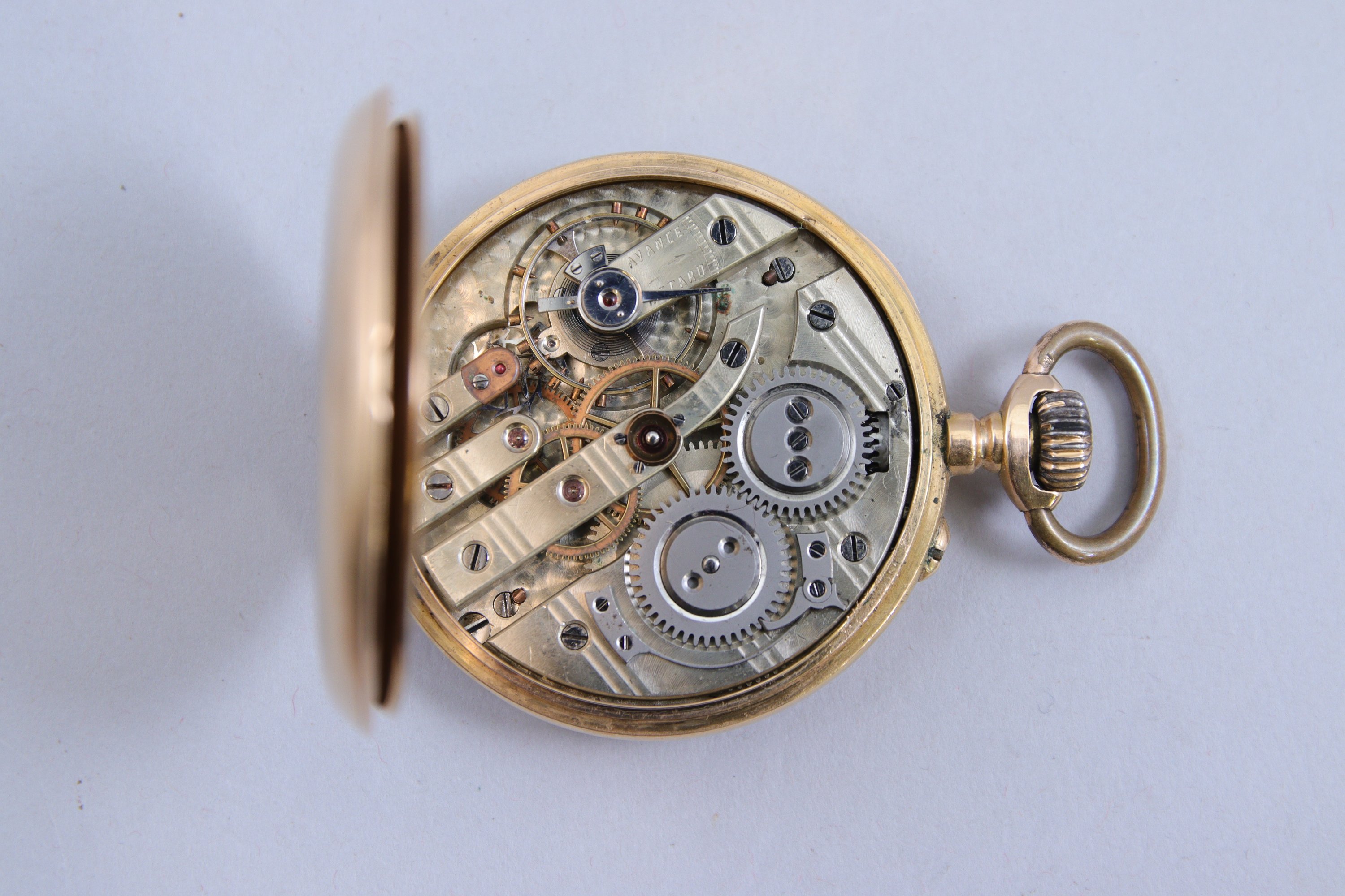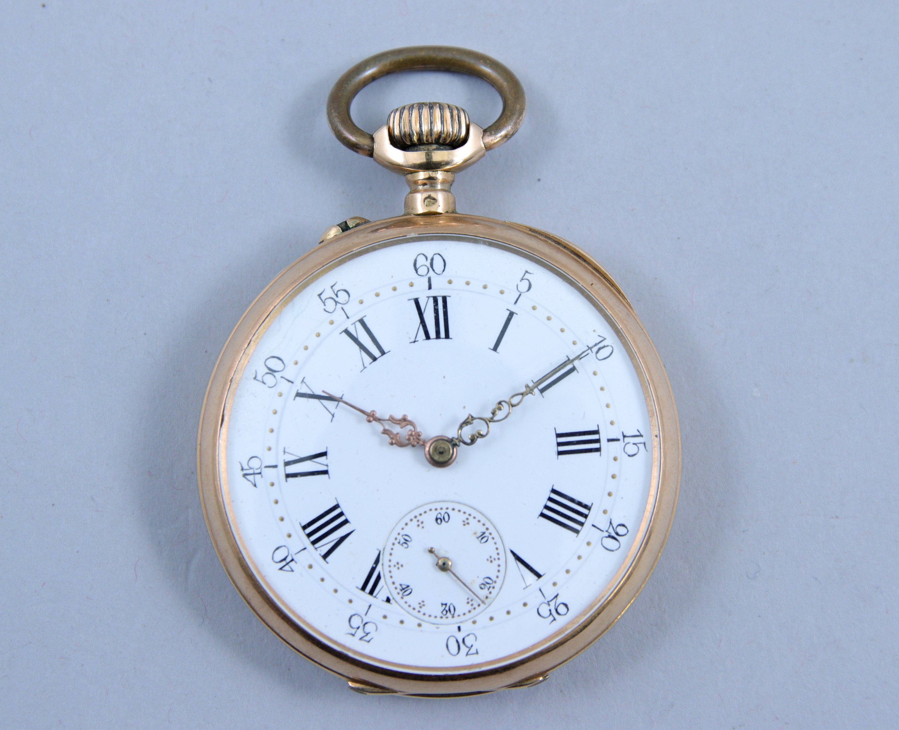 en or jaune 750 millièmes. Le cadran émaillé blanc indique les heures en chiffres romains, les minutes en chiffres arabes et chemin de fer. Petite trotteuse à six heures. Bélière et remontoir à 12 heures. Au revers, elle est décorée d'un cuir inscrit dans un médaillon entouré de rinceaux feuillagés. Sur le cache poussière est marqué "Ancre ligne droite / spirale Breguet / balancier compensateur / 19 rubis". Numérotée 308.