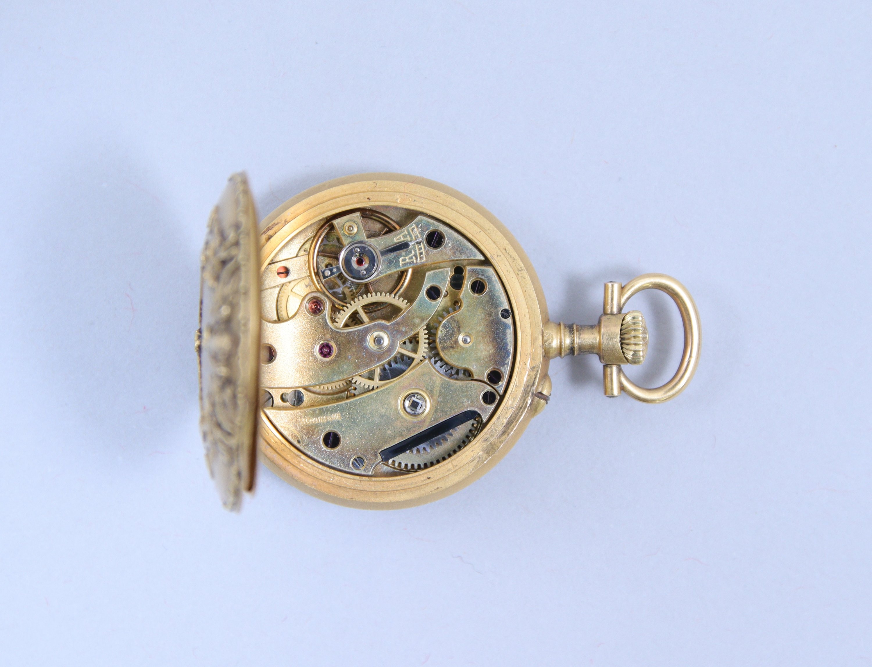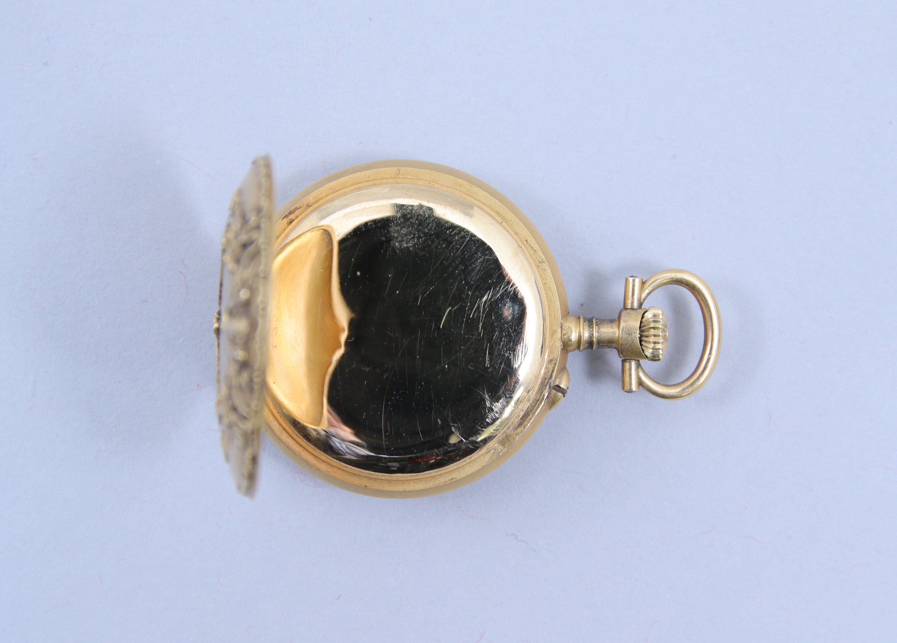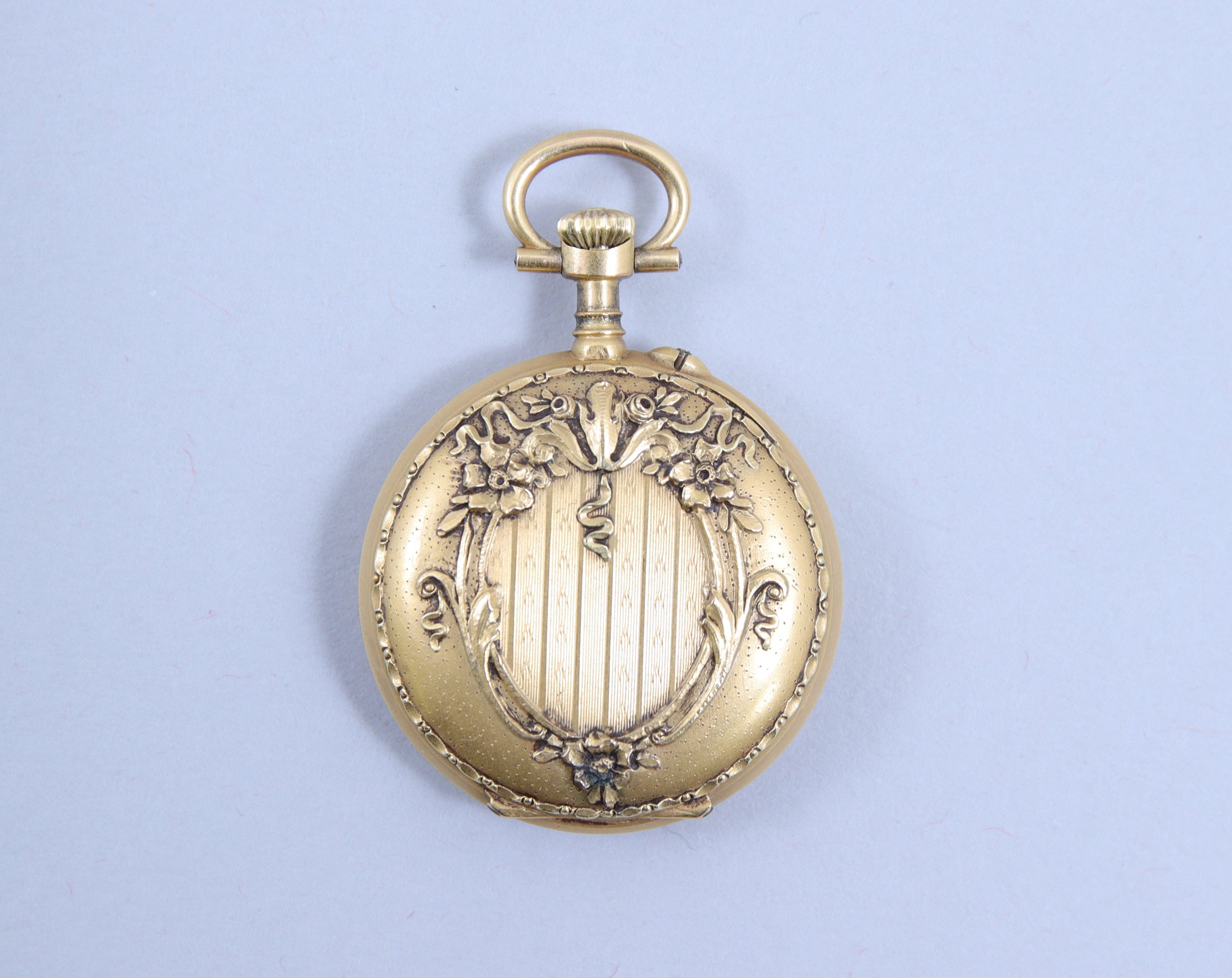 en or jaune 750 millièmes, le cadran circulaire émaillé avec les heures en chiffres arabes et chemin de fer pour les minutes. Remontoir à midi. Le boitier orné d'un médaillon de style Art Nouveau 1900.