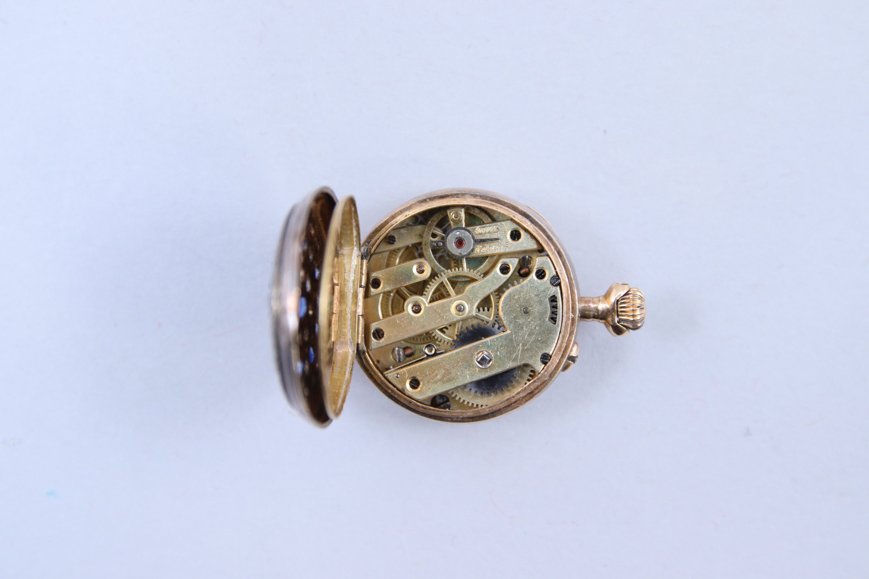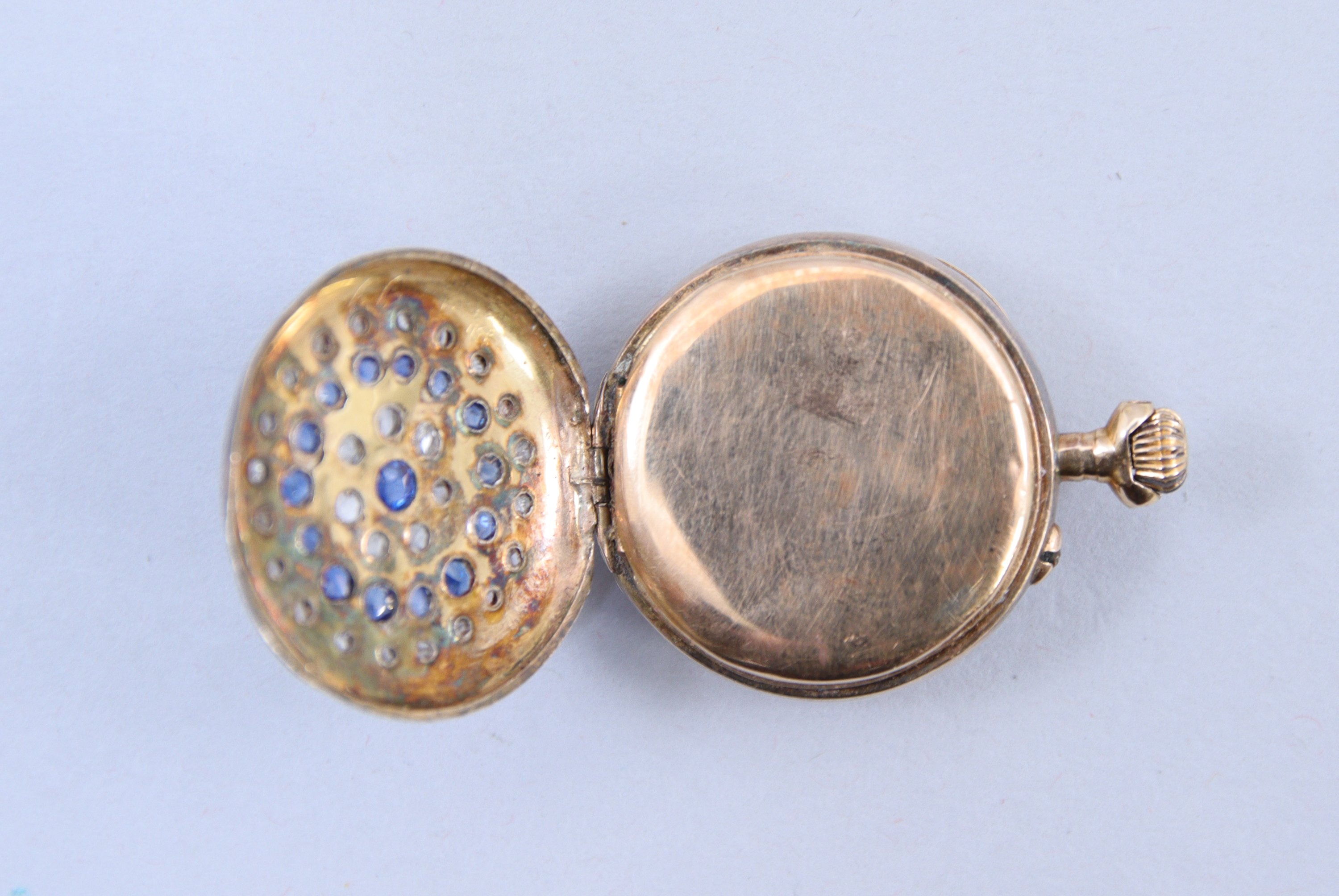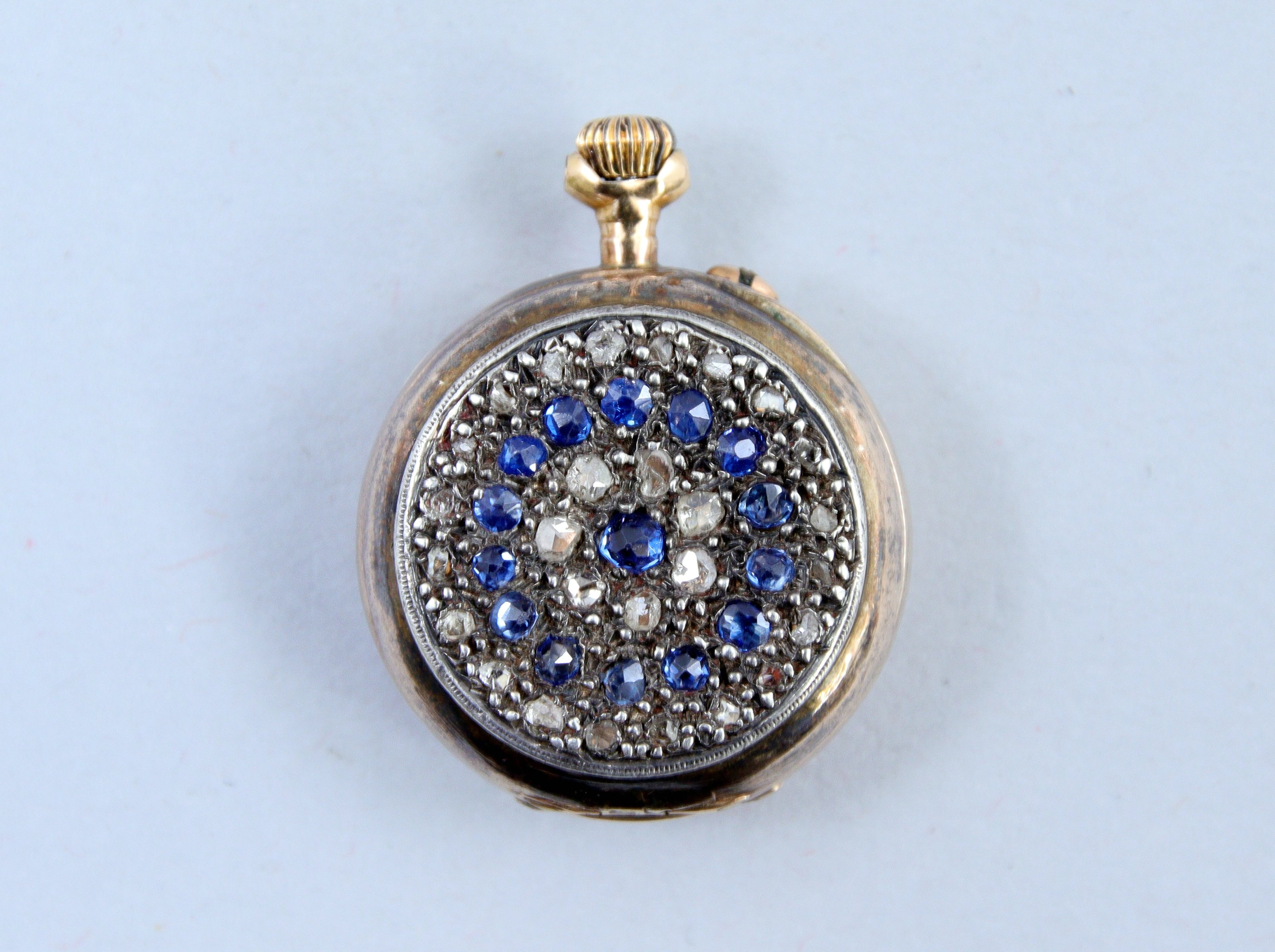 en or jaune 750 millièmes. Le cadran blanc indiquant les heures en chiffres arabes, les minutes par des pointillés. Le revers serti de petits diamants et pierres bleues.