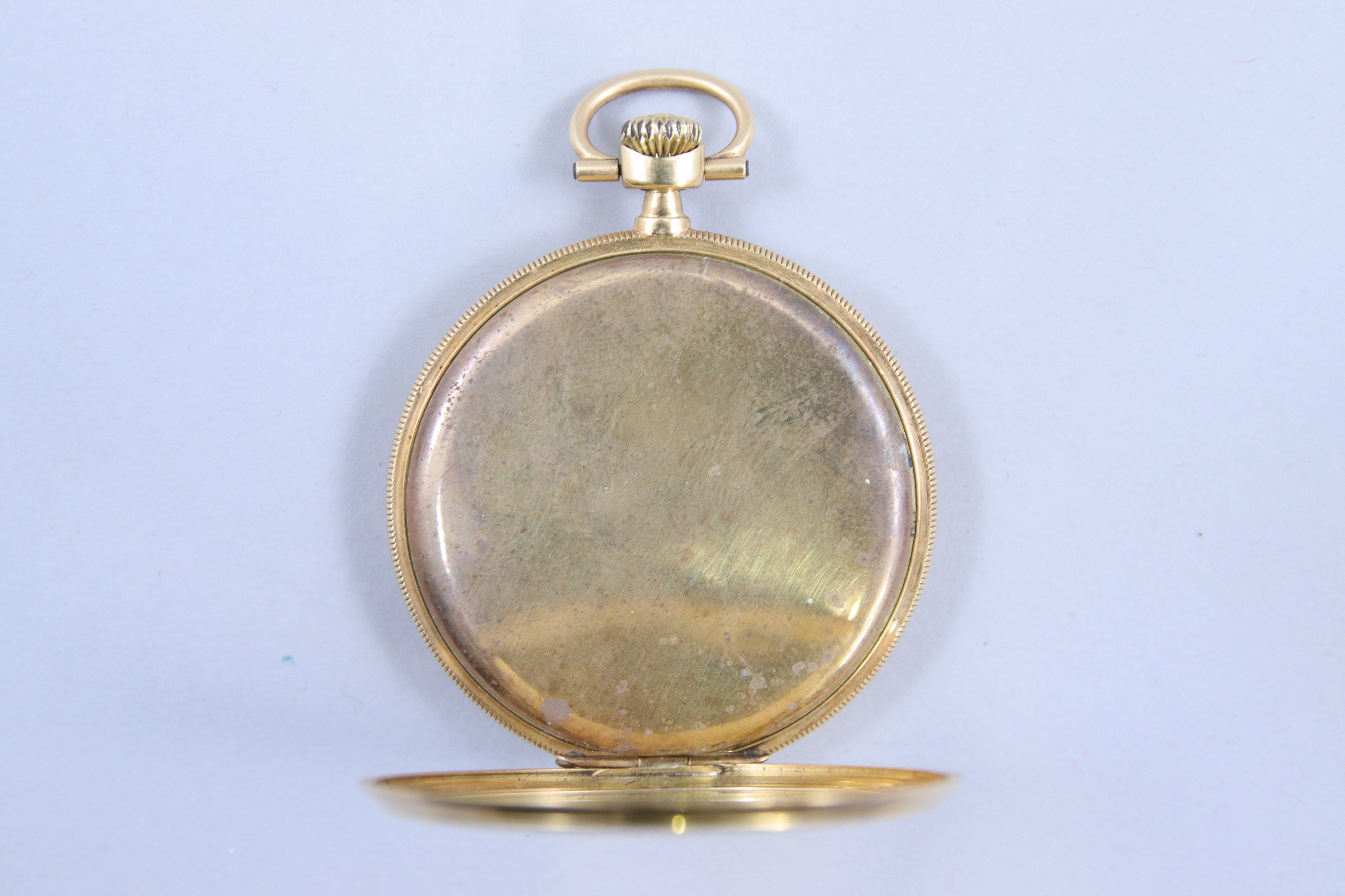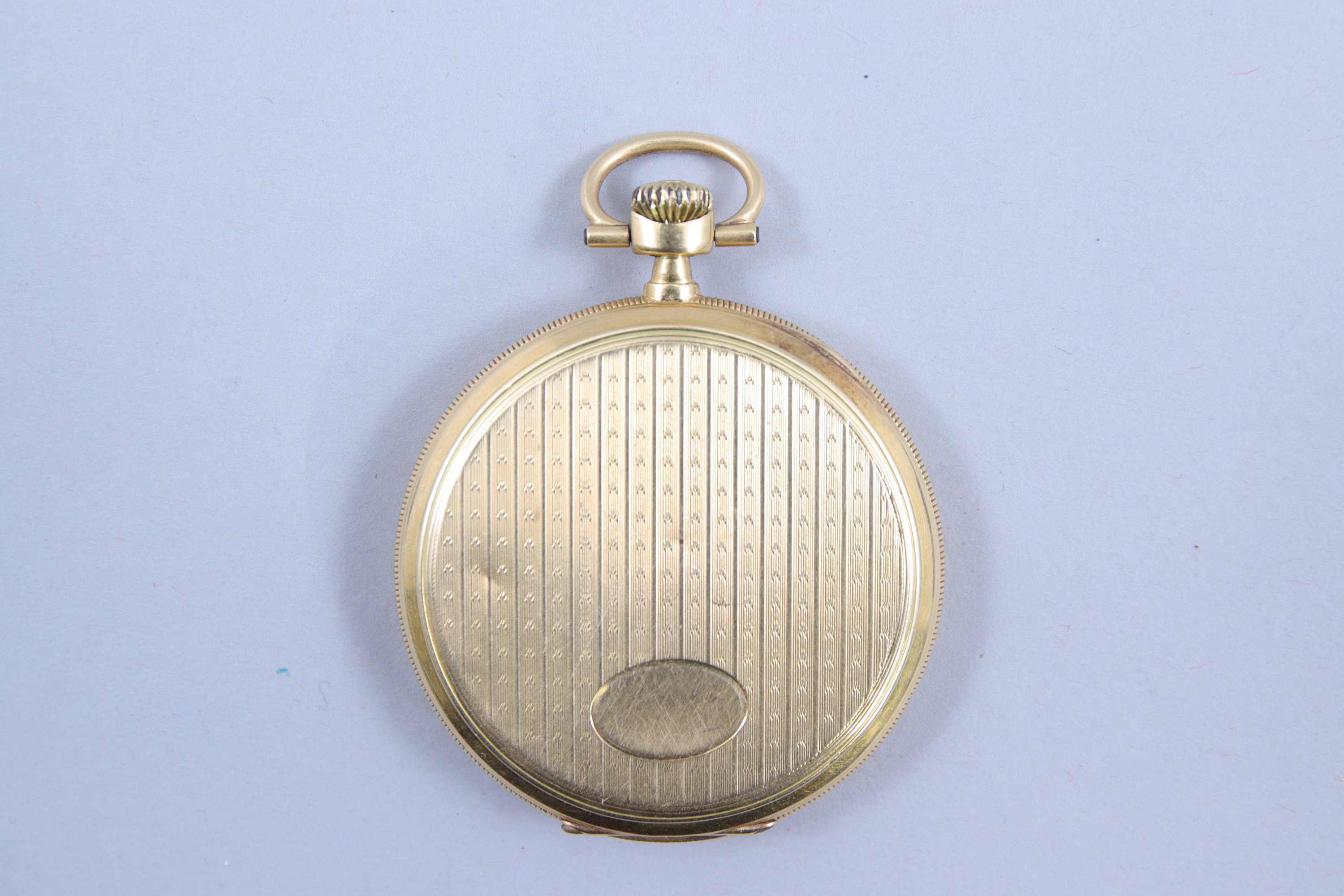en or jaune 750 millièmes. Le cadran champagne indiquant les heures en chiffres arabes, les minutes par un chemin de fer. Trotteuse à 6 heures. Bélière. Le revers guilloché. Numérotée "1853".