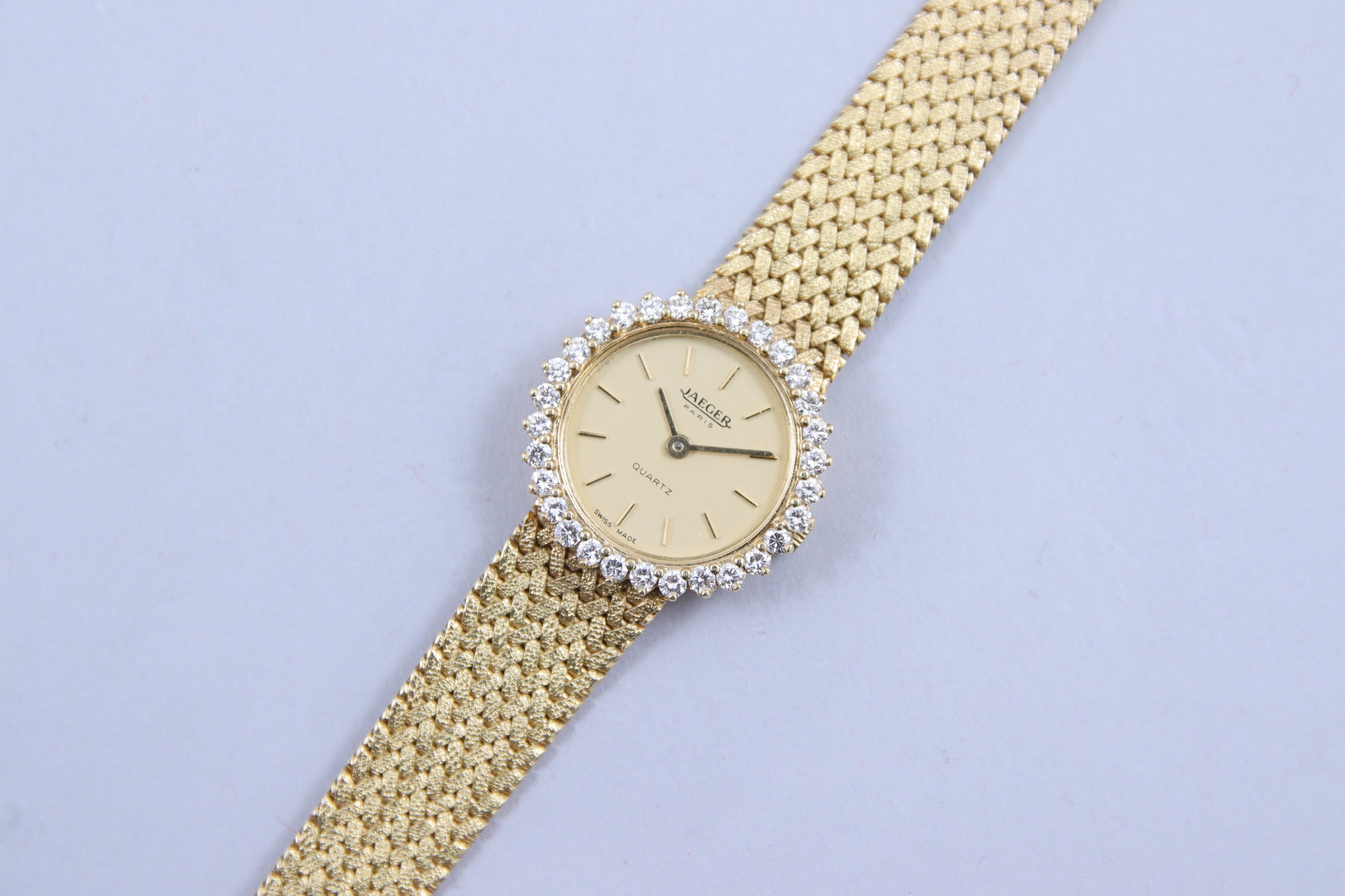 en or jaune 750 millièmes. Boîtier rond orné de 30 petits diamants. Cadran avec index en or poli. Bracelet tressé en or jaune 750 millièmes avec fermoir déployant.