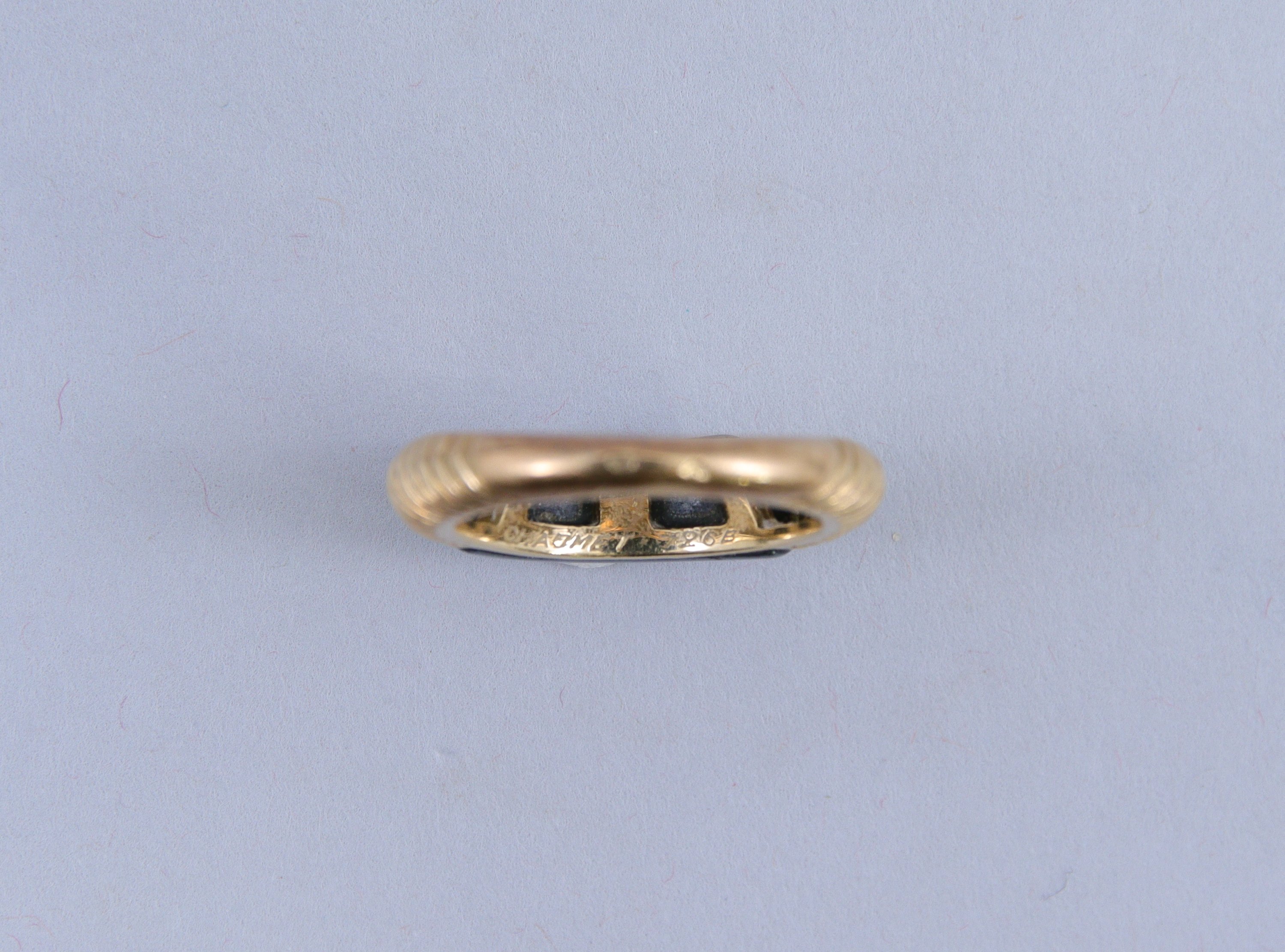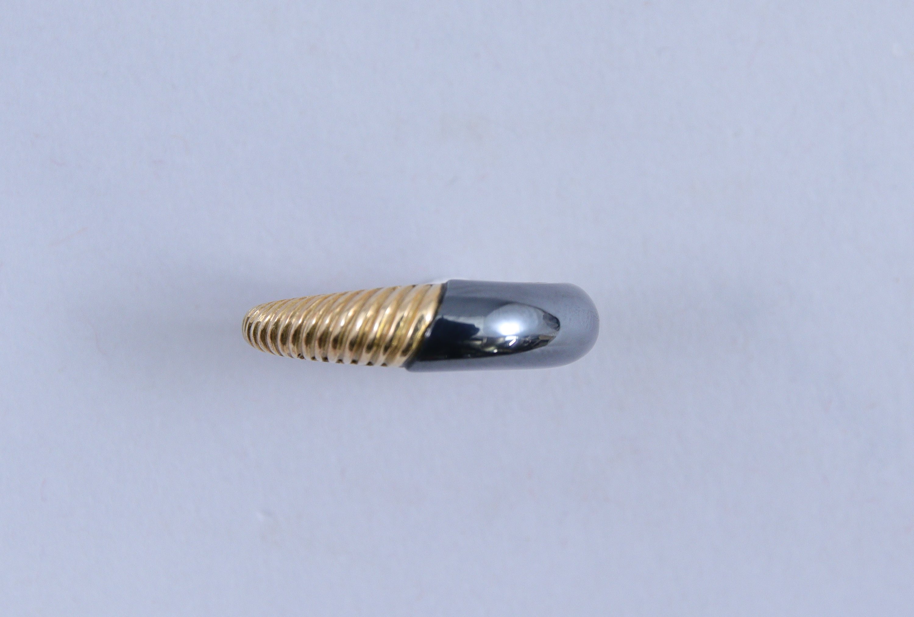 en or jaune 750 millièmes, le centre orné d'un motif en hématite bombé entre des godrons.