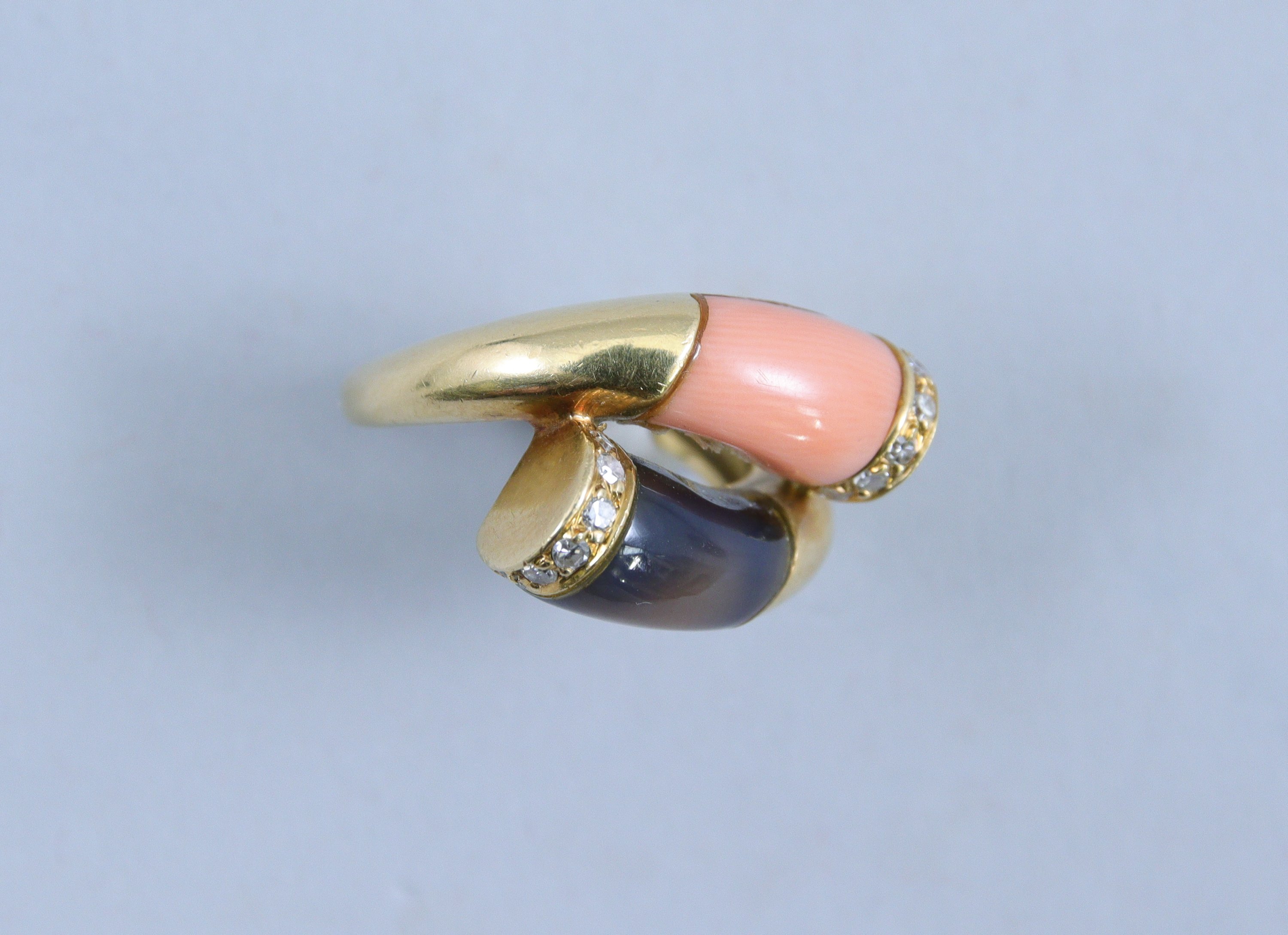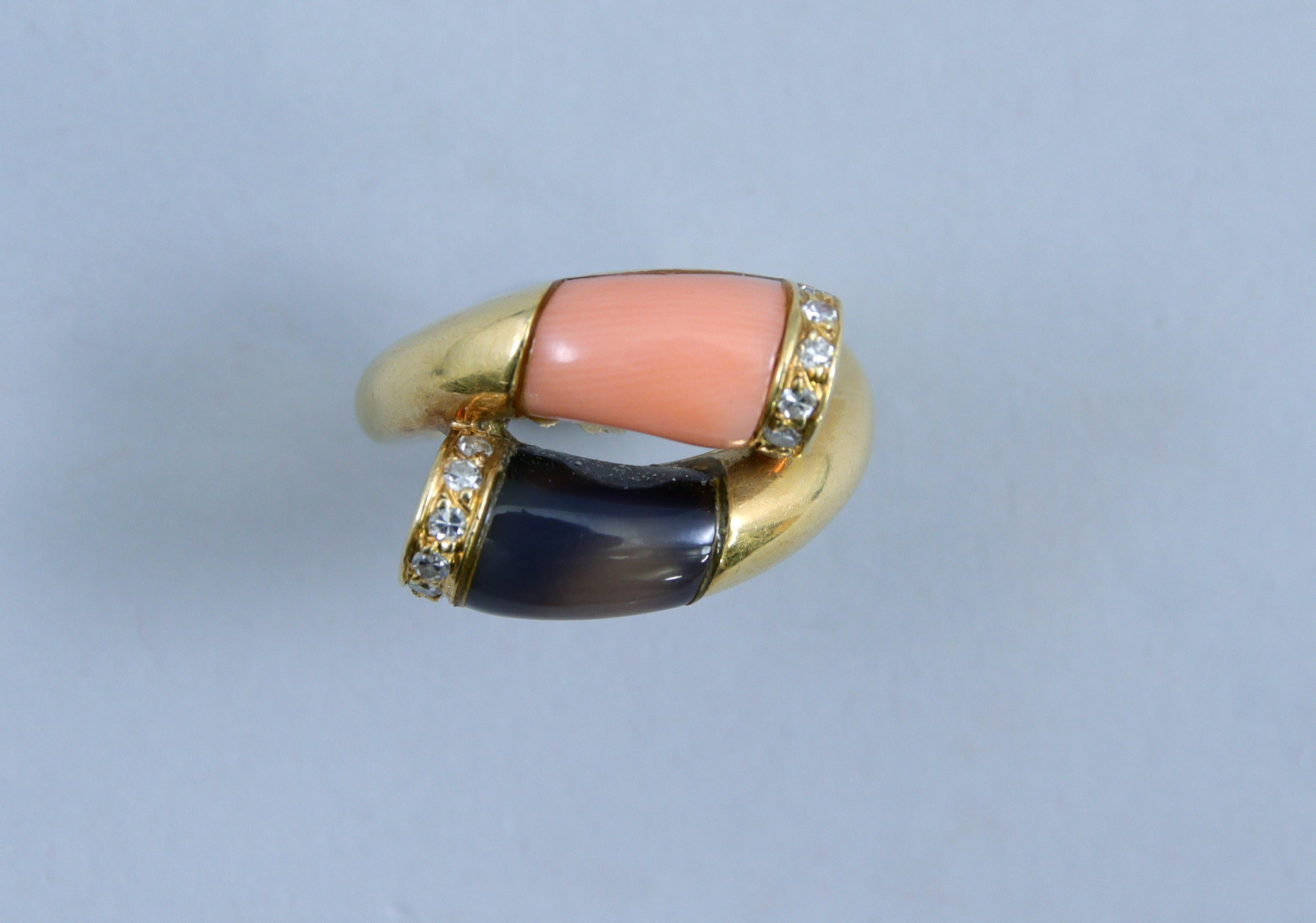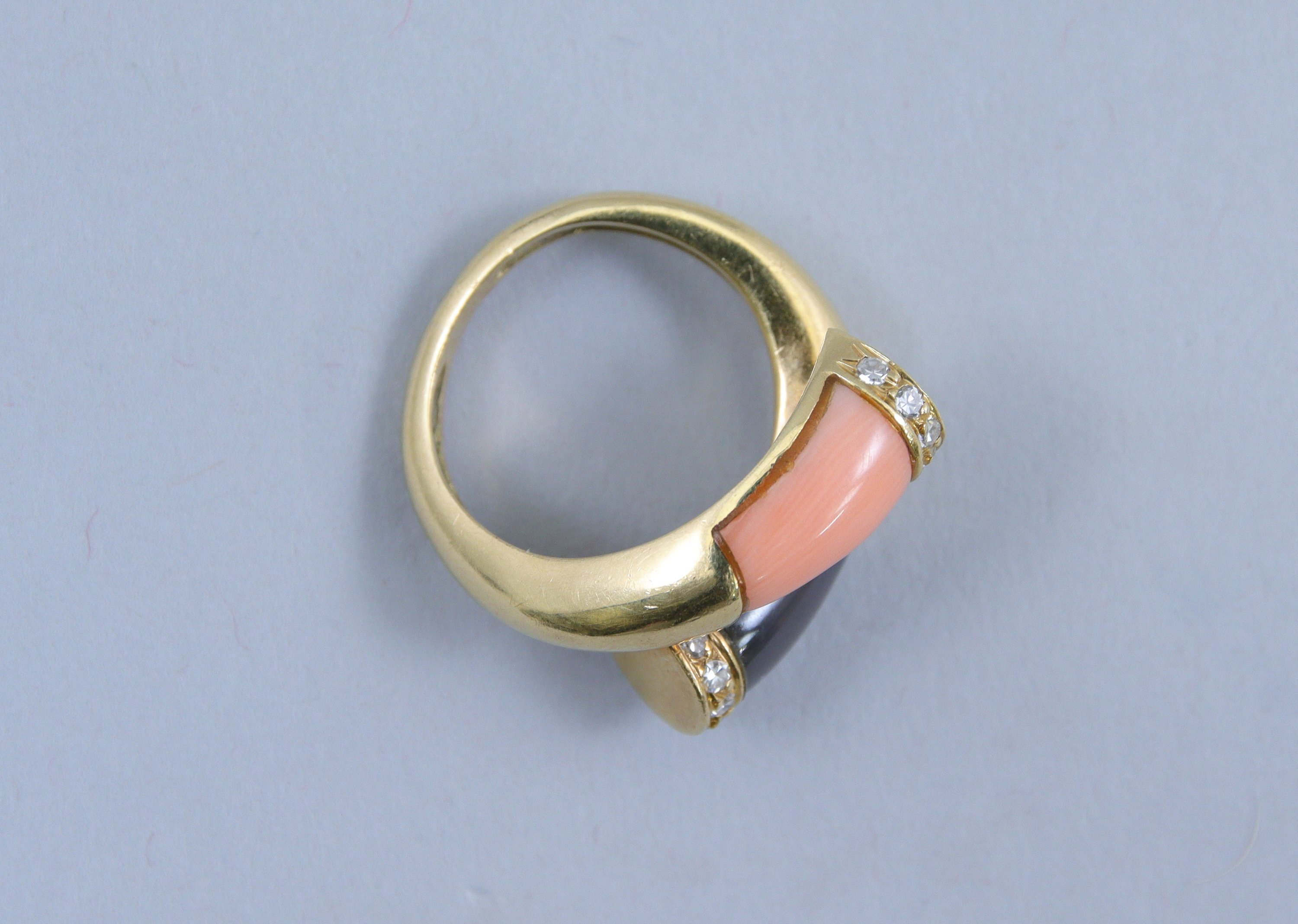 en or jaune 750 millièmes, le centre décoré de deux motifs bombés en pierre ornementale entre des petites lignes de diamants ronds taillés en huit-huit.