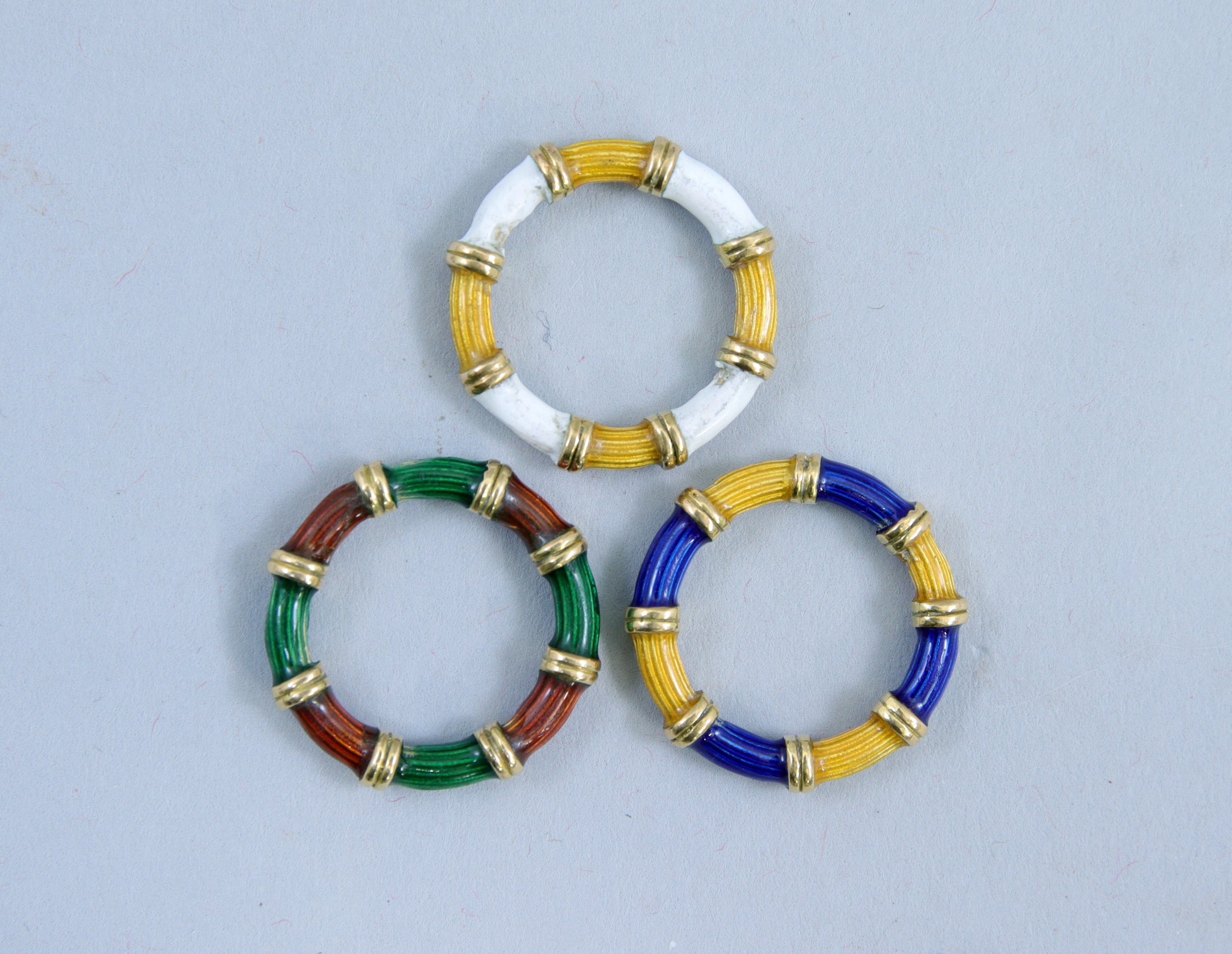en or jaune 750 millièmes, chacun partiellement émaillé en polychromie.