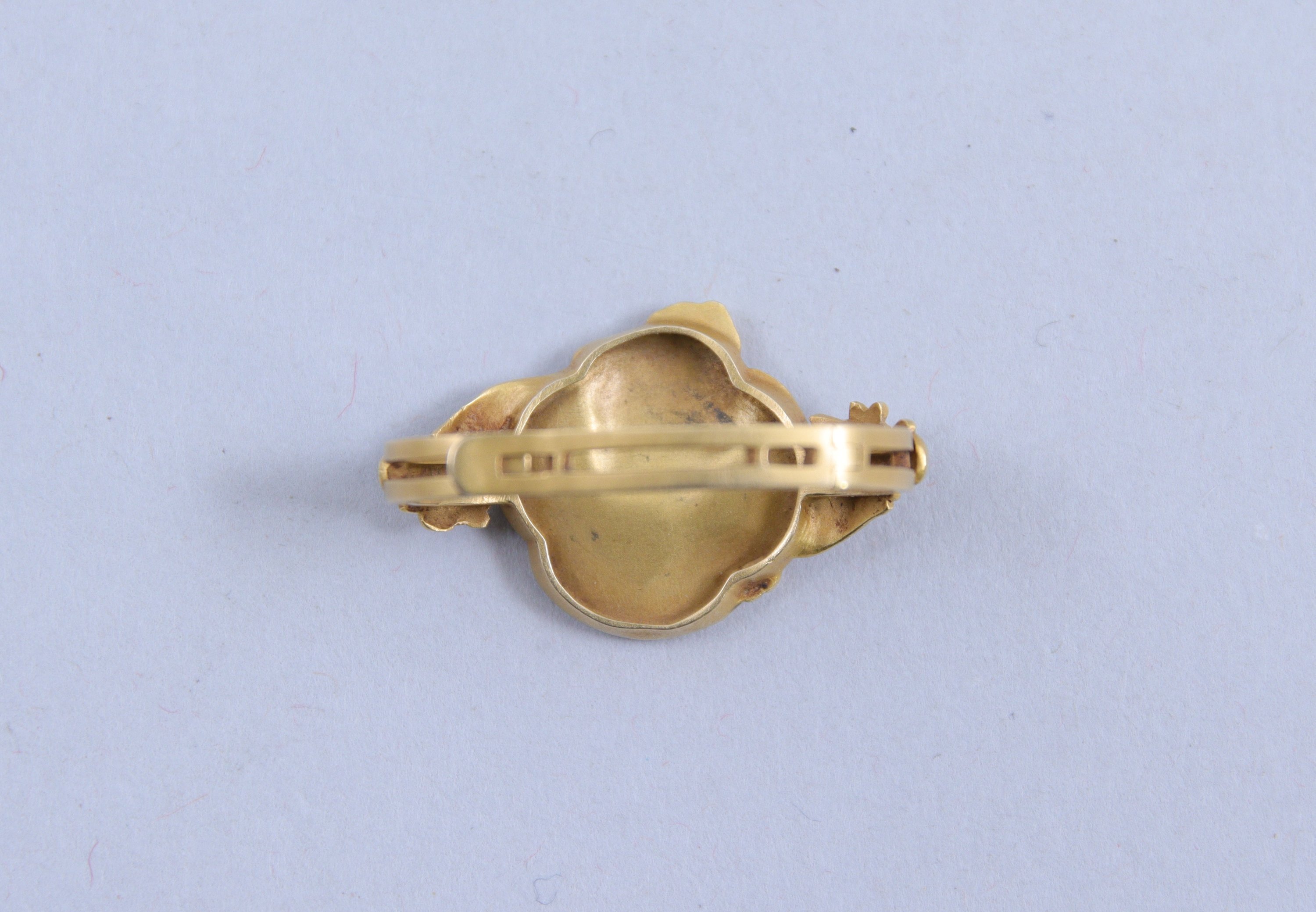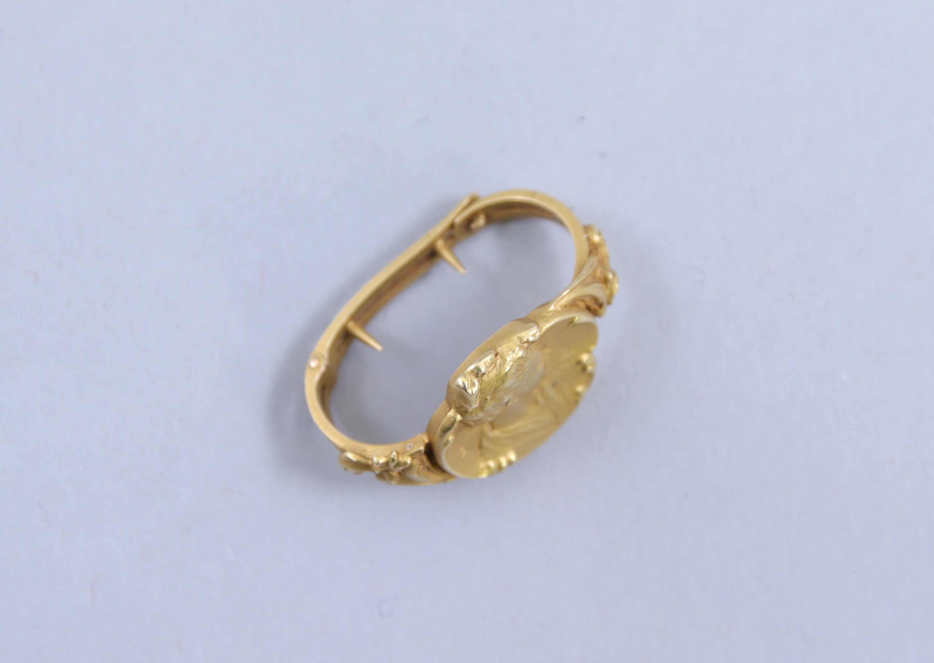 en or jaune 750 millièmes, décorée d'un profil de jeune femme au chignon, dans un entourage de bouquets.