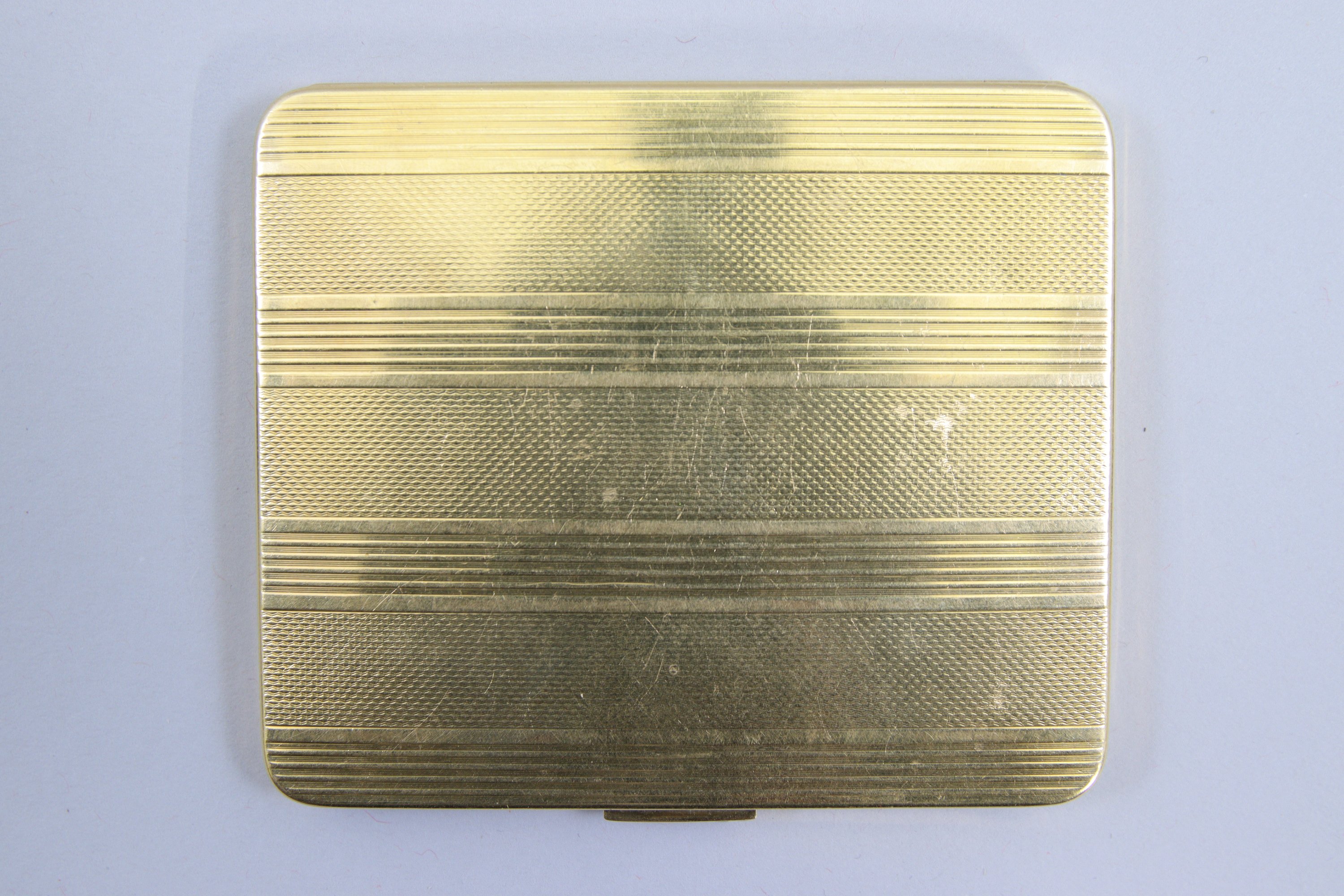 en or jaune 750 millièmes, à décor gravé et guilloché de cannelures et petites vaguelettes. Le bouton poussoir orné de six pierres noires.