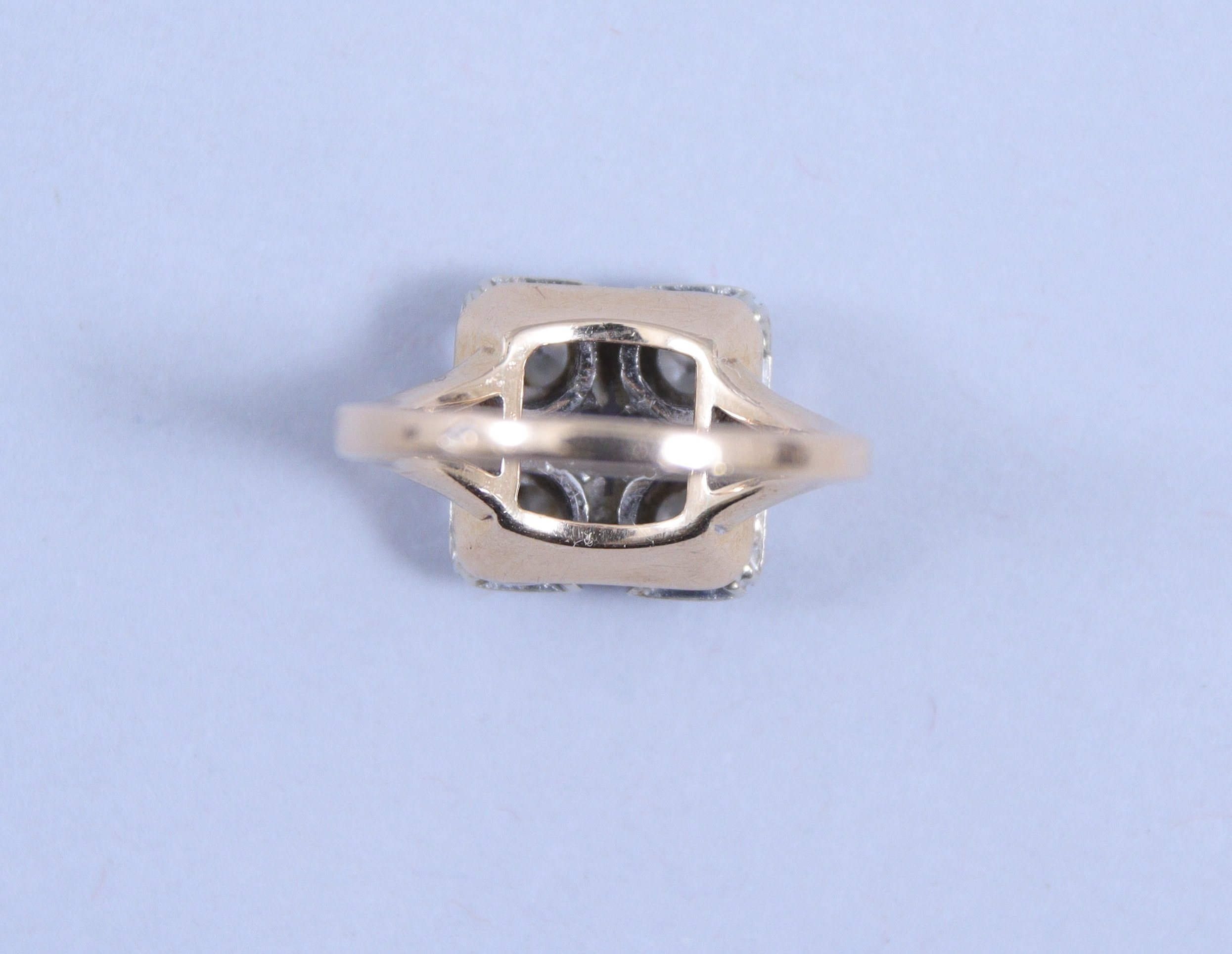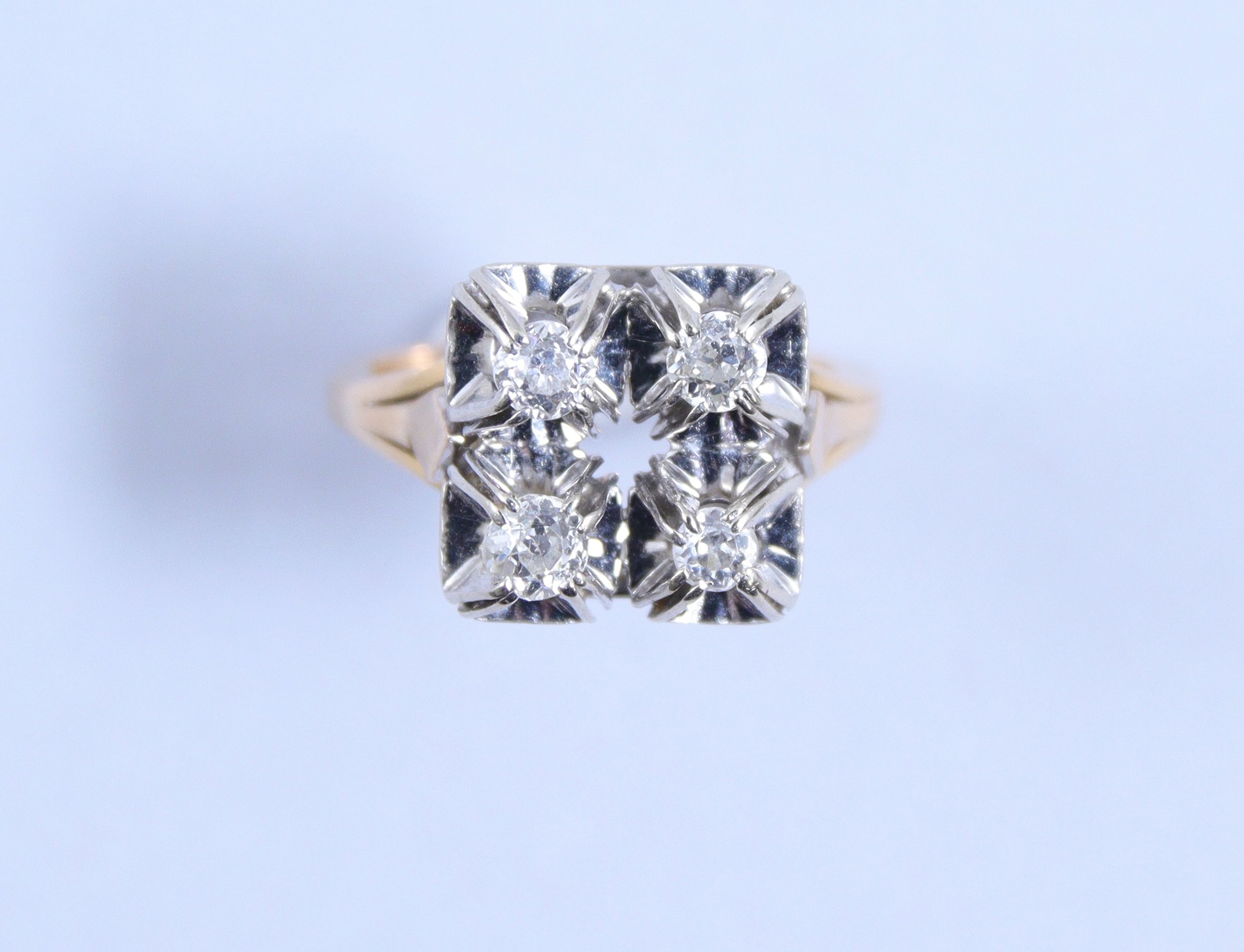 en or jaune 750 millièmes et or gris ou platine, dont le plateau de forme carrée est orné de quatre diamants d'environ 0,05 carat chacun.