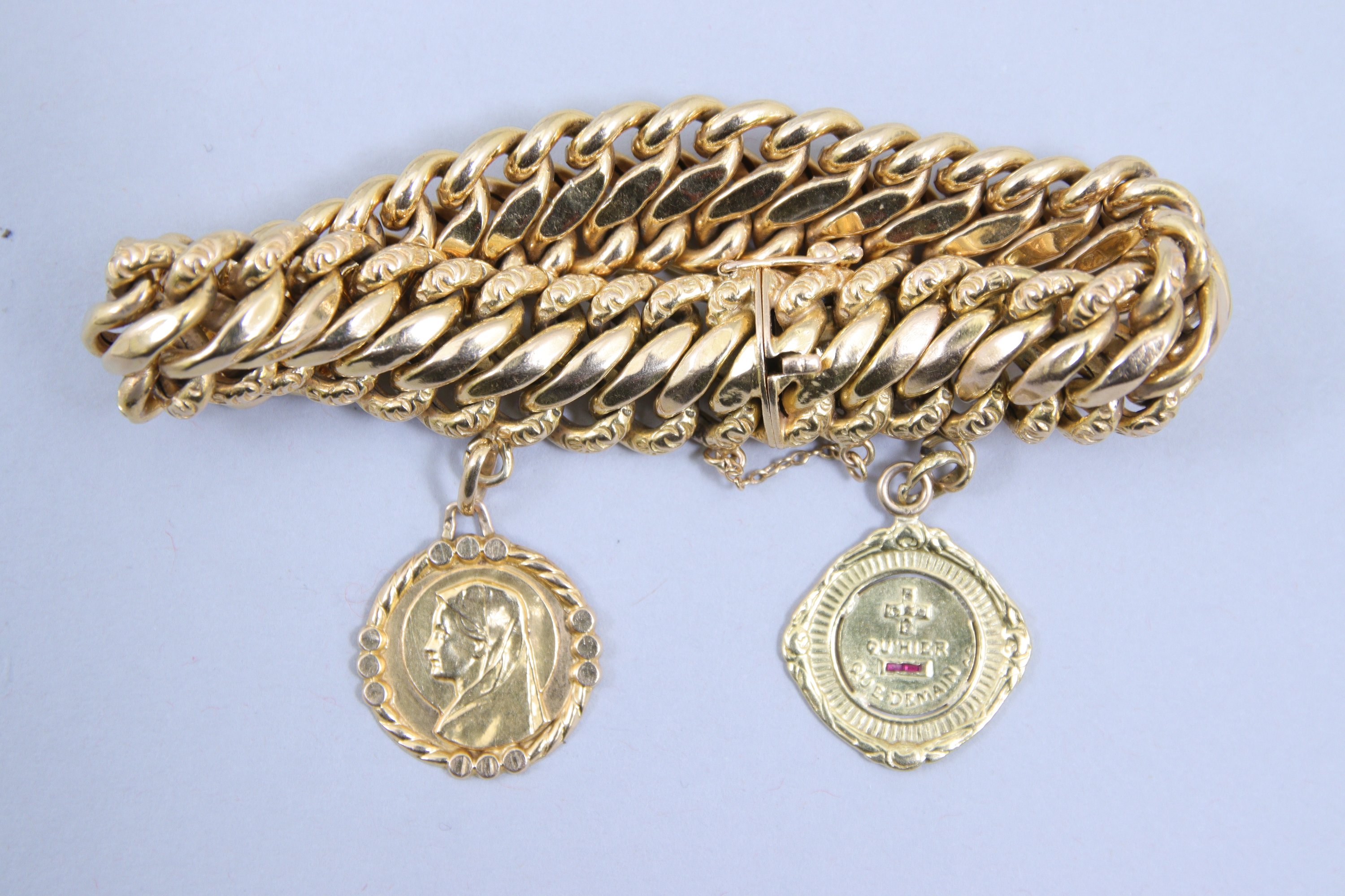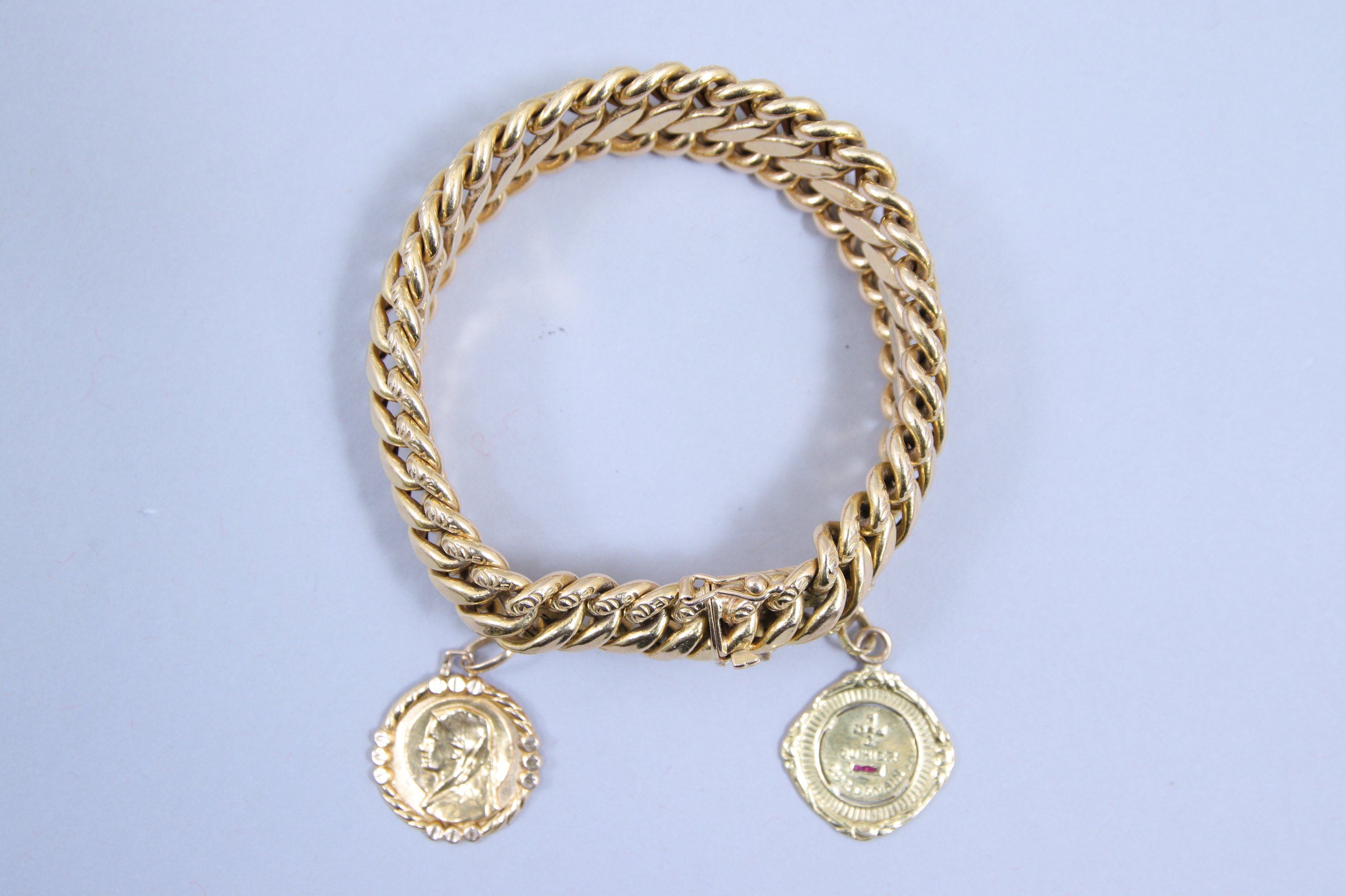 en or jaune 750 millièmes à larges mailles américaines orné de deux médailles en pendeloque: une vierge et une "+ qu'hier - que demain".