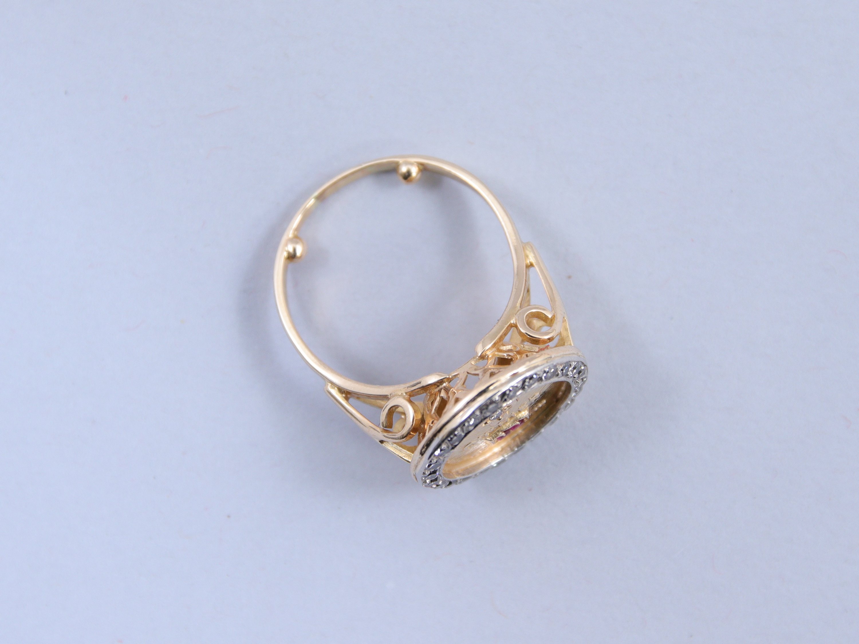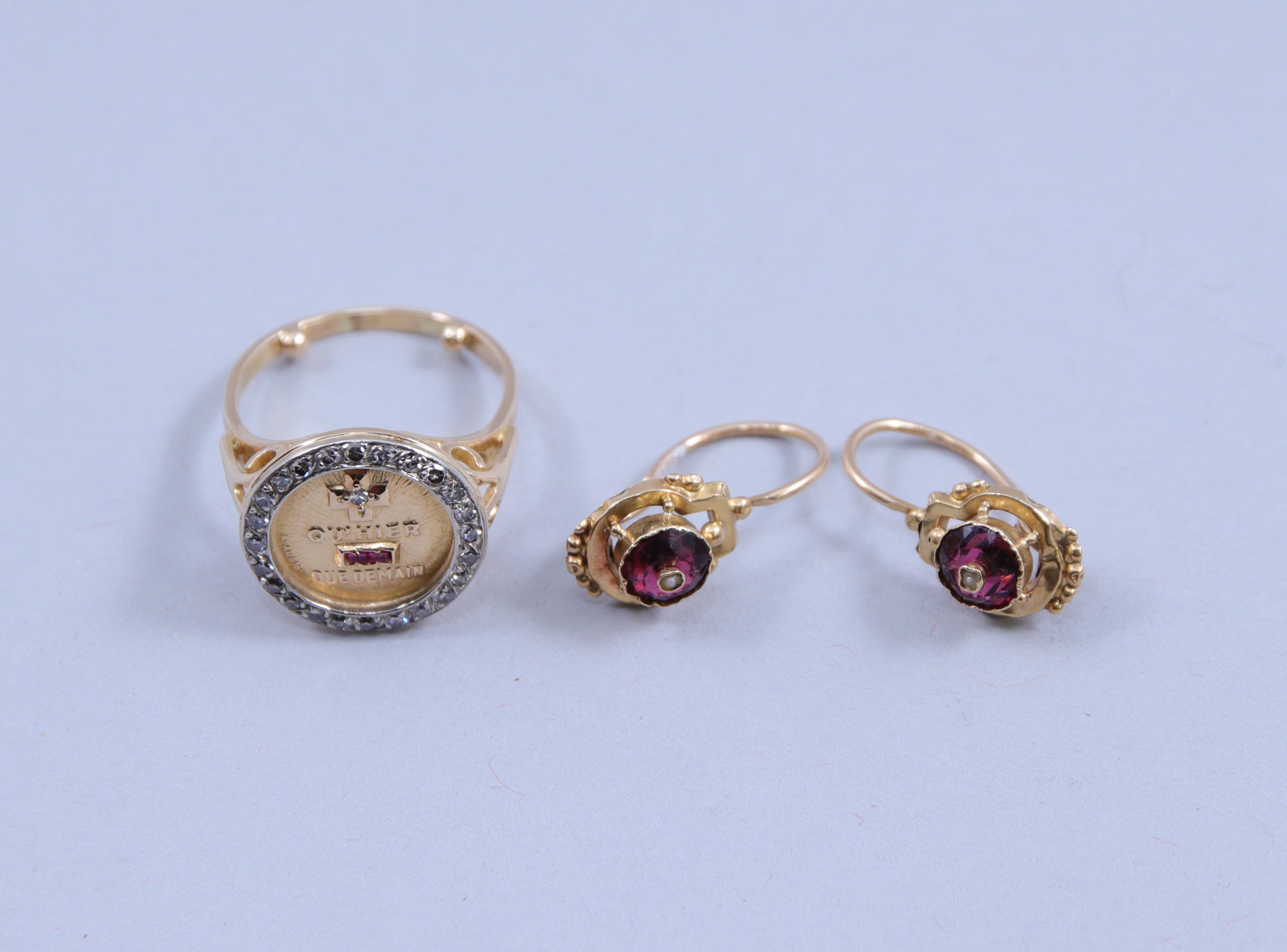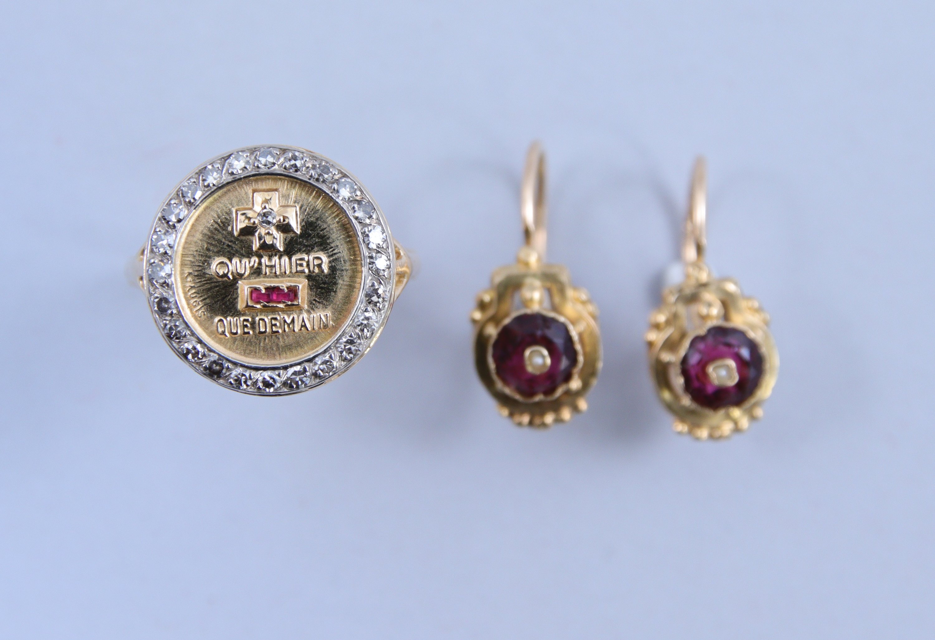 en or jaune 750 millièmes et rubis ou grenat. La bague présentant un chaton avec la mention "+ qu'hier - que demain" dans un entourage de pierres blanches.