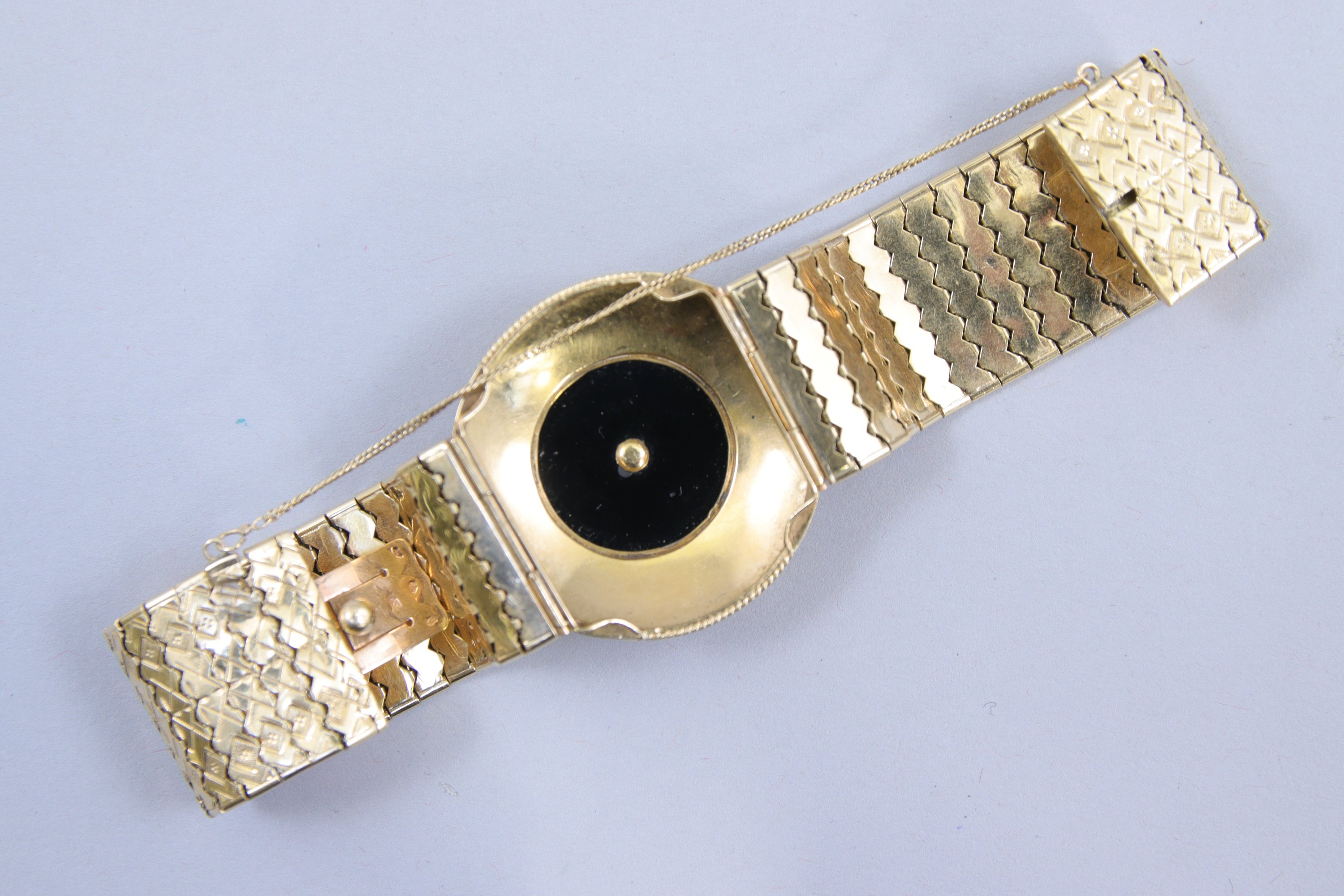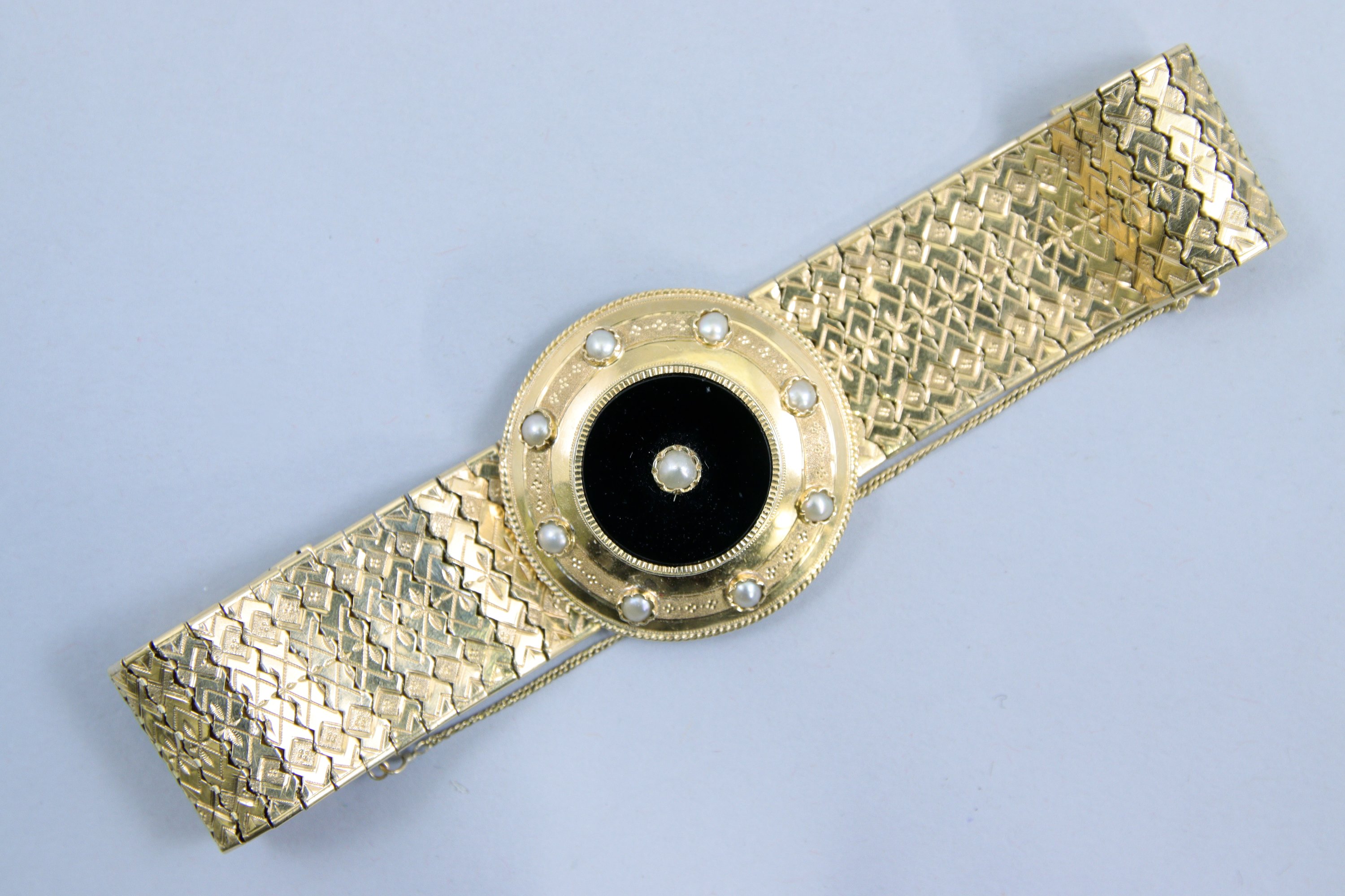 en or jaune 750 millièmes à mailles articulées orné en son centre d'un onyx de forme circulaire et semis de perles.