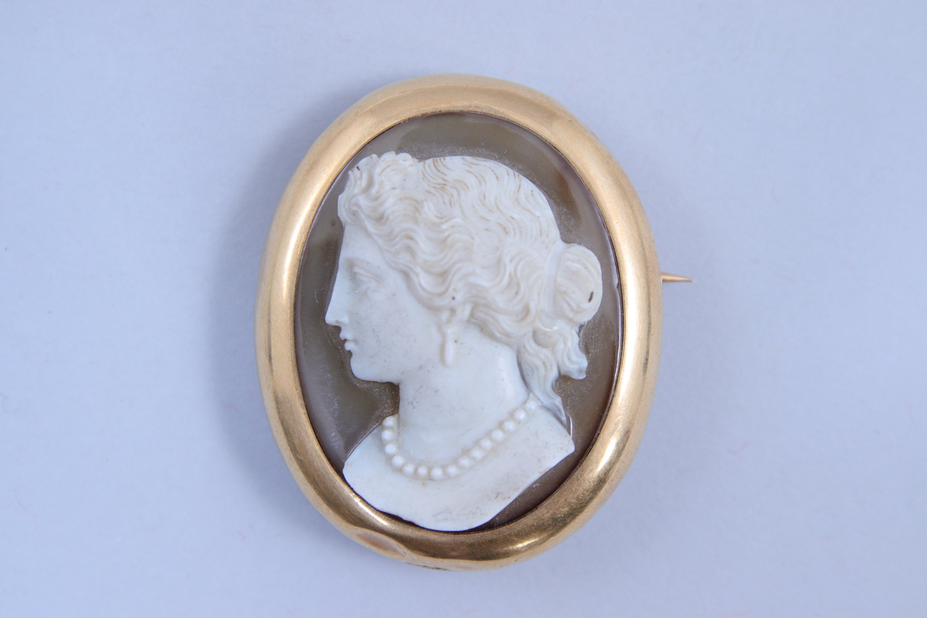 au profil de femme à l'antique tournée vers la gauche. Signé "Piler" (?). Monté en broche en or jaune 750 millièmes.