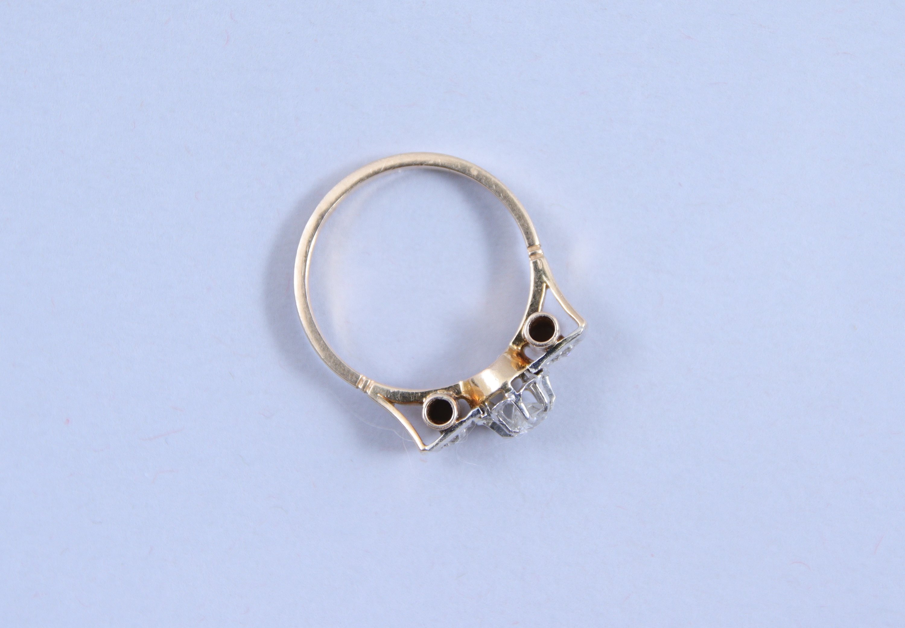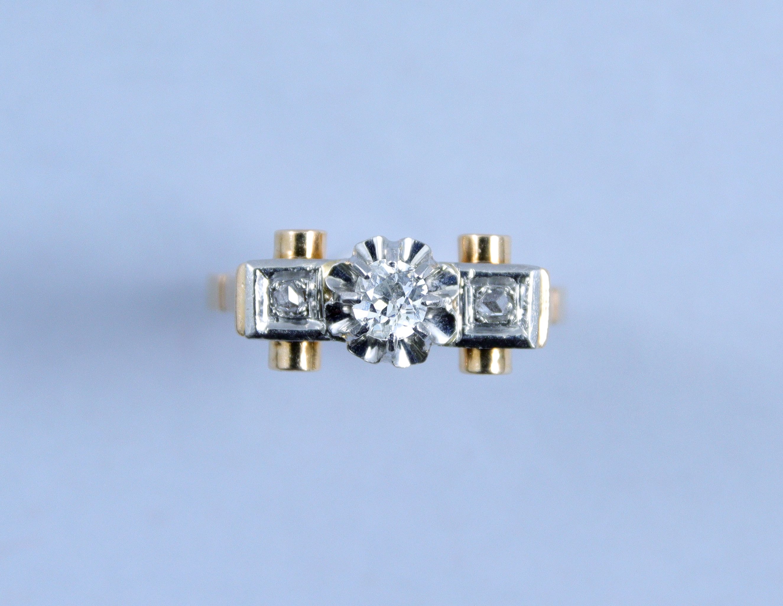 en or jaune 750 millièmes ornée de trois diamants montés en ligne, le diamant central sur des griffes.
