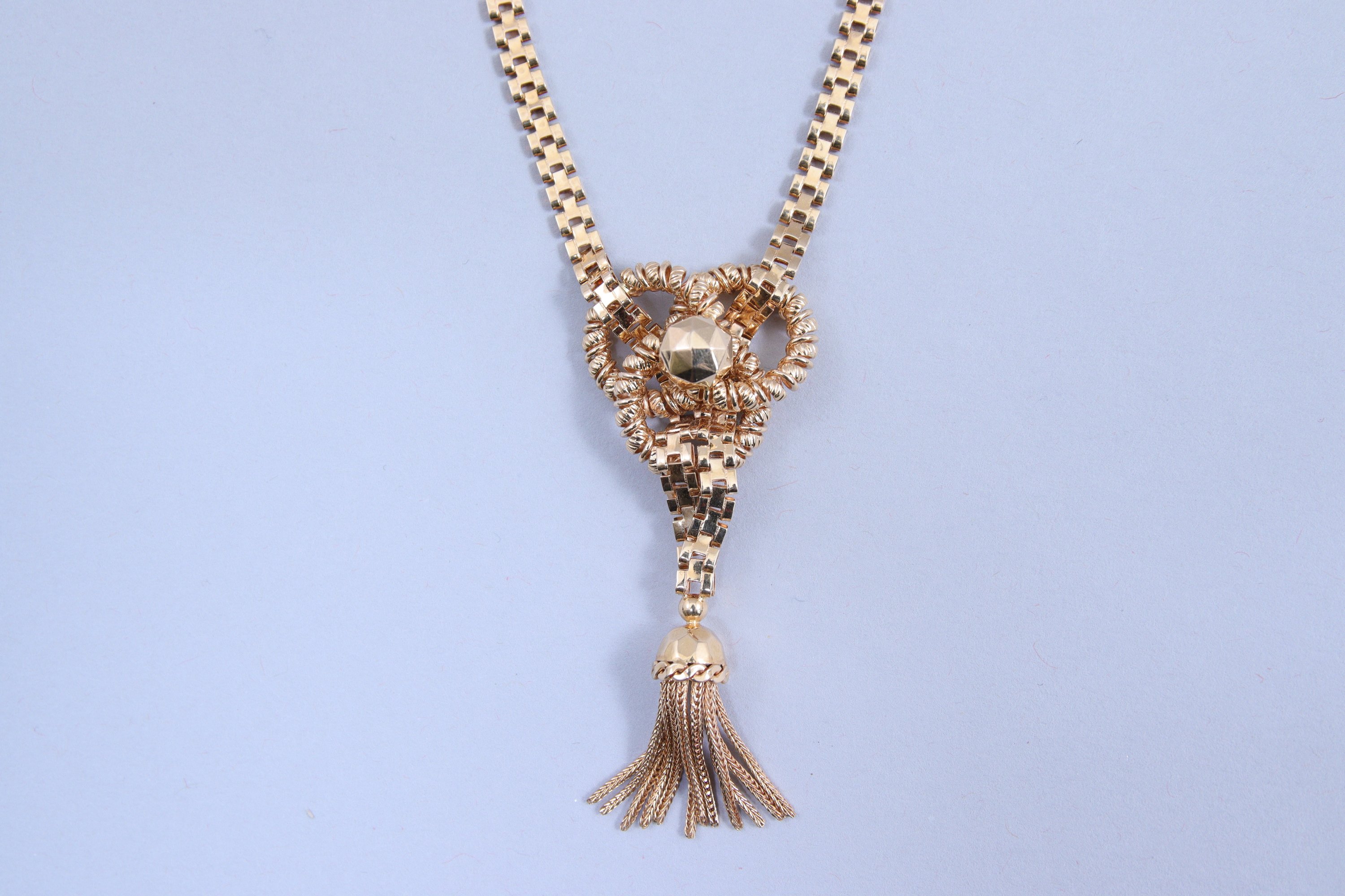 en or jaune 750 millièmes, le nud en or tressé terminé par un pompon et le collier à petites mailles tank plates. Chainette de sécurité.