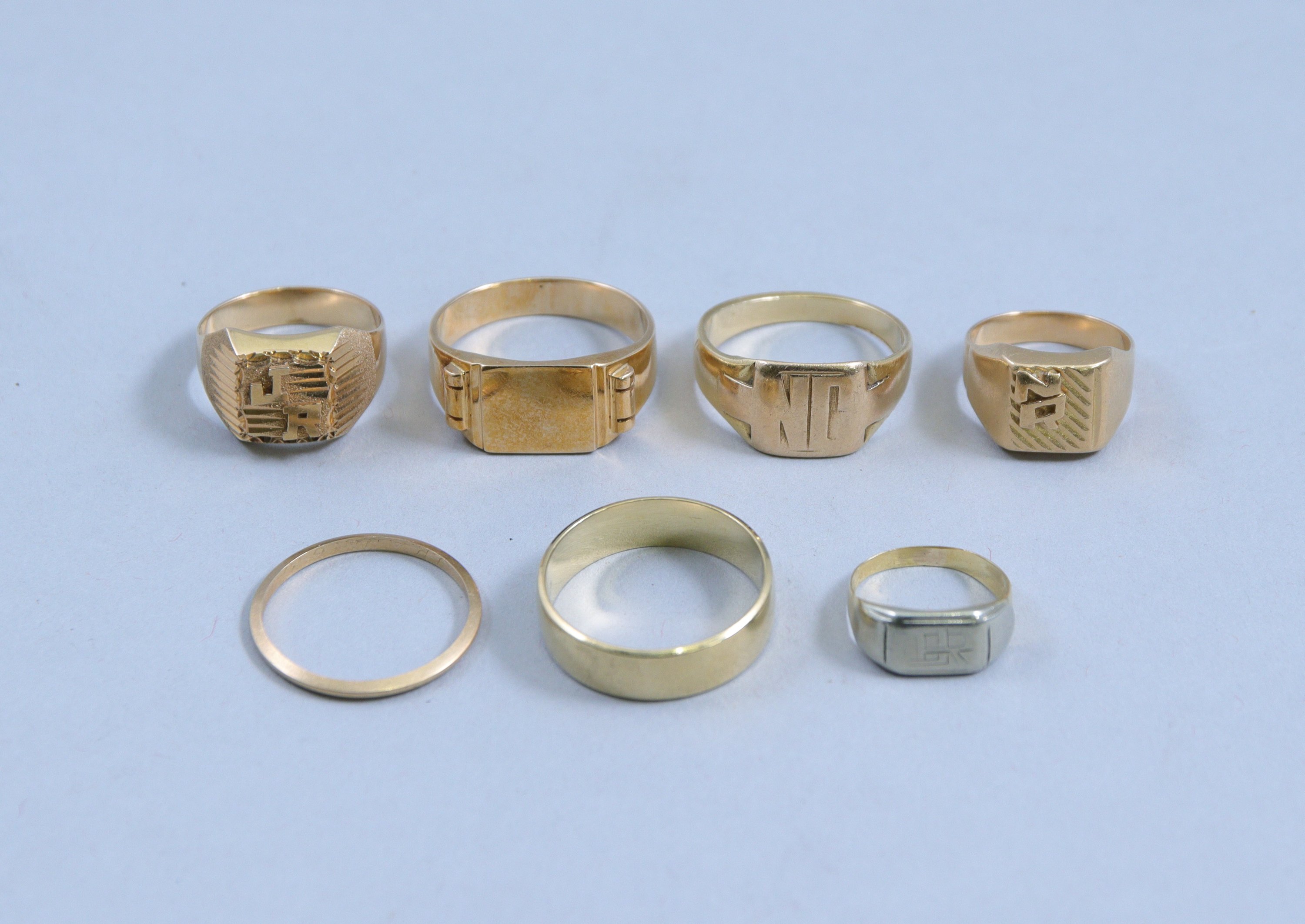 Cinq chevalières et deux alliances en or jaune 750 millièmes.Poids...